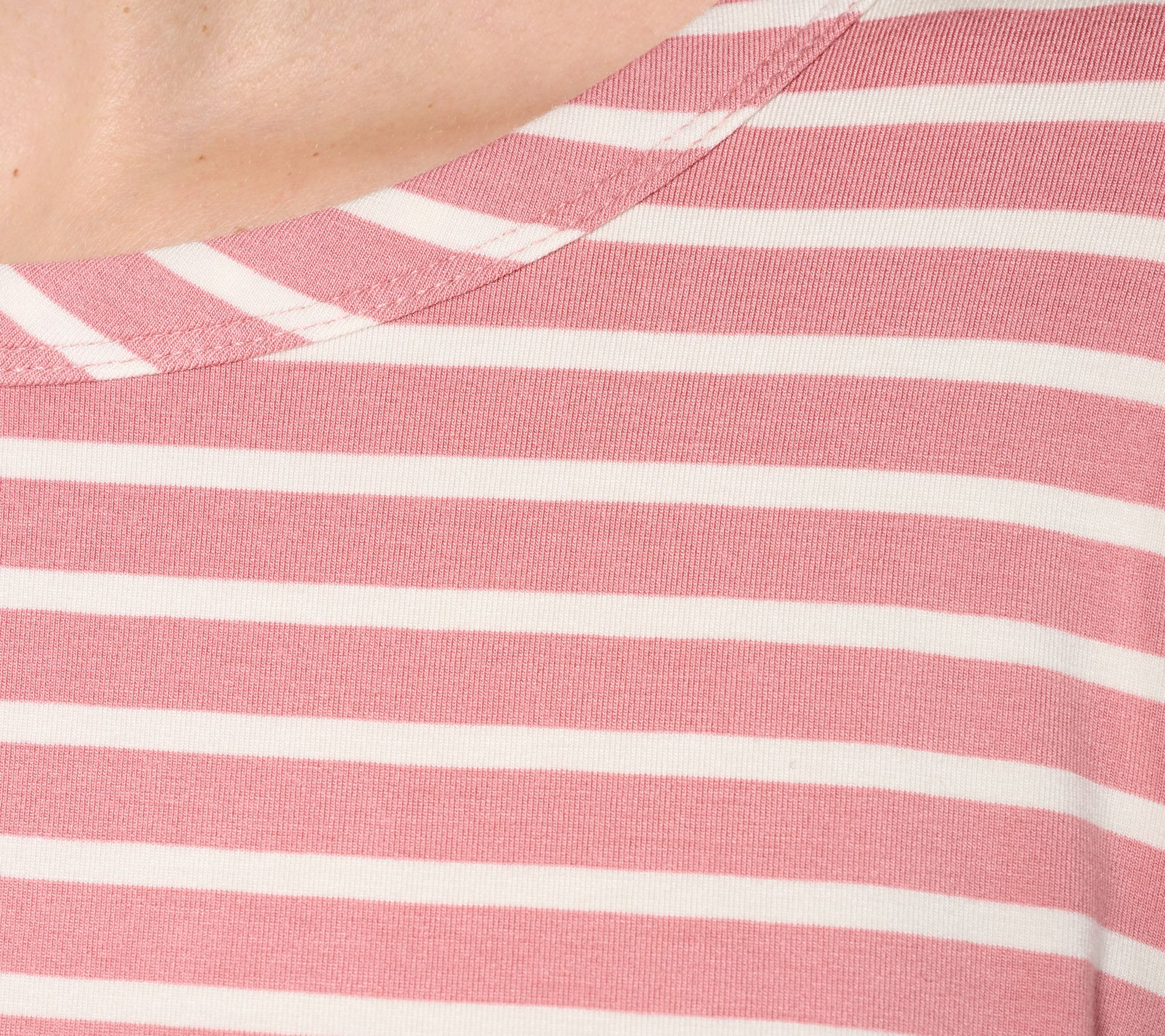 • Features: crew neck, striped body, bias stripe neckline, solid-color sleeves