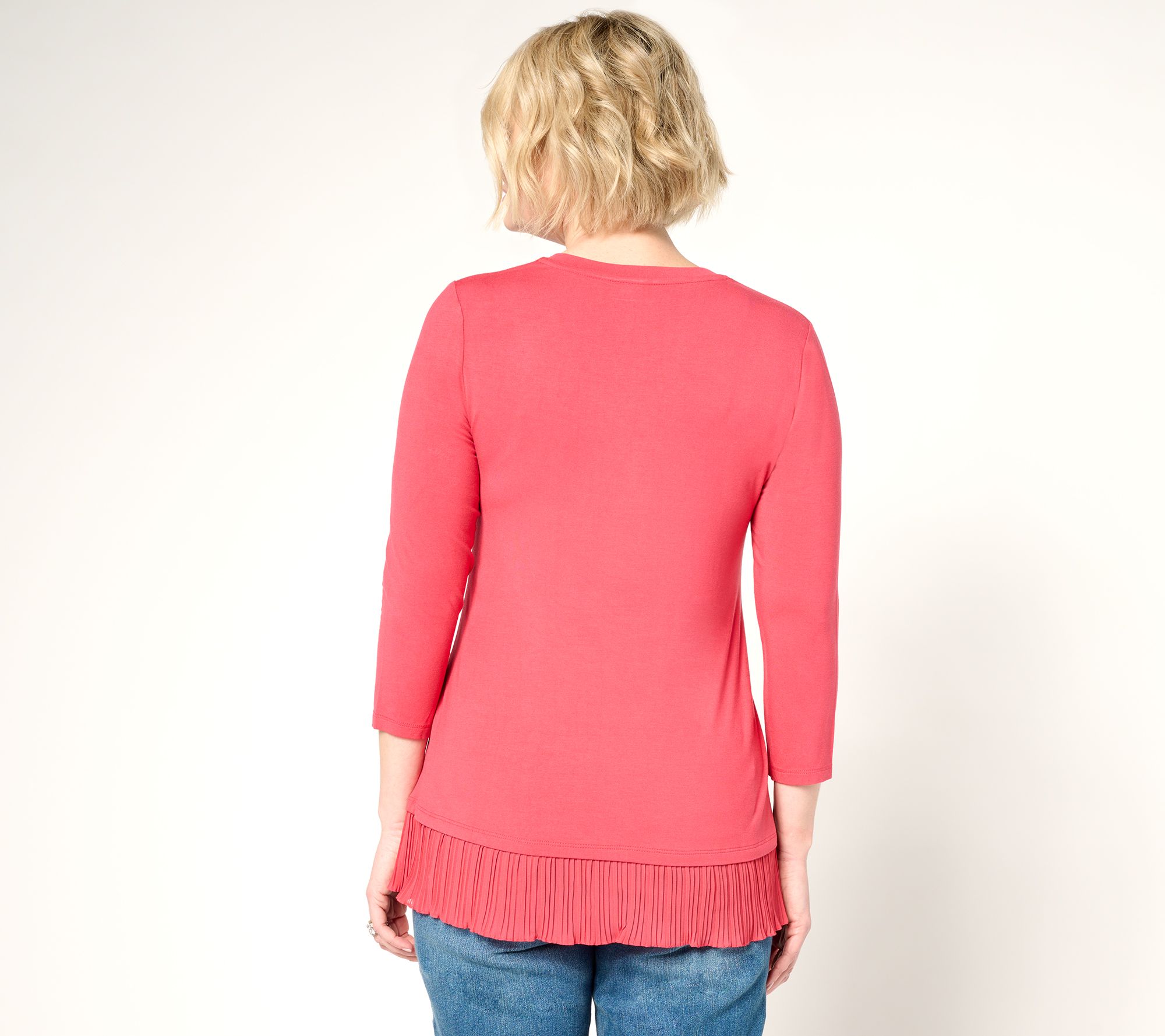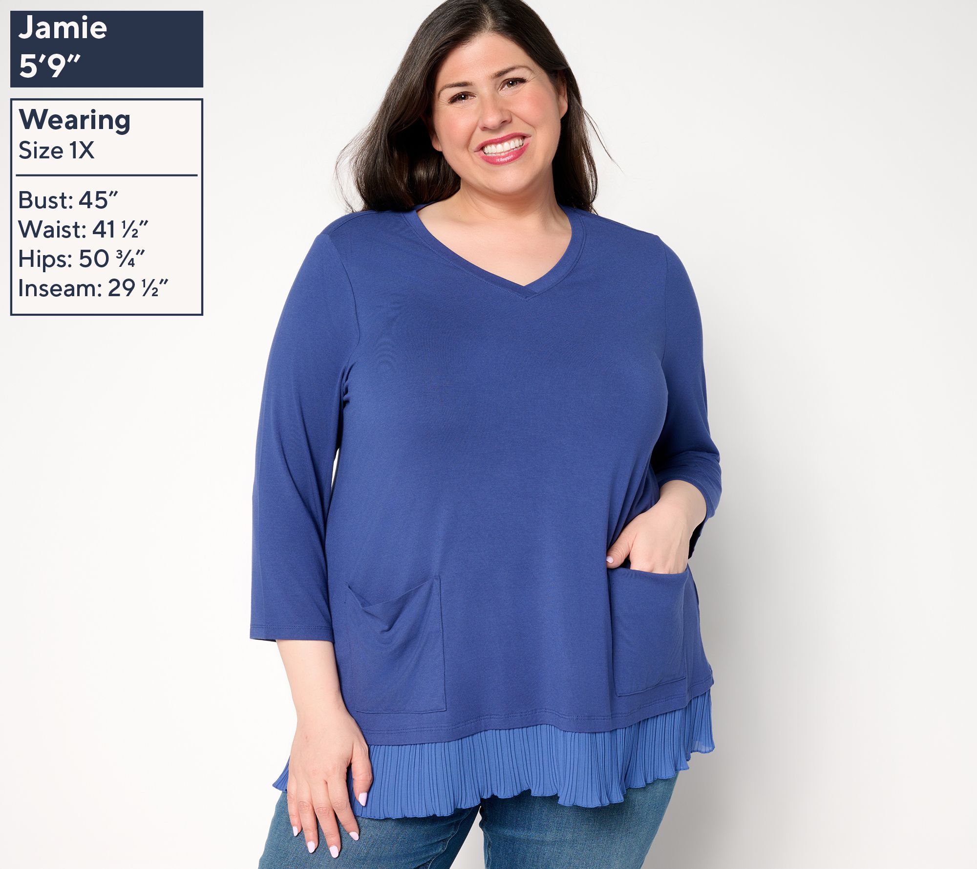 • Features: V-neckline, 3/4-length sleeves, pleated lace hem, pockets