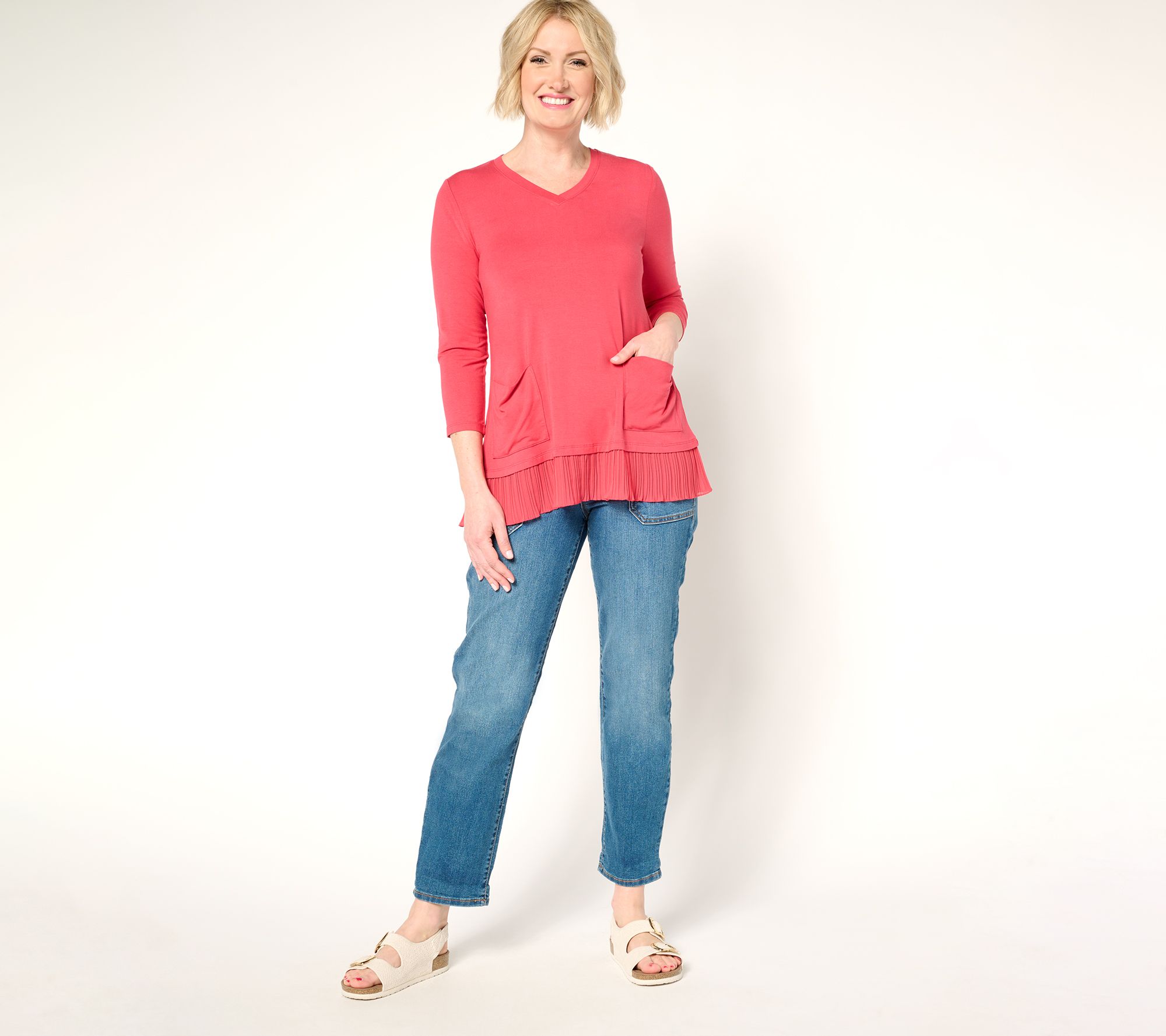 Make a stylish statement -- yet feel comfy enough to chase the pets or kids -- in knit top with a sweetly trimmed ruffle hem. Front pockets let you keep essentials close. From LOGO by Lori Goldstein®.