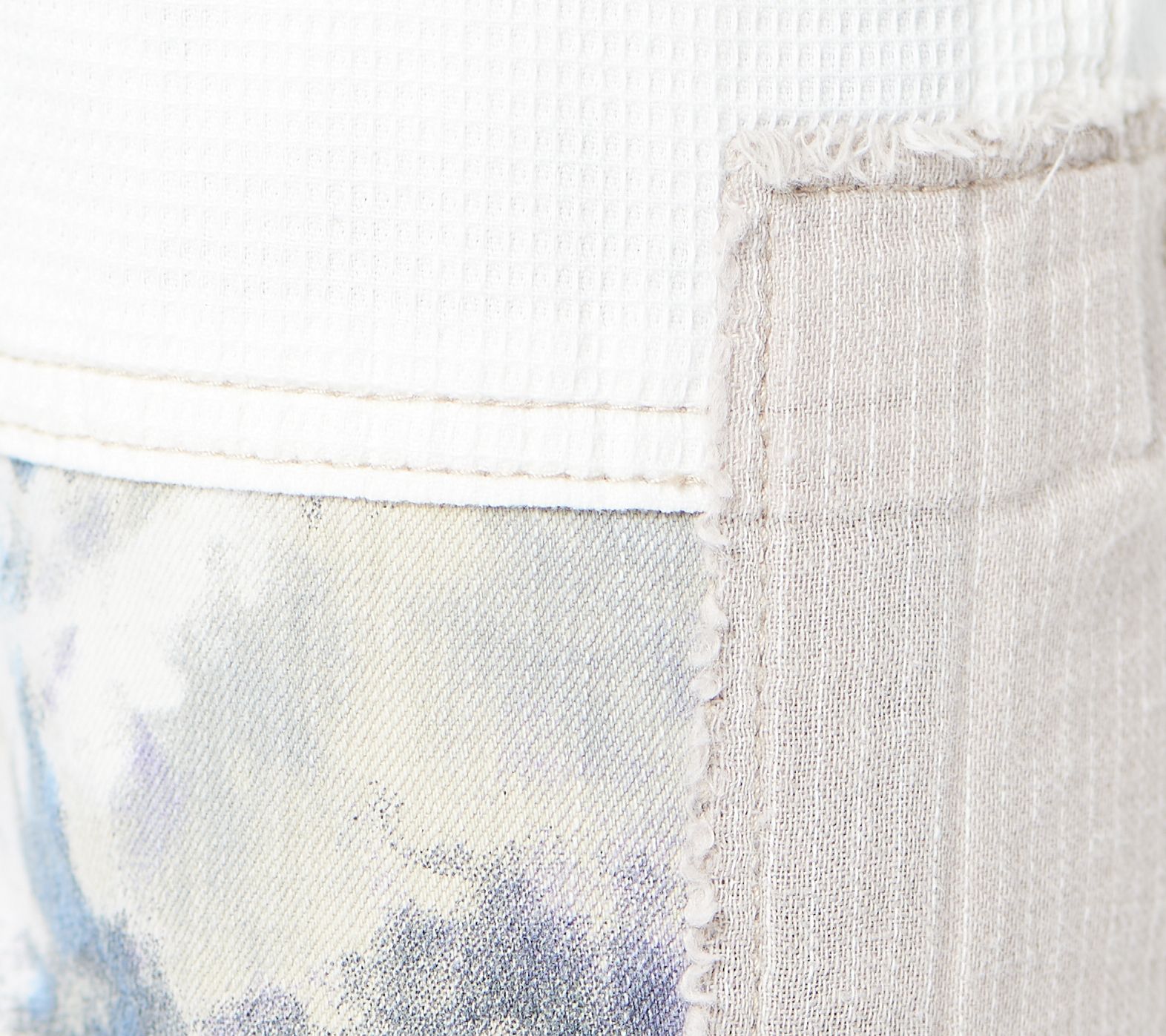 • Features: five-pocket styling, patchwork detail, whiskering at thigh, adjustable rolled cuffs