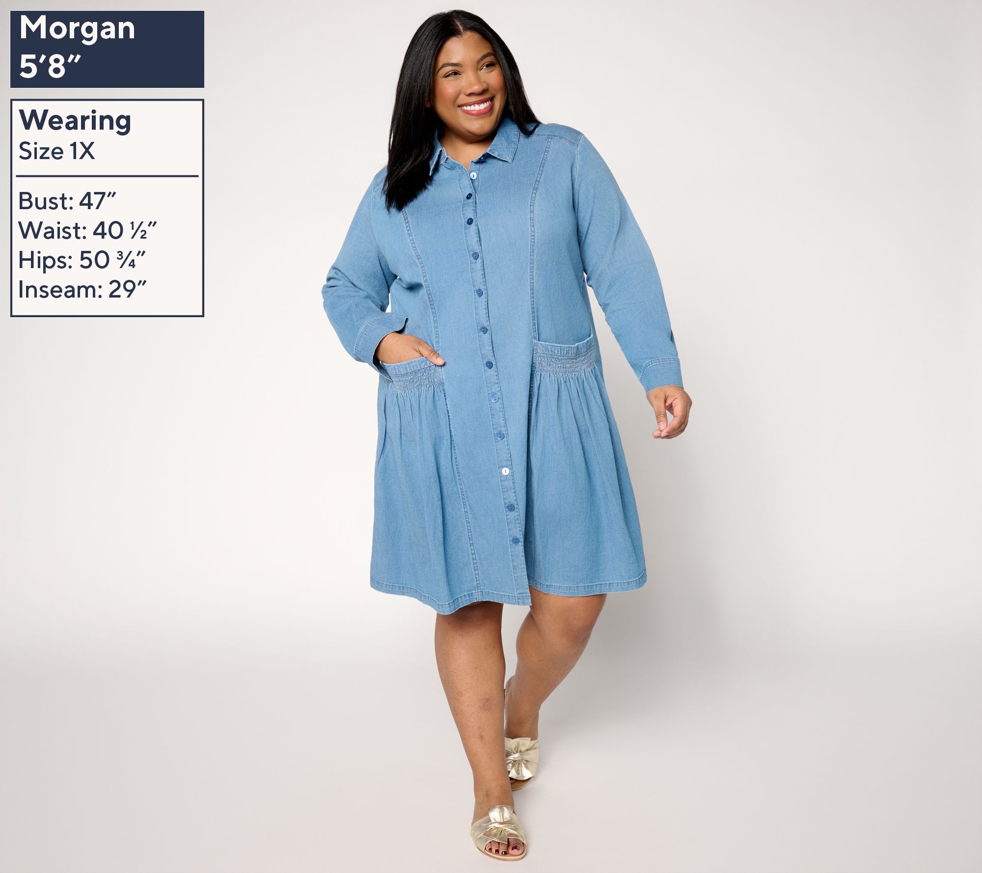 Easy mornings or spontaneous weekend plans pair well with a chambray shirt dress that offers a laid-back vibe and generous comfort. Smart details like a button-front and sweetly smocked welt pockets combine practicality with timeless style, making it a versatile choice whether you're heading out for errands or catching up with friends. From LOGO by Lori Goldstein®.