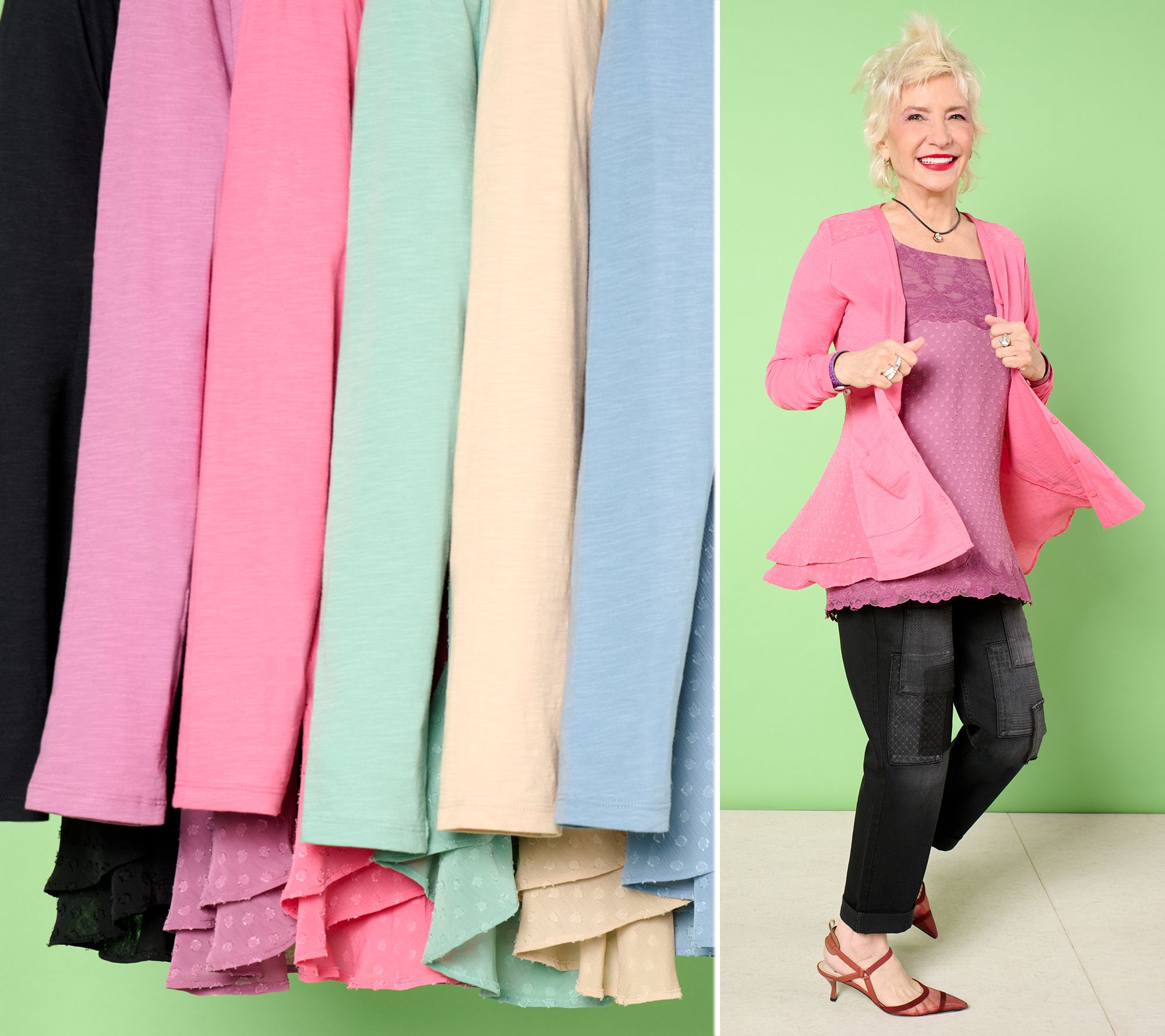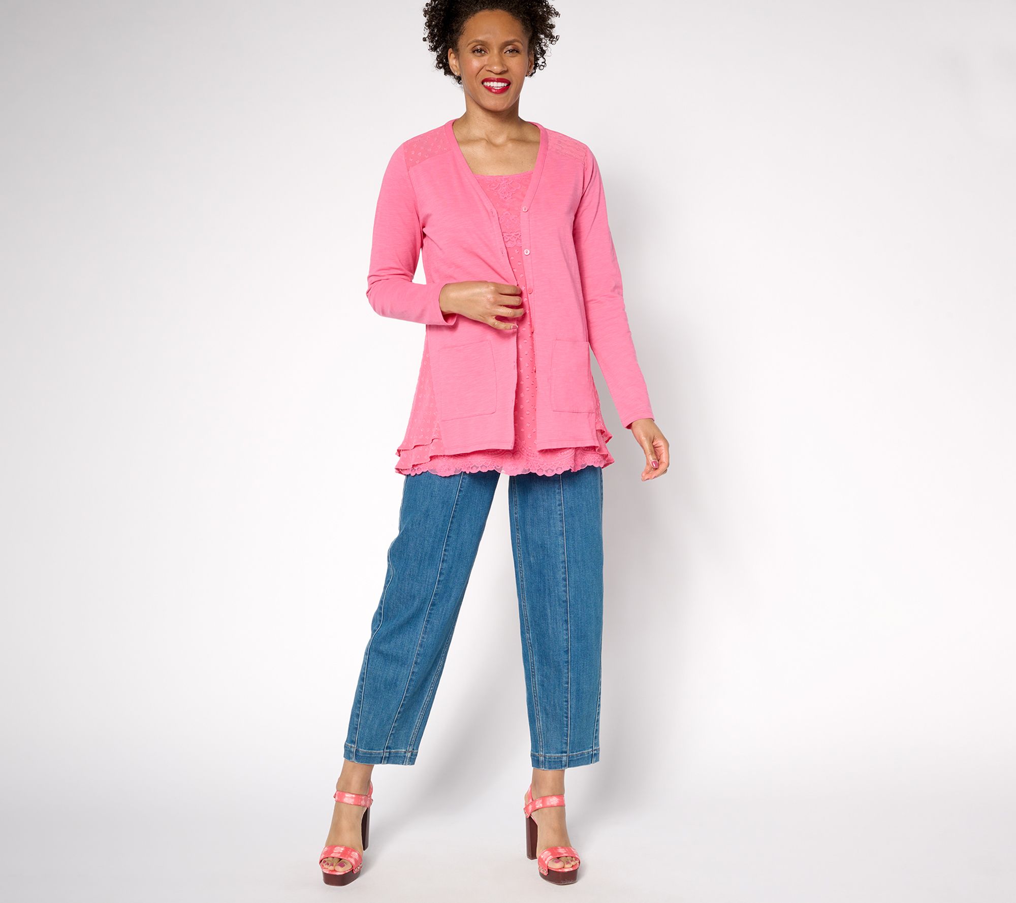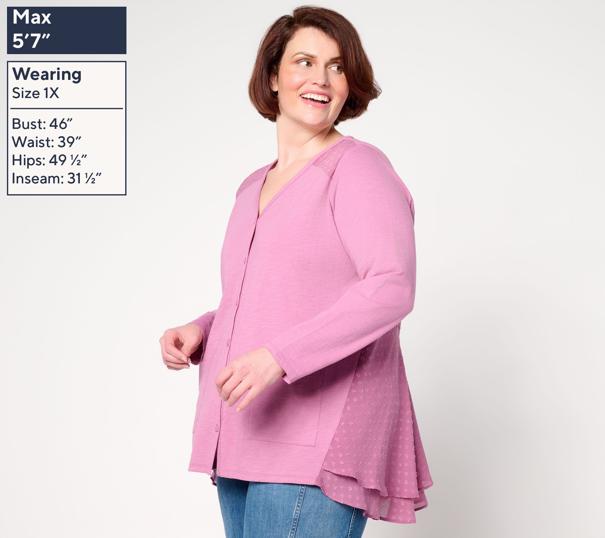 Crafted in a slub knit cotton (so right for summer breezes), it softly layers over tees and tanks with a relaxed vibe, adding practicality with its perfectly positioned pockets. But a quick turnaround reveals a total shift in attitude -- and a masterclass in proportion and play. A decidedly more feminine flounce in back features a two-layer peplum with ruffled clip-dot chiffon, adding movement and intrigue that floats around your curves. Permission to pair with T-shirt, sleeveless, or maxi dresses -- this modern staple is yours to seamlessly blend fashion and comfort at any moment. From LOGO by Lori Goldstein®.