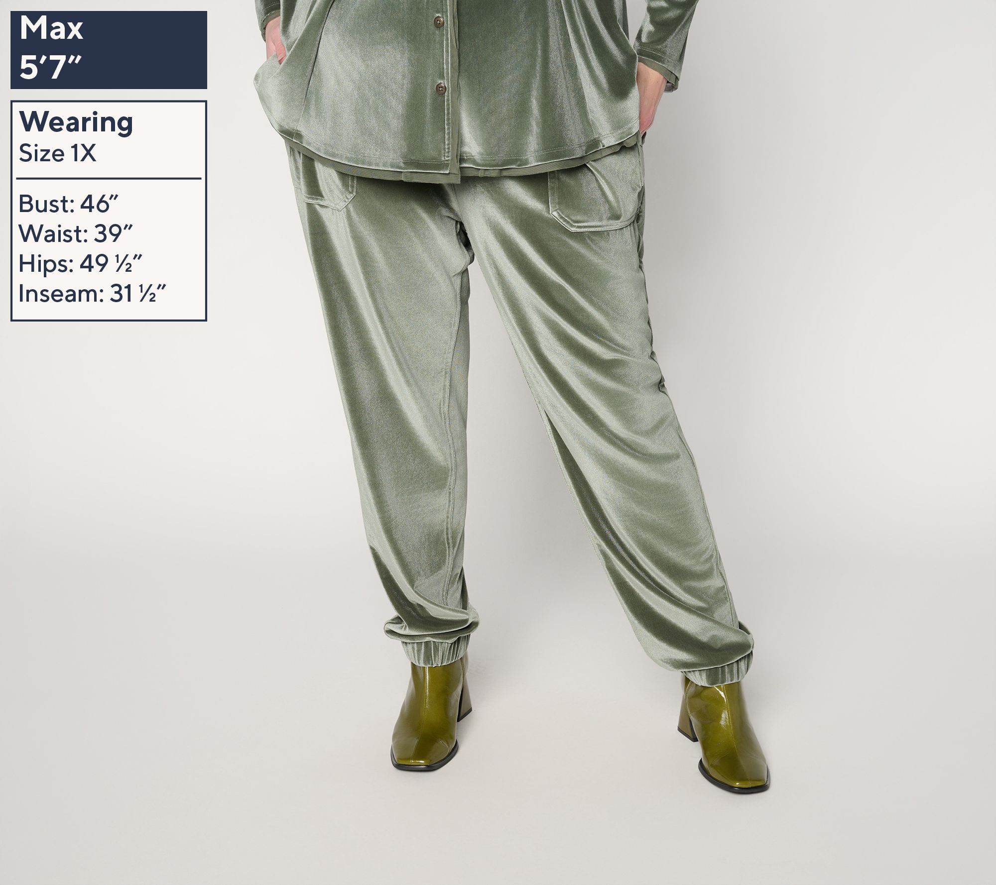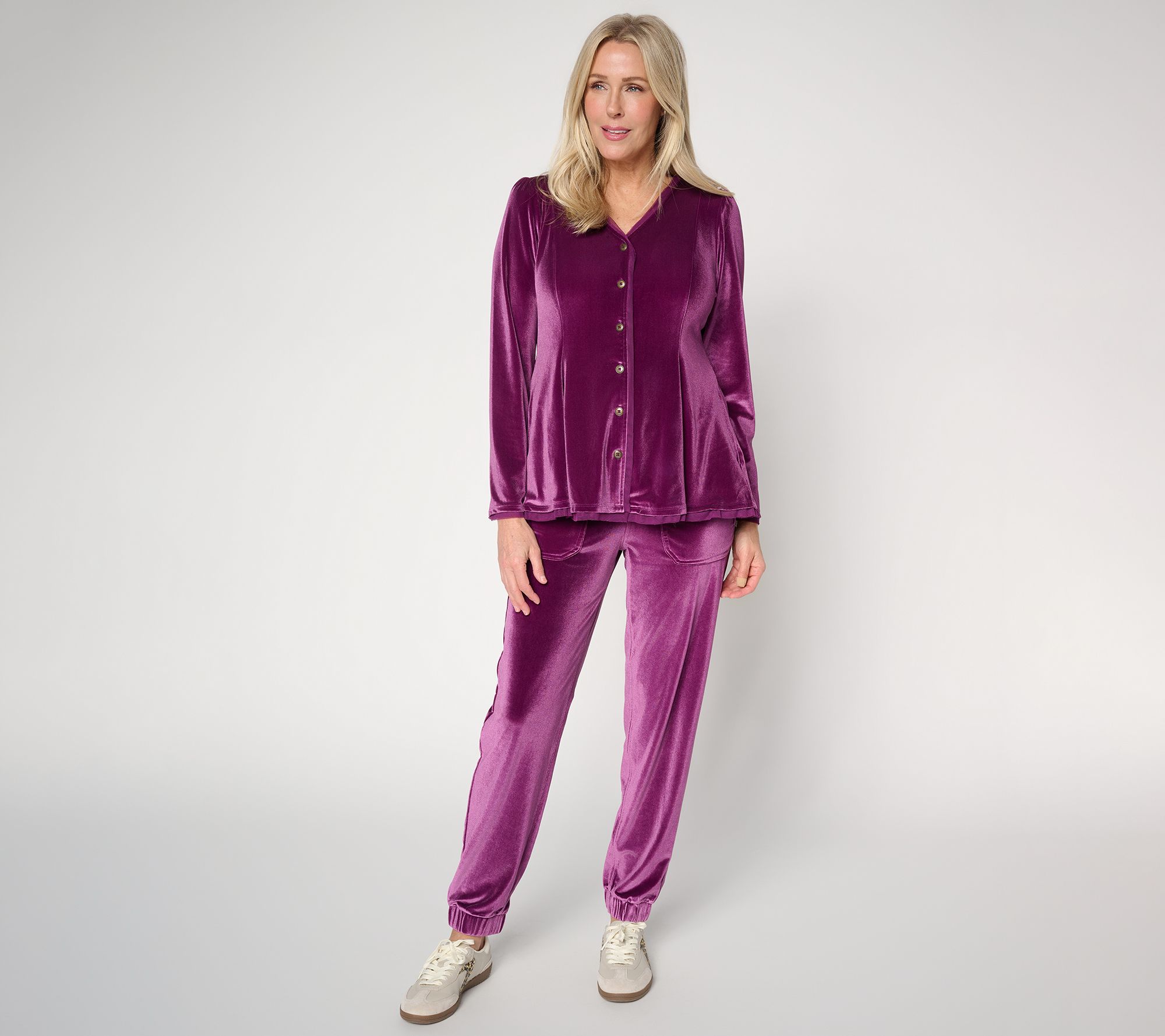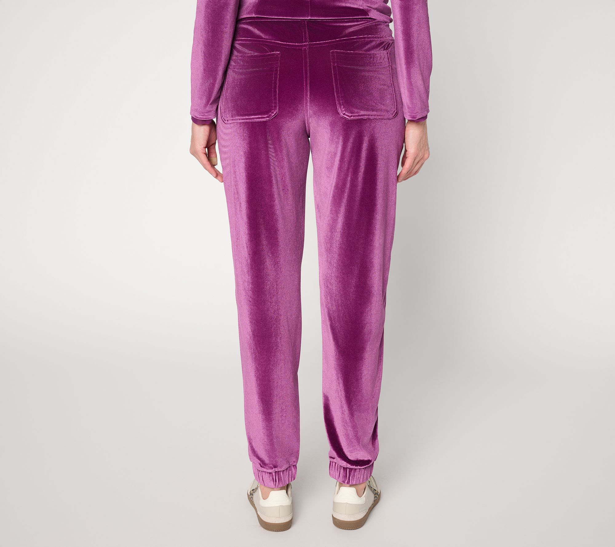 No doubt about it. Velvet season is back. Just peep this latest offering from Lori Goldstein -- an elevated jogger in a stretchy spandex blend. With softness and a subtle sheen drawing us in like a tractor beam, they're just as fab for everyday moments as they are for casual holiday soirees. Pair them with Lori's matching velvet top for a plush lounge set that's pure indulgence. Feel like turning heads? Grab these knit joggers now -- and make velvet season one for the style books. From LOGO Lavish by Lori Goldstein®.