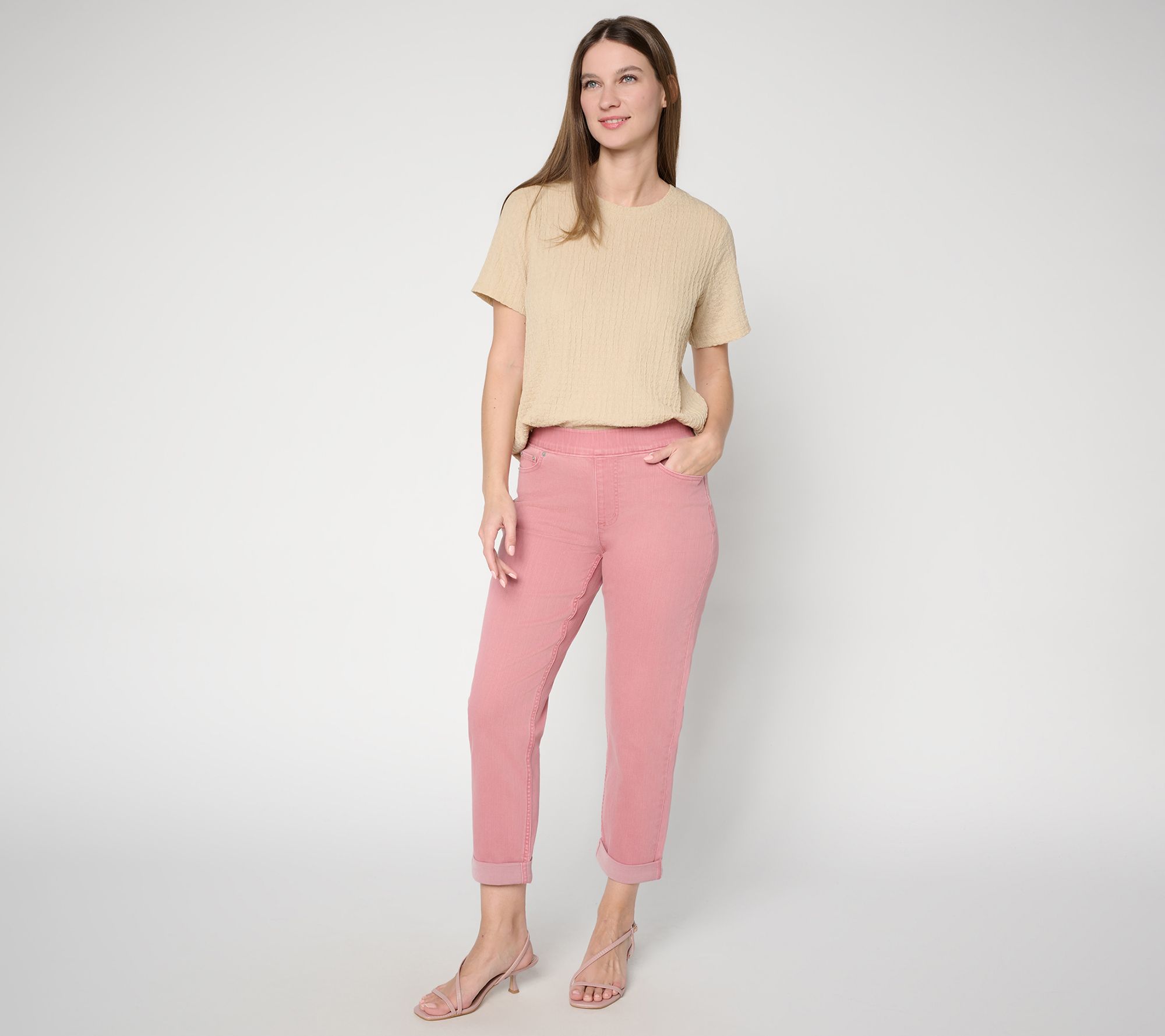 Ready to get away from one-way denim? Wear these jeans cuffed for that classic crisp look, or uncuff for an extra 3" and rock the ankle-length look. Effortless pull-on styling means you can slip these on without fuss -- no zippers or buttons. The smooth flat front creates a clean silhouette under your favorite tops -- but you still get all the pockets. As a result, these pop-on-and-go pants are perfect for appointments, your social life, or a little wanderlust. (Where are you headed to next?!) From LOGO by Lori Goldstein®.