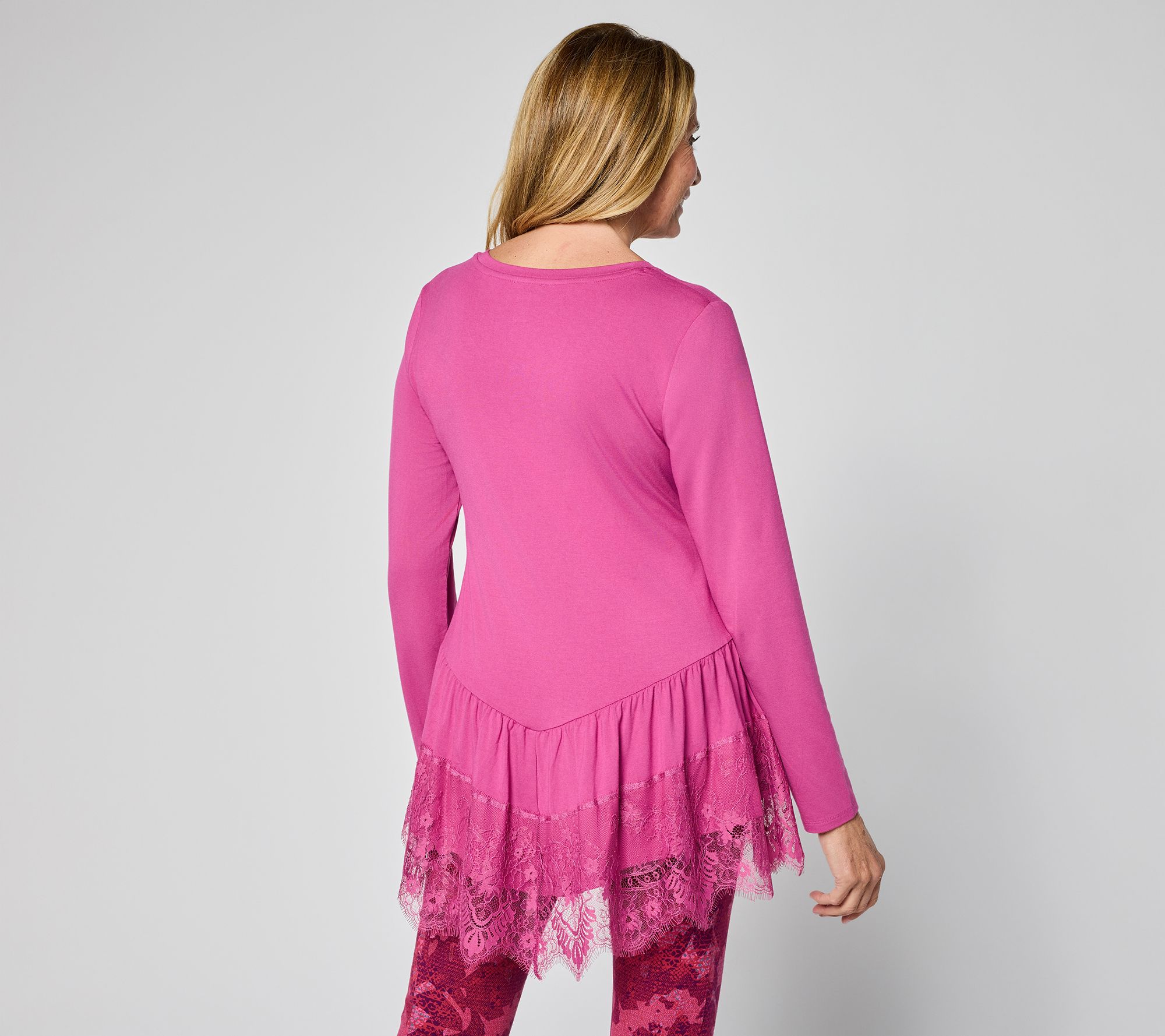 Business at the top. Party at the bottom. This ruffle-hem top -- beautifully detailed in scalloped lace -- layers effortlessly under your favorite jackets and cardis, thanks to smooth, stretch jersey fabrication. We love it for times when a tee isn't fancy enough or your celebration look requires a side of serious comfort. From LOGO by Lori Goldstein®.