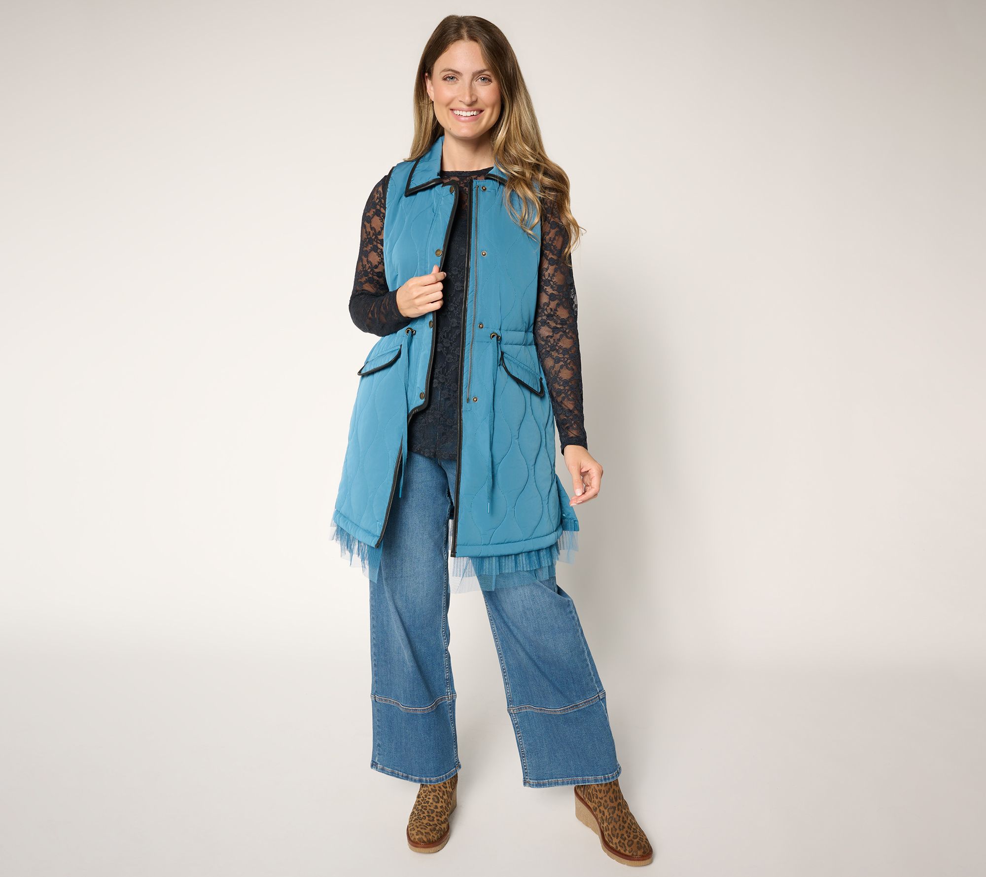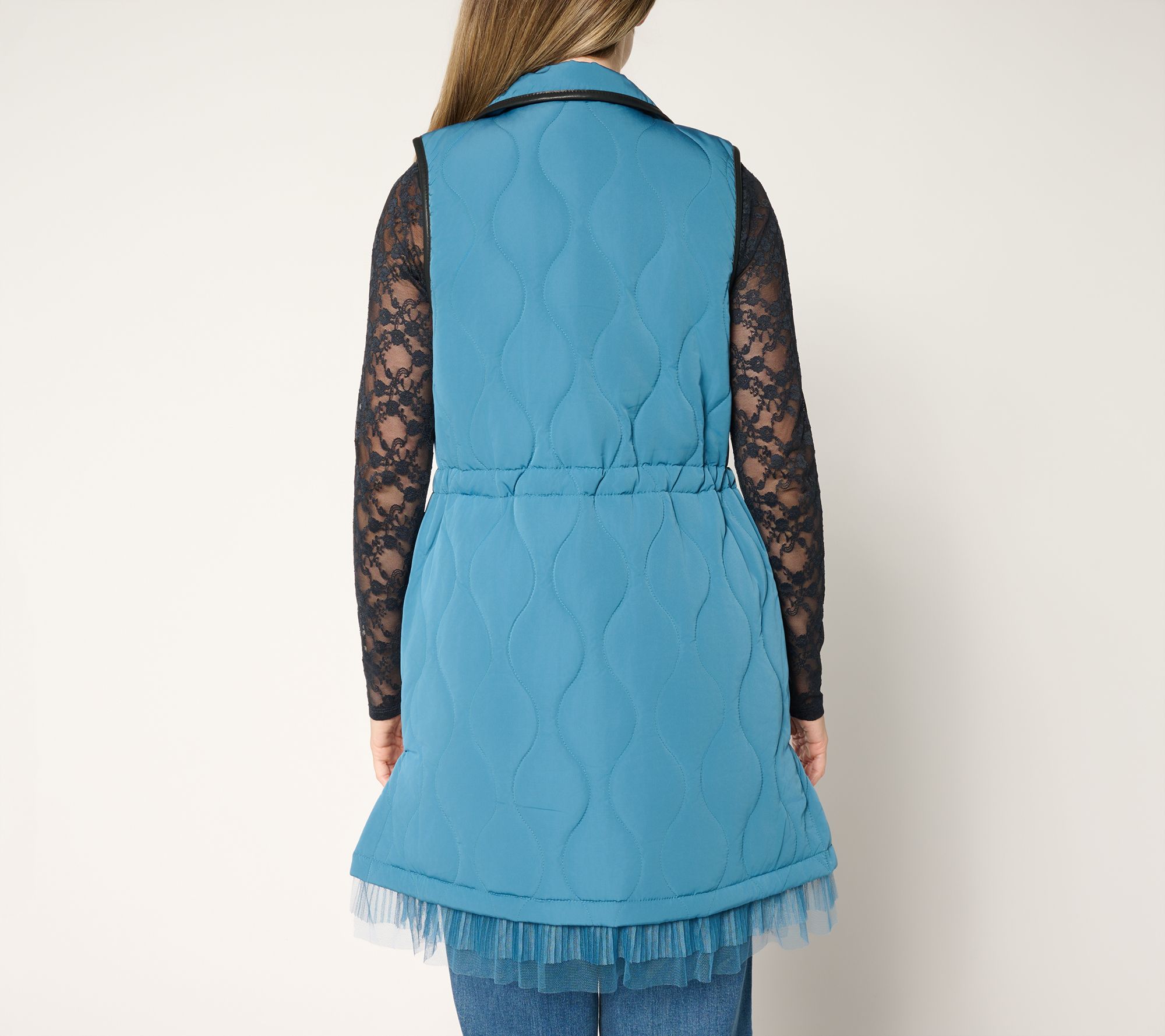 Your new favorite layer. Bulky button-ups and puffy parkas, step aside. This quilted jacket from Q50 Ambassador Lori Goldstein brings a modern edge to everything from chilly morning walks to casual dinners out. This sleeveless zip-up features faux leather trim, snap accents, and a waist drawcord for easy adjustment, while a double layer of pleated mesh at the hem (for twice the fun!) adds an unexpected feminine touch. Slip it over long sleeves and chunky sweaters for unrestricted style and a look that's uniquely yours. From LOGO by Lori Goldstein®.