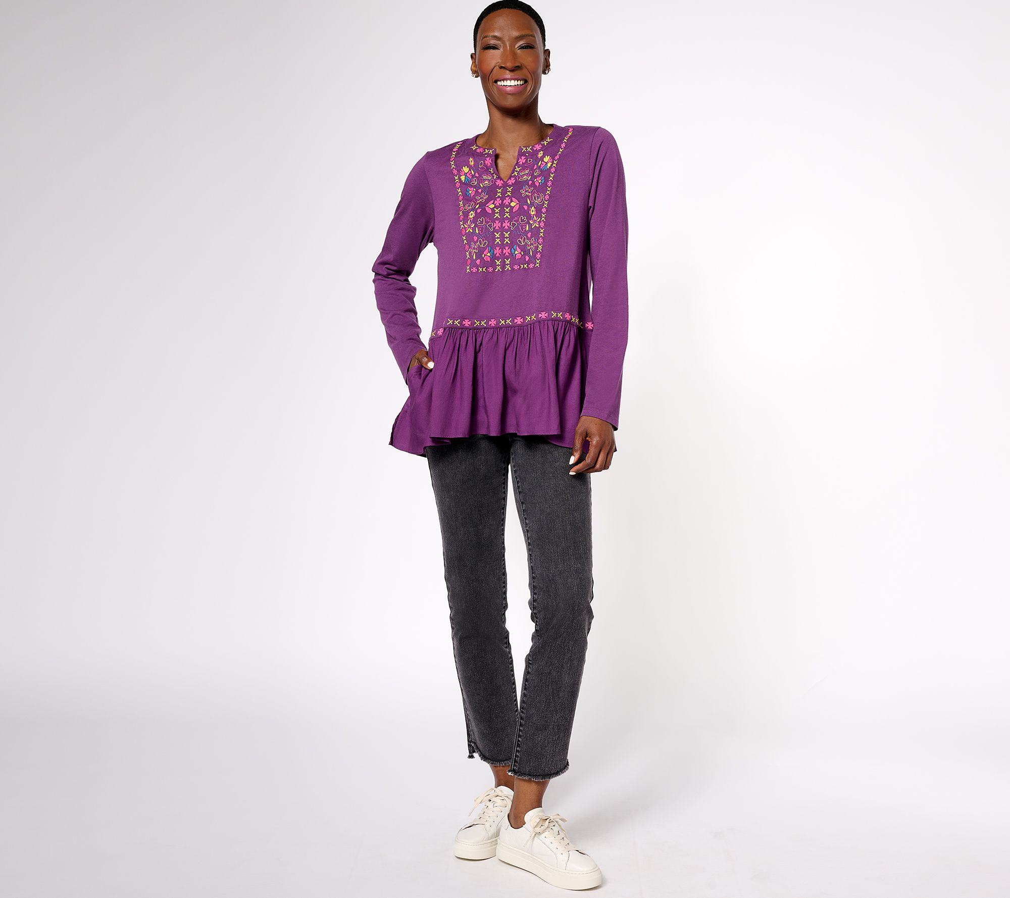 Embroidered details give this easy-breezy tunic a delightful boho-chic energy. Paired with your favorite denim and fresh sneaks, this standout style is oh-so-ready for your fall social calendar. From LOGO by Lori Goldstein®.