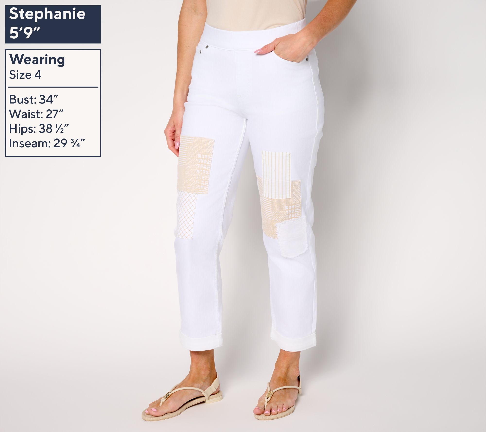 Casual date night to picnics in the park -- this boyfriend is ready for any adventure! Peppered with playful patchwork, these pull-on jeans exude an artsy aethestic and a fresh departure from basic bottoms. (This one's a keeper!) From LOGO by Lori Goldstein®.