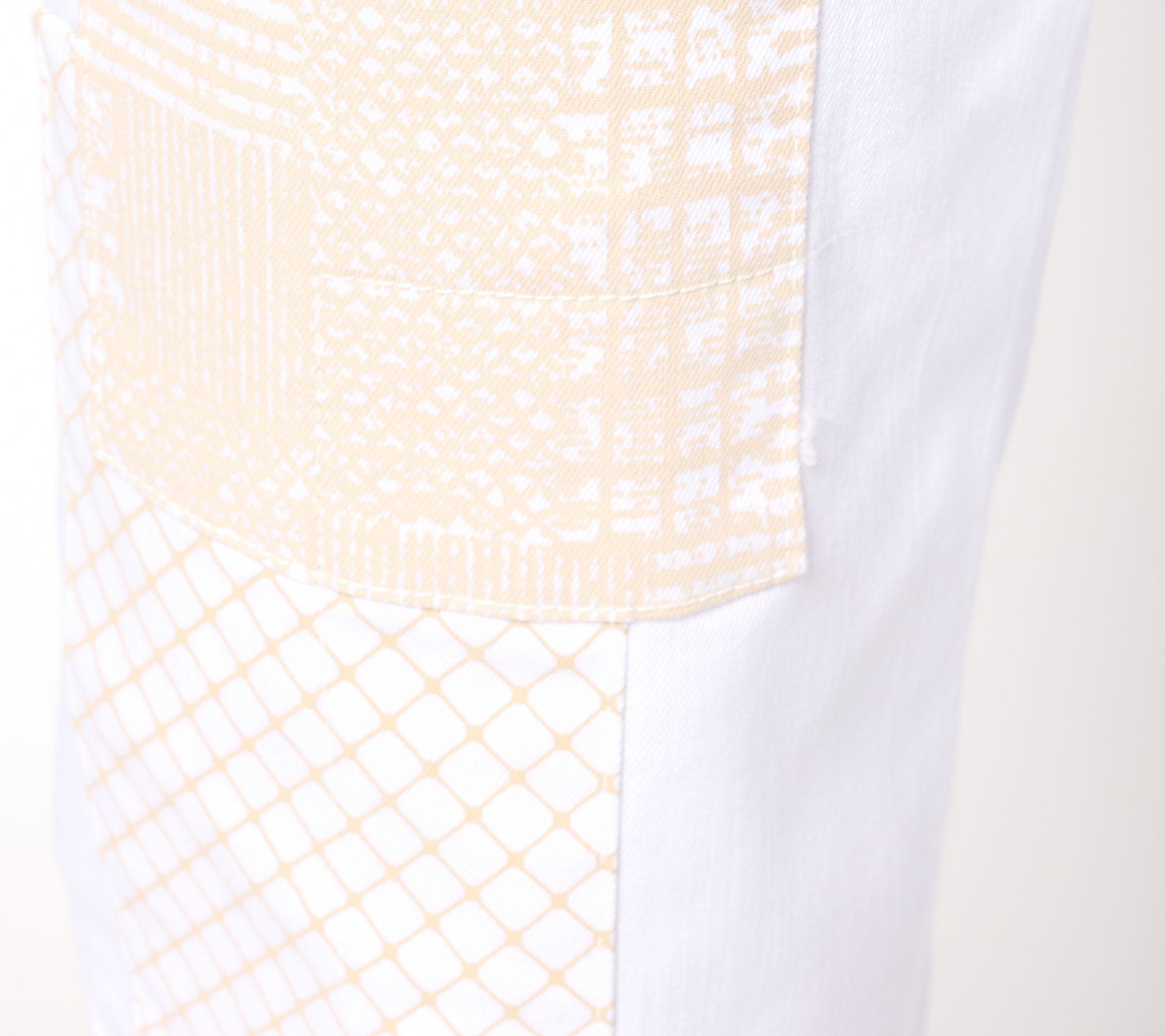 • Features: pull-on, boyfriend style, patchwork on leg front, non-functional fly, encased elastic waistband, front scoop pockets, front coin pocket, back pockets, cuffed, ankle length
