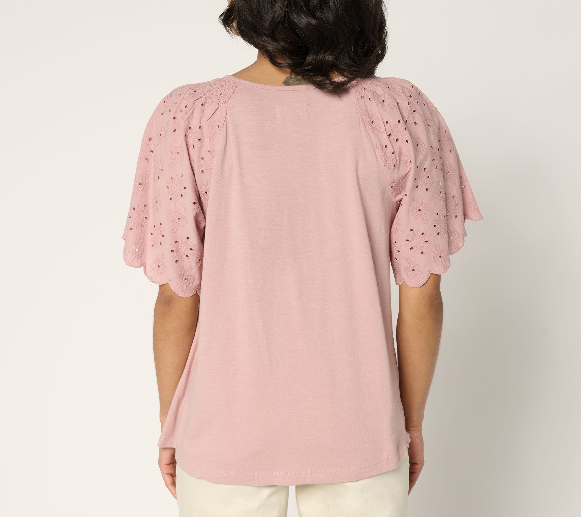 How sweet it is... to spend a family celebration or evening with friends in this charming eyelet top! The 100% cotton design's knitted back provides flexibility and comfort as you mix and mingle. From LOGO by Lori Goldstein®.