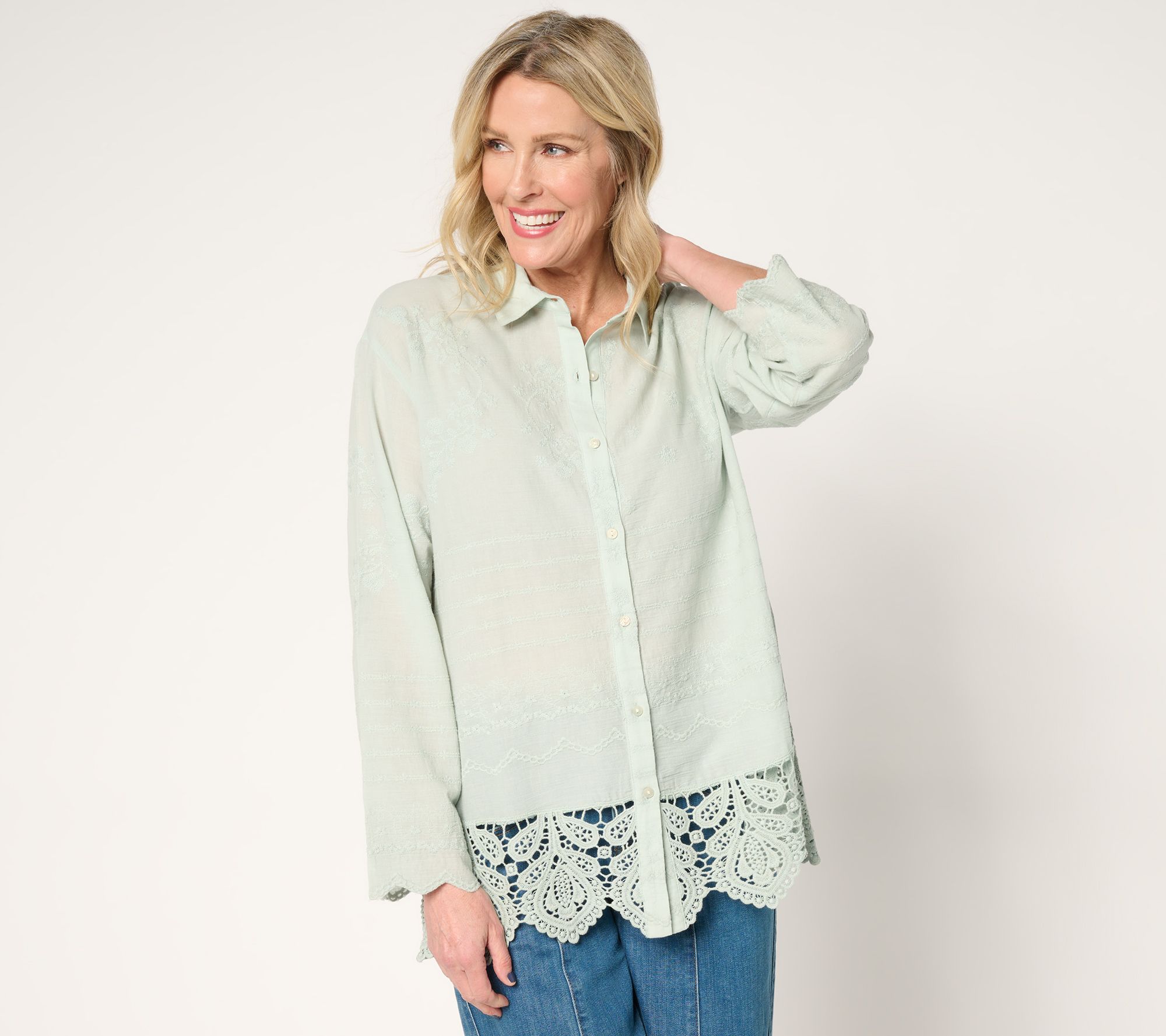 Leave your what-to-wear worries at the door. This beautifully relaxed, charmingly embroidered shirt has landed to make you feel pretty and polished -- and comfy (it's 100% cotton!) -- at the social gathering, work event, or travel excursion. From LOGO by Lori Goldstein®.