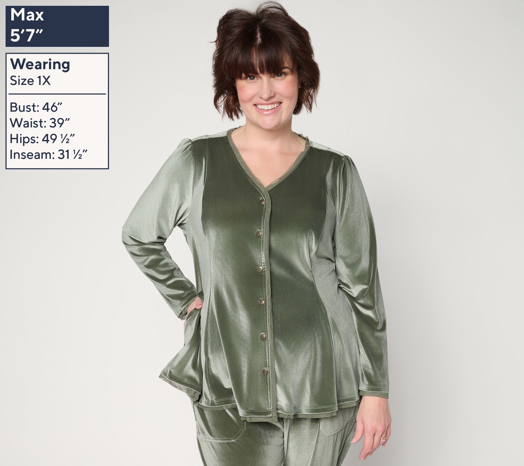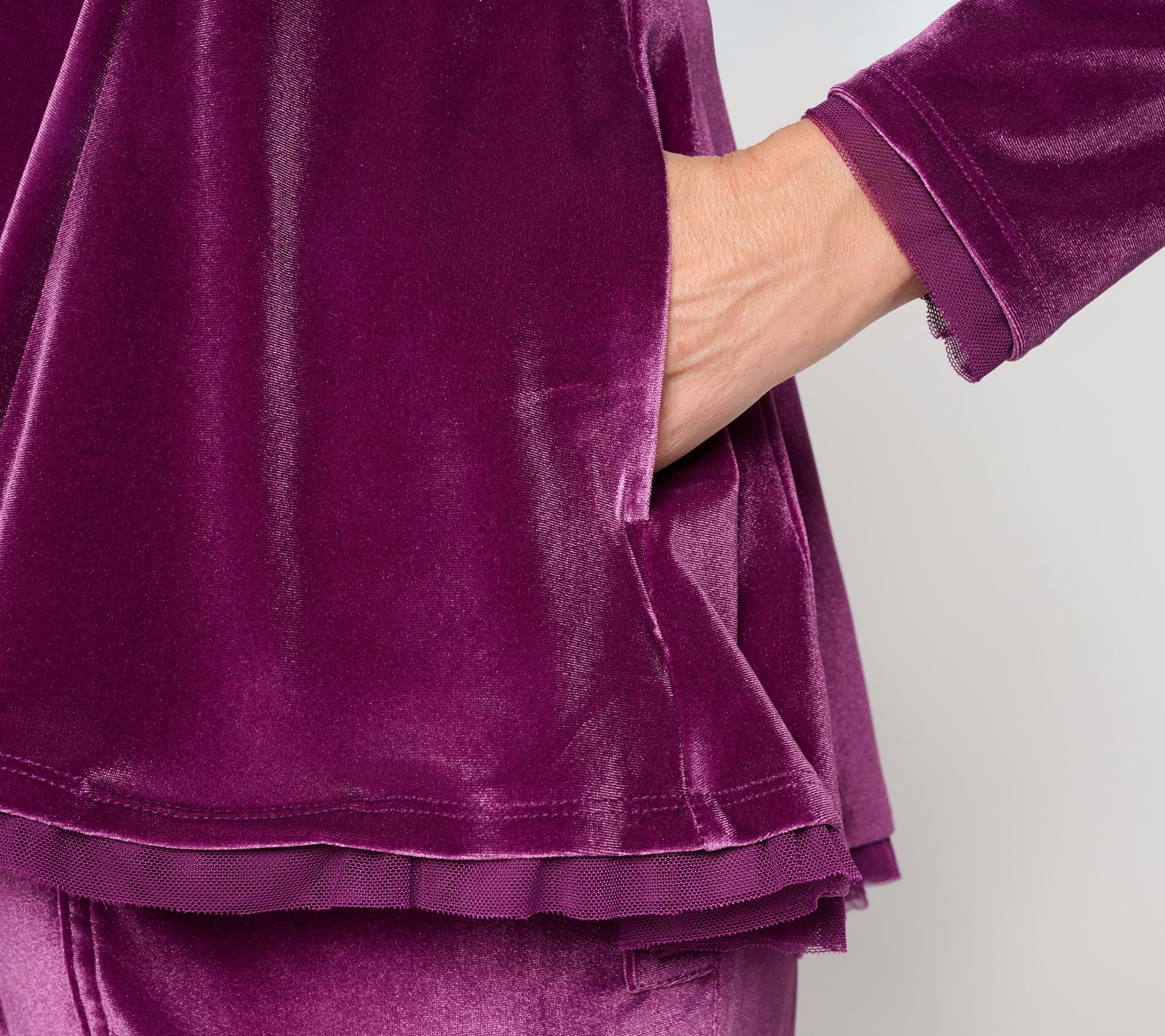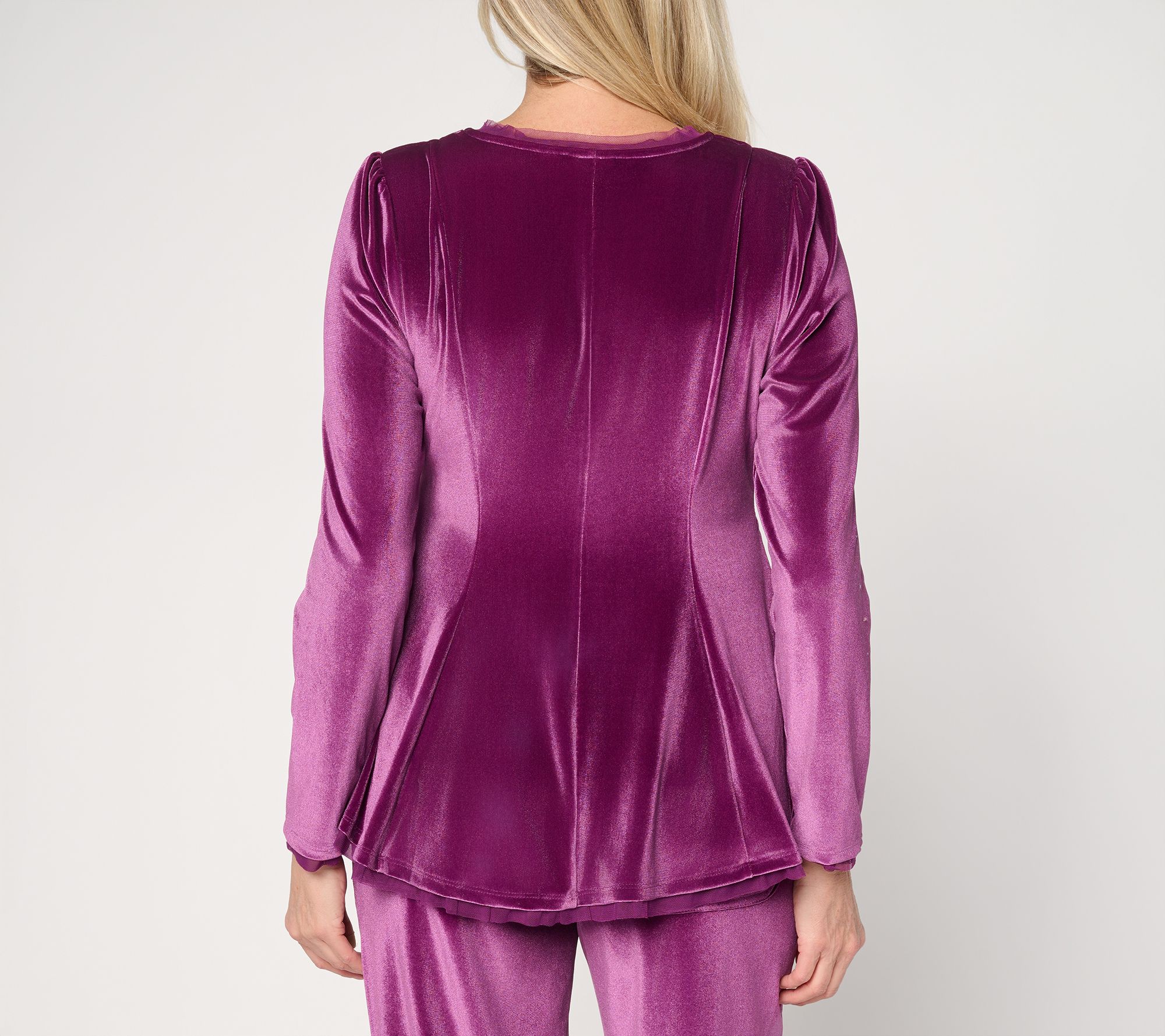 No doubt about it. Velvet season is back. Just peep this latest offering from Lori Goldstein -- an elevated, mesh-trimmed top in a stretchy spandex blend. But here's the secret: You don't have to wait for a big event to wear this button-up. With softness and a subtle sheen drawing us in like a tractor beam, it's just as fab for everyday moments as it is for holiday soirees.