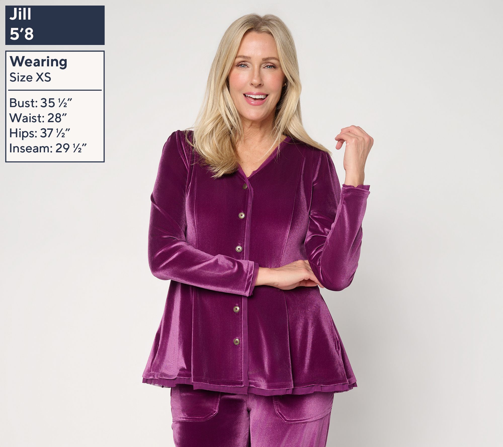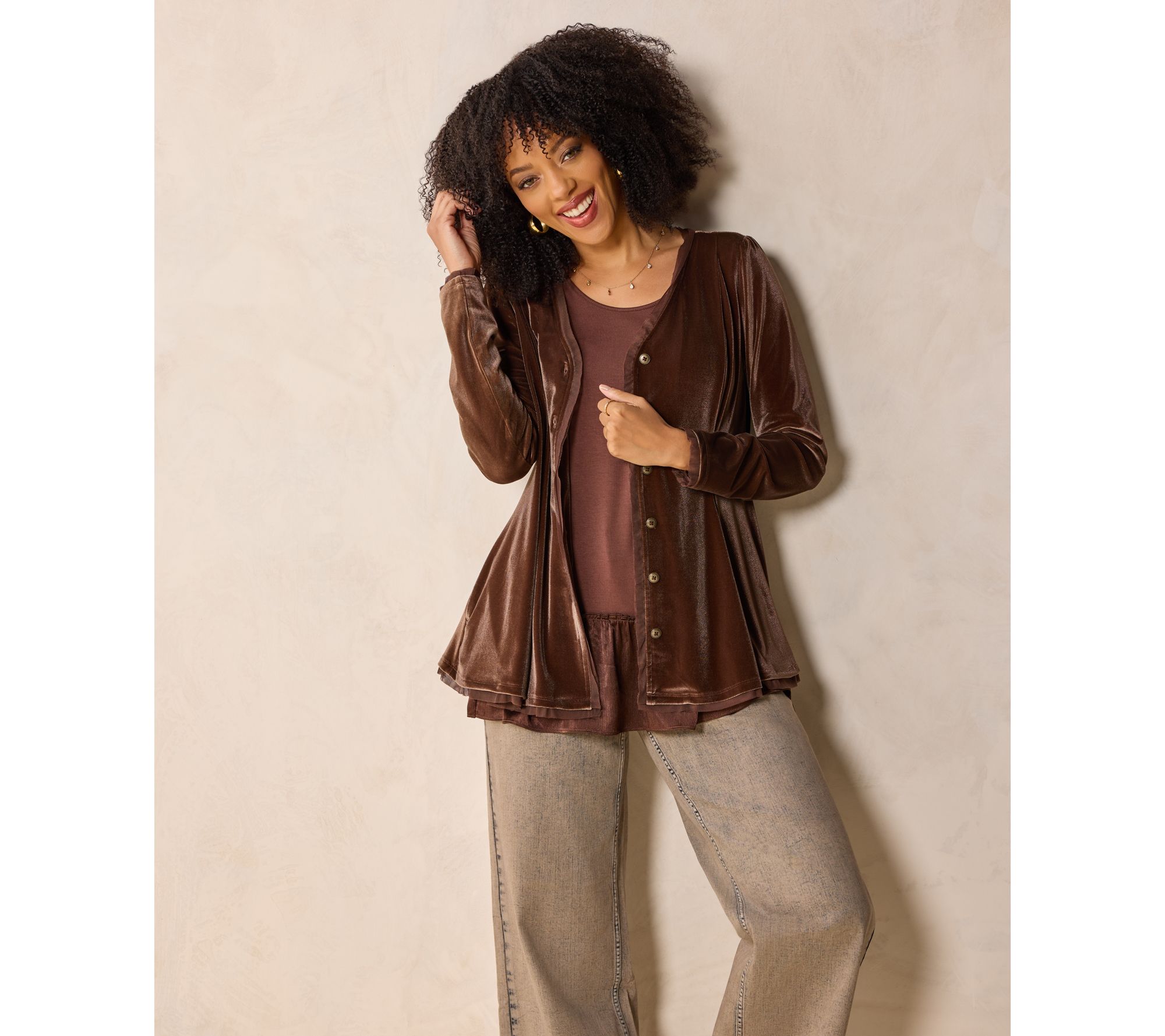 Nothing feels as fabulous as velvet. Slip it on with Lori's matching velvet joggers for a plush lounge set that's pure indulgence. Got a last-minute invite? Layer its slight peplum silhouette over flowy wide-leg trousers and you're party-ready (and a scene-stealer!) in seconds. Meeting up with your favorite gals? Surprise them on arrival with a fresh twist -- wear it unbuttoned over a printed tank and your go-to barrel jeans. Effortless. Unexpected. Unforgettable.