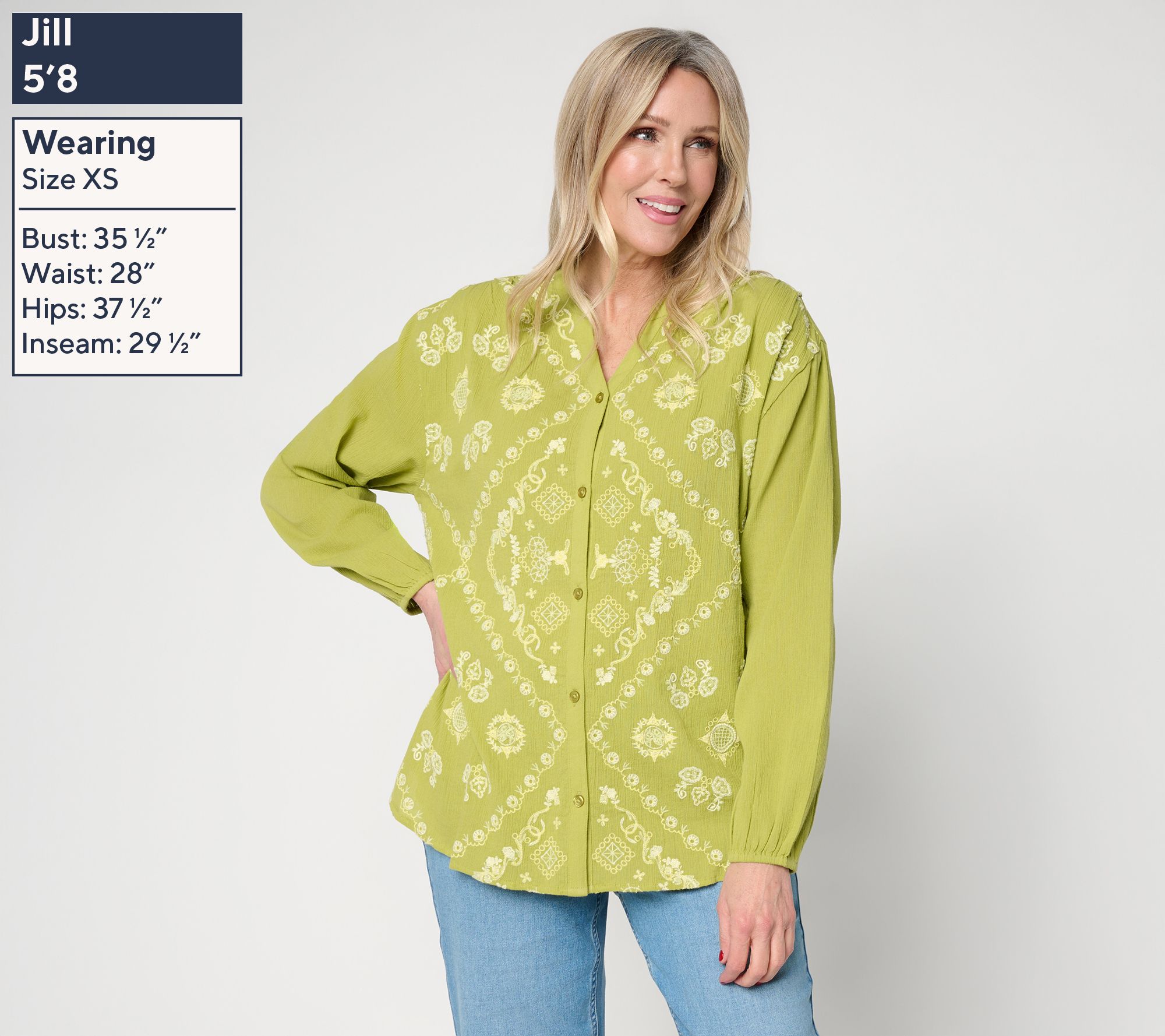 Flowing embroidery brings artistic elegance to this woven blouse, designed for breezy days at home or stepping out for an afternoon gathering. Thoughtful touches like the button front, shirring at the shoulders, and relaxed drop-shoulder shape create a look that pairs well with sleek pants or well-loved denim. From LOGO Lavish.