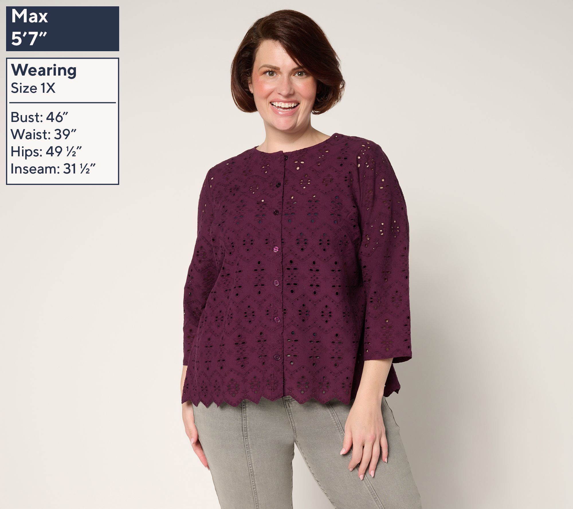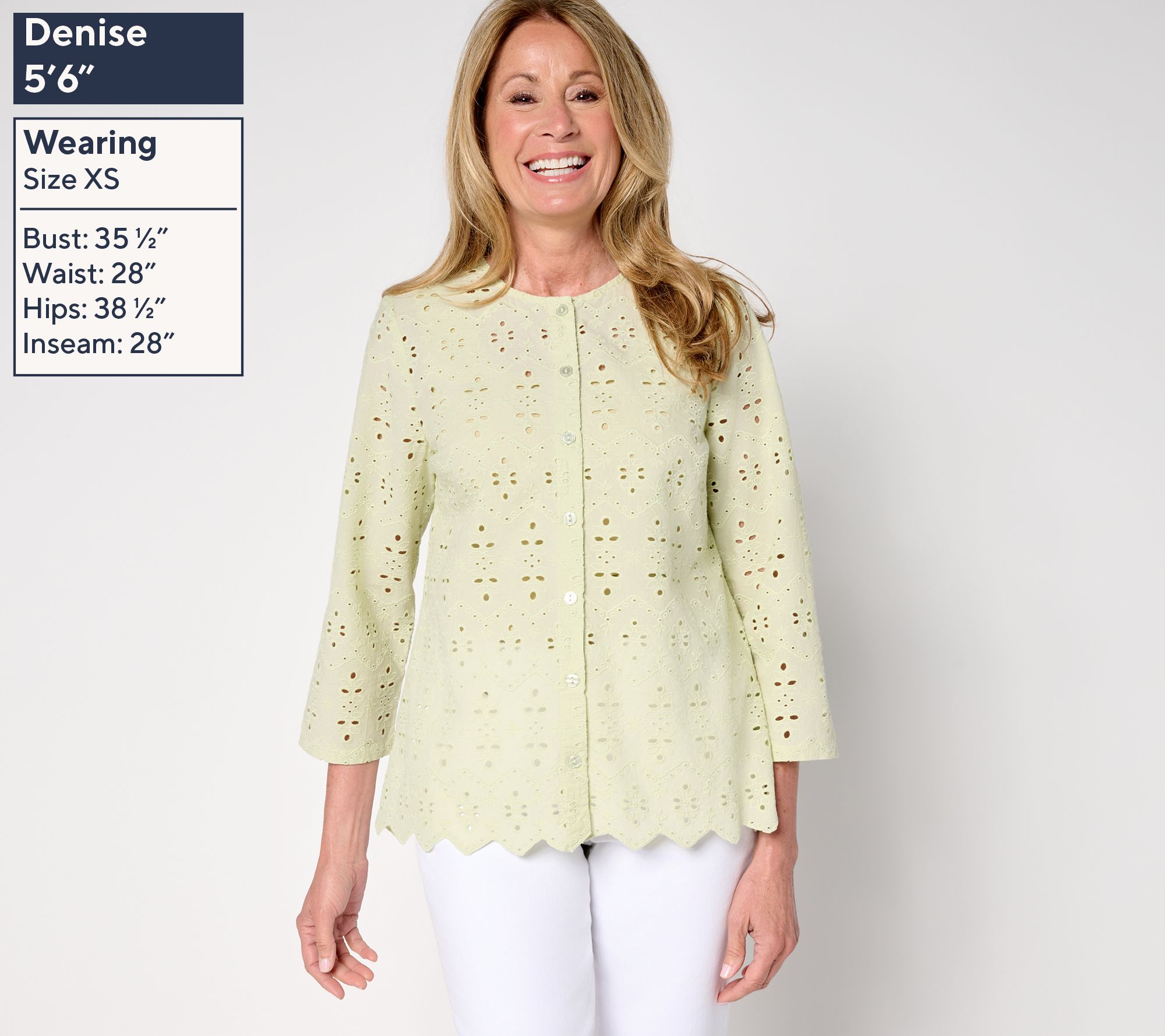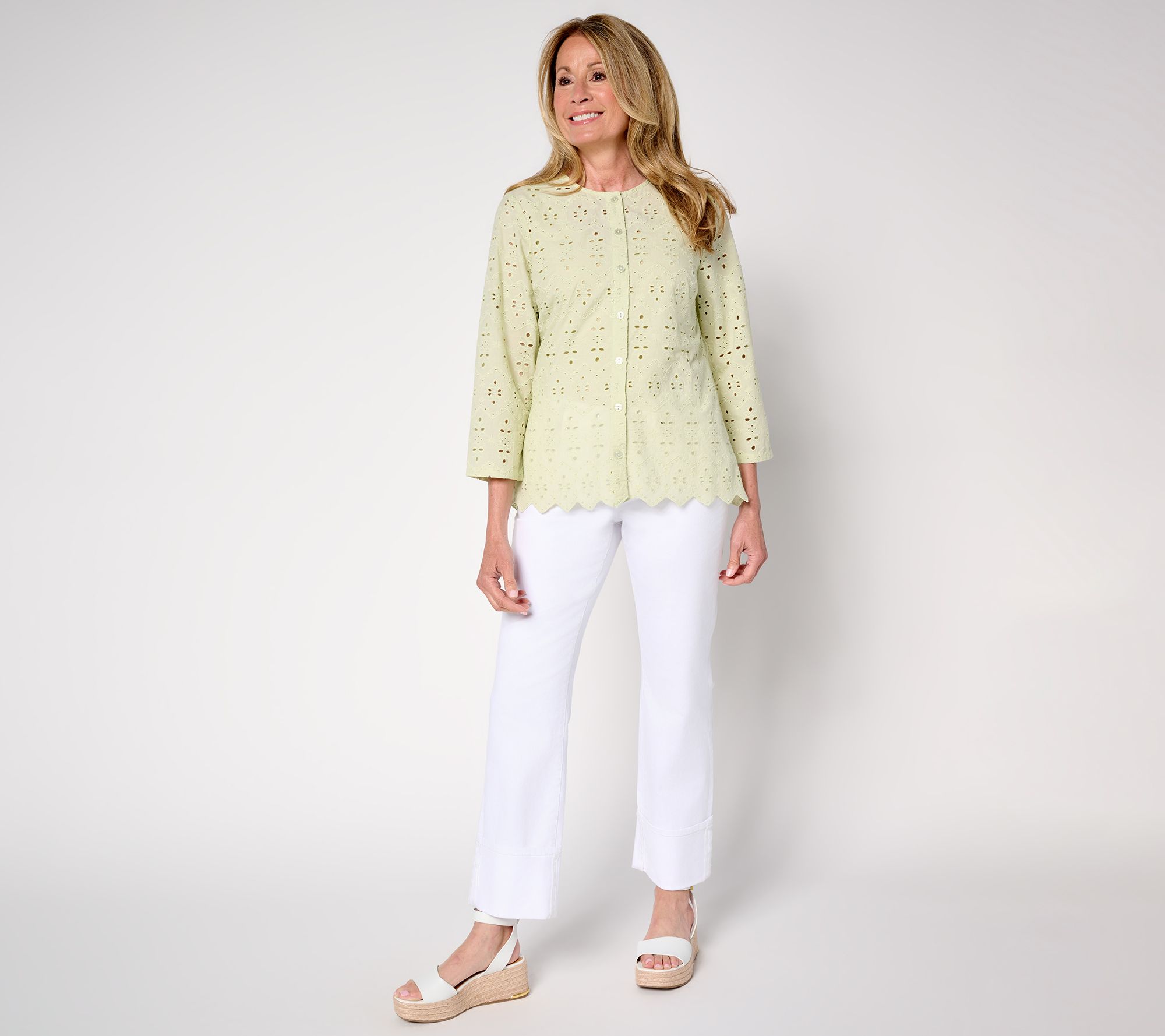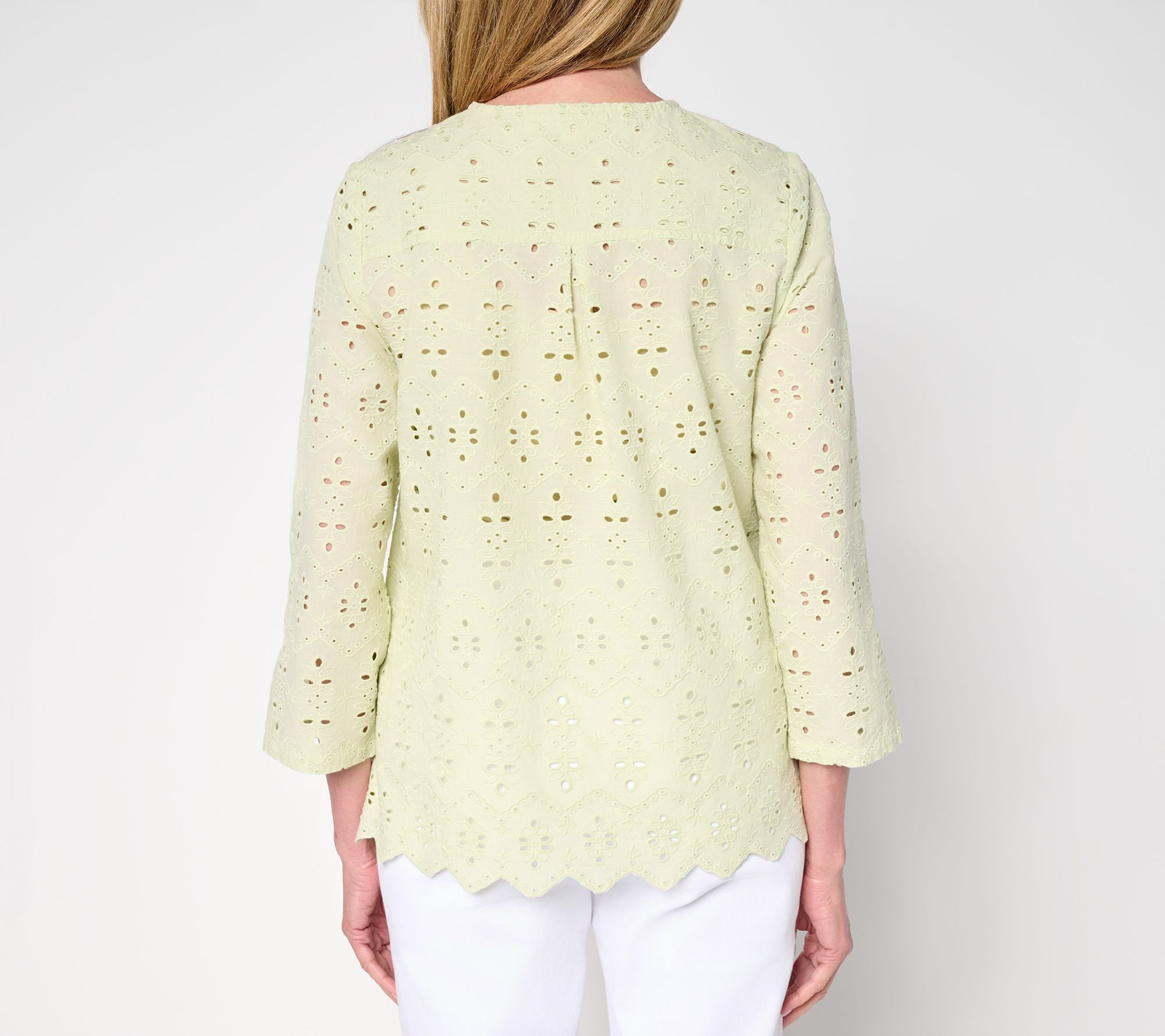 Days that call for a breezy, feminine vibe deserve this LOGO Lavish eyelet top. Its airy aesthetic is ideal for summery soirees or when your 'fit demands a lightweight topper. Pair with a tank or cami, or couple with a sleeveless dress for fuss-free coverage. From LOGO Lavish by Lori Goldstein®.