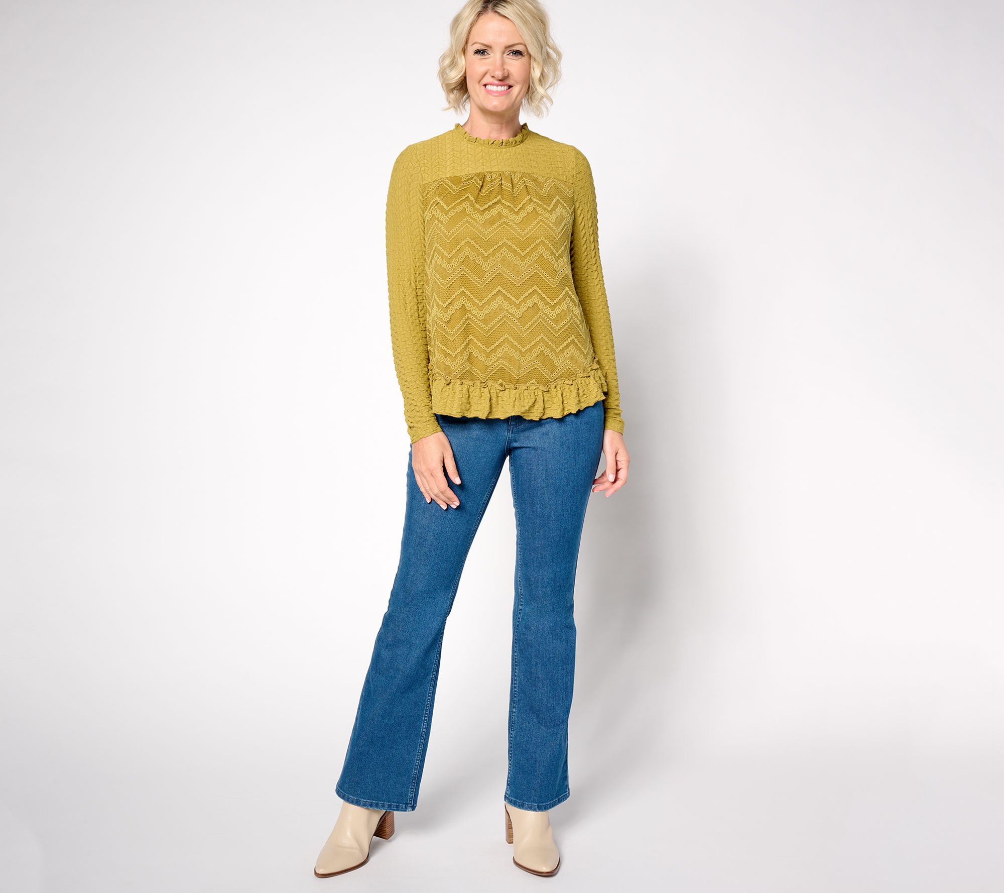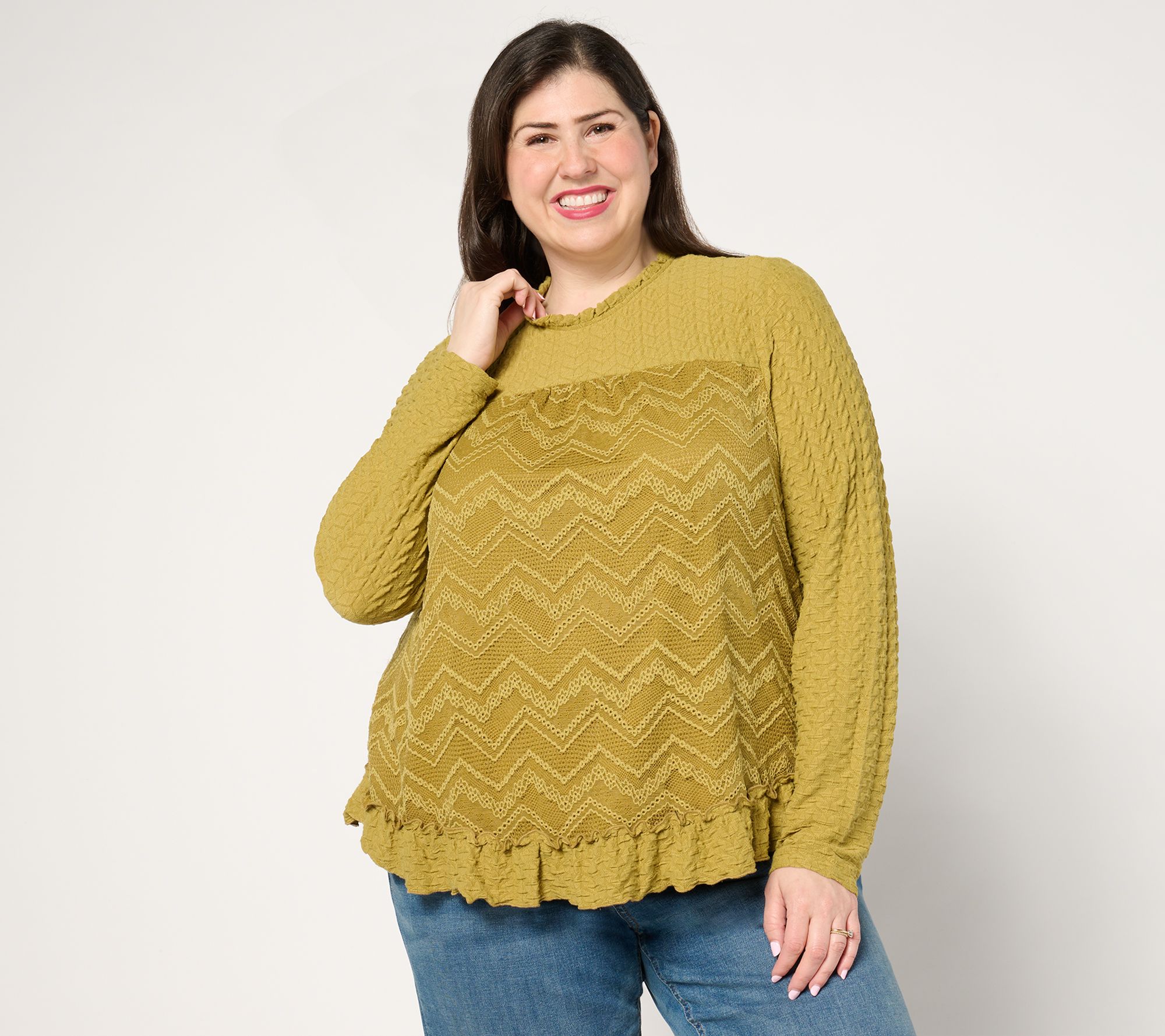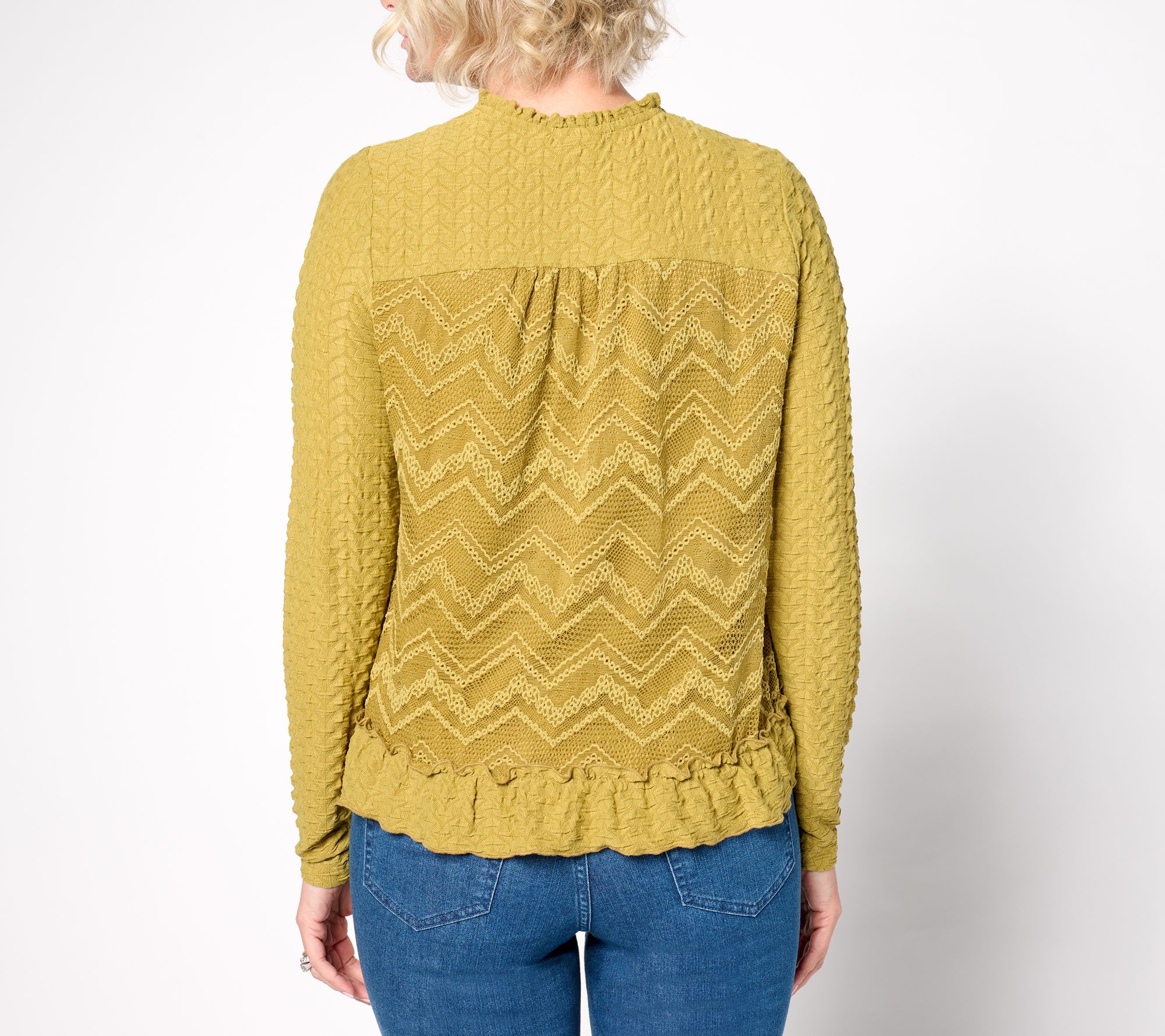 Express your individuality with the LOGO Lavish by Lori Goldstein long sleeve crew neck lace top. With a ruffled neckline, delicate lace mix, and semi-fitted silhouette, this top seamlessly blends charming details with a flattering fit. From LOGO Lavish by Lori Goldstein®.