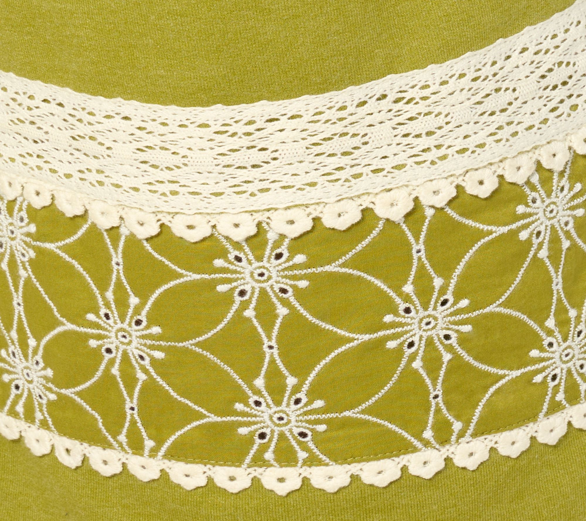 • Features: cropped length, elastic waistband, front slash pockets, lace applique details on hem