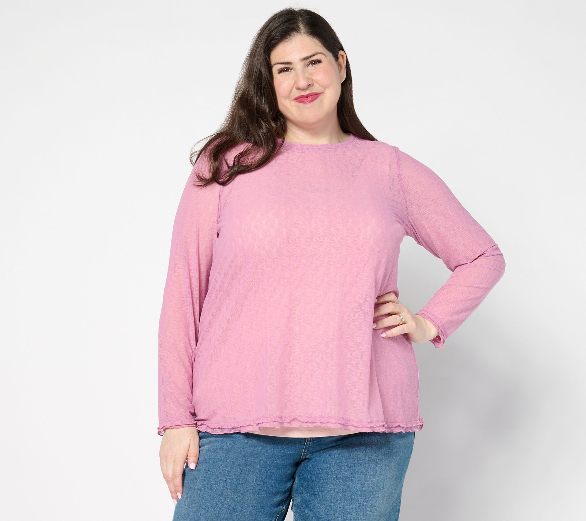 Embrace the chic simplicity of the Logo Layers By Lori Goldstein crew neck long sleeve mesh top. With its graceful ruffles at the sleeves and bottom hem, this semi-fitted design effortlessly follows the lines of the body, offering ease and style in one. Perfect for layering, it adds a touch of elegance to any outfit. From LOGO Layers by Lori Goldstein.