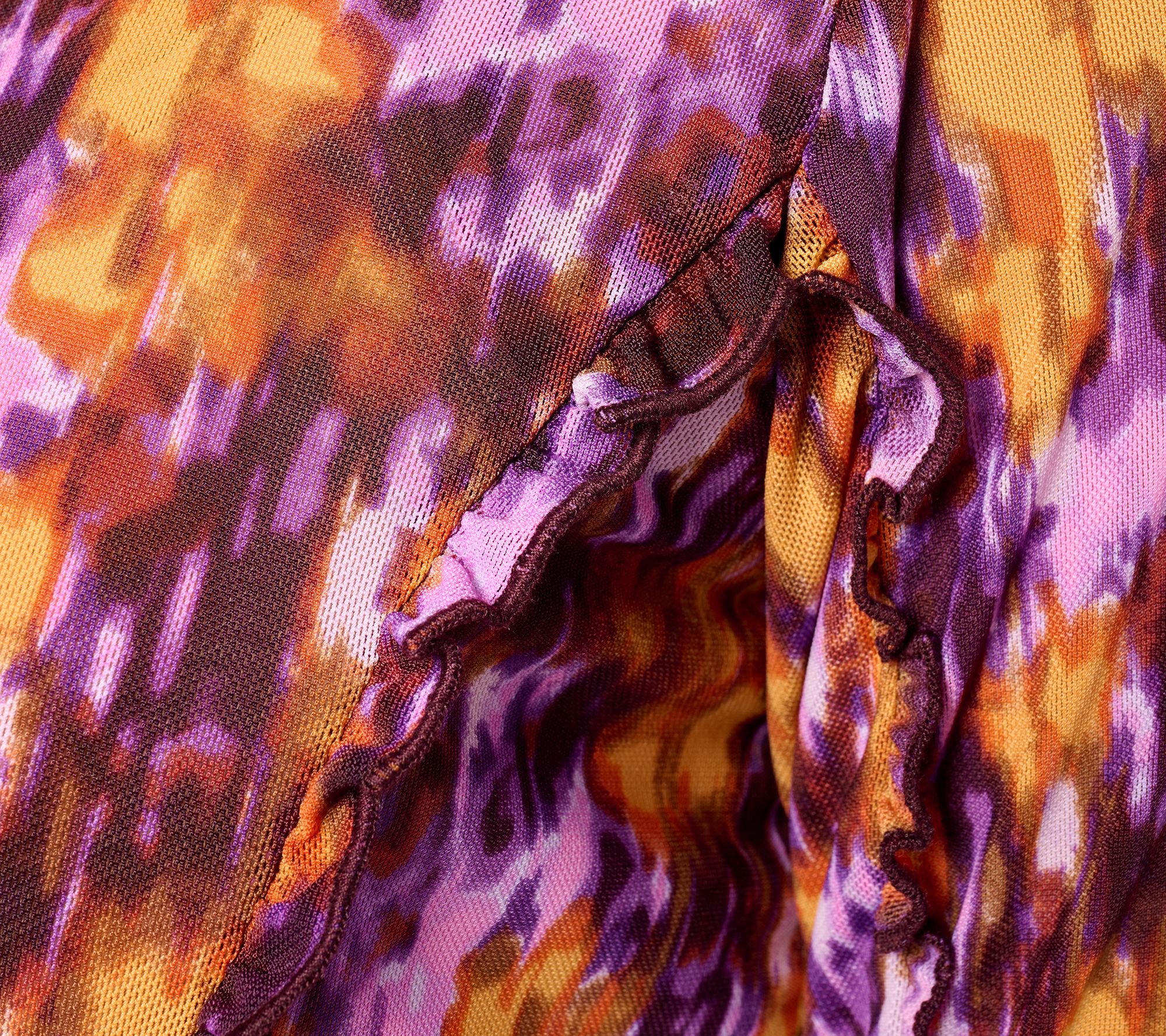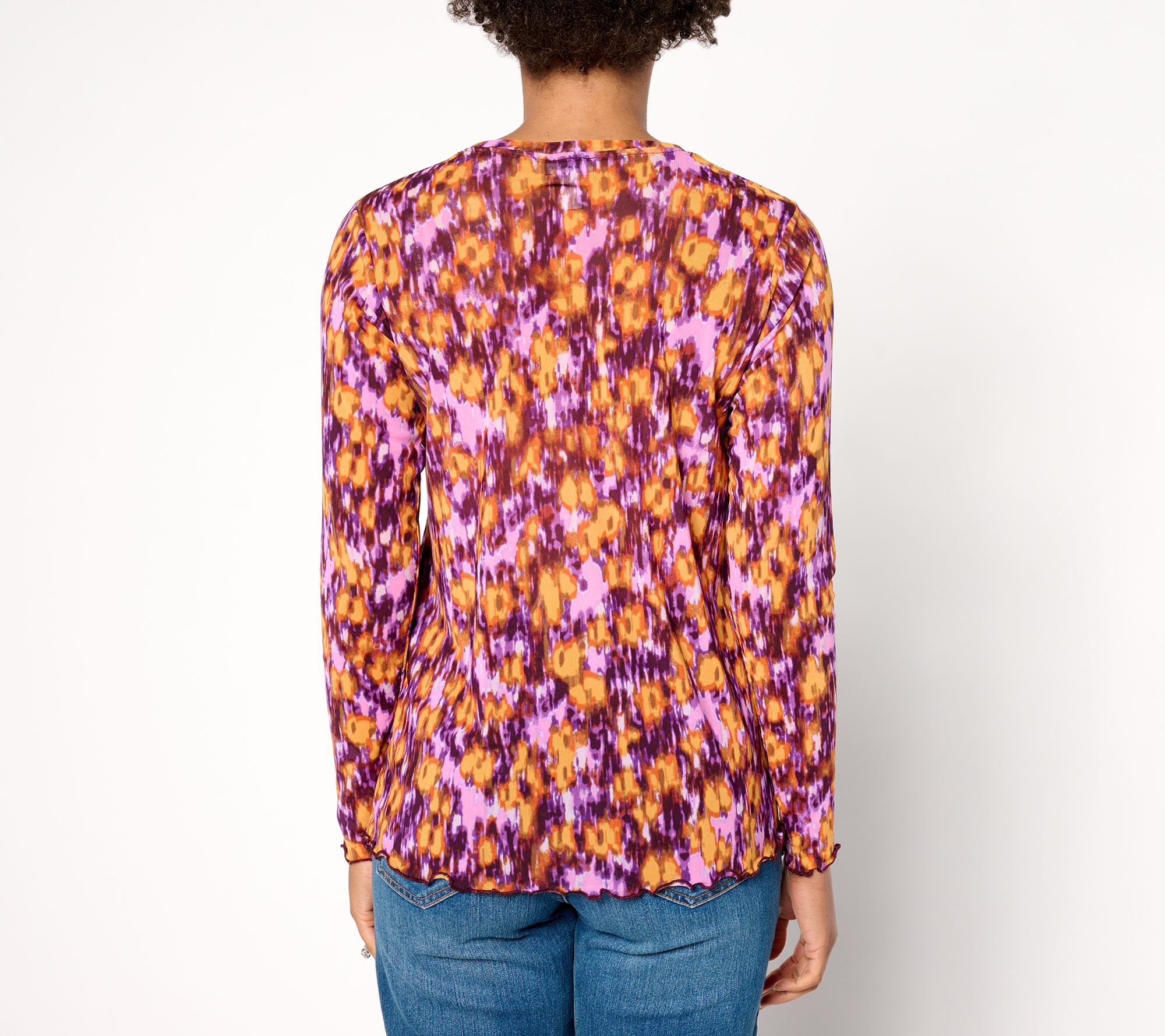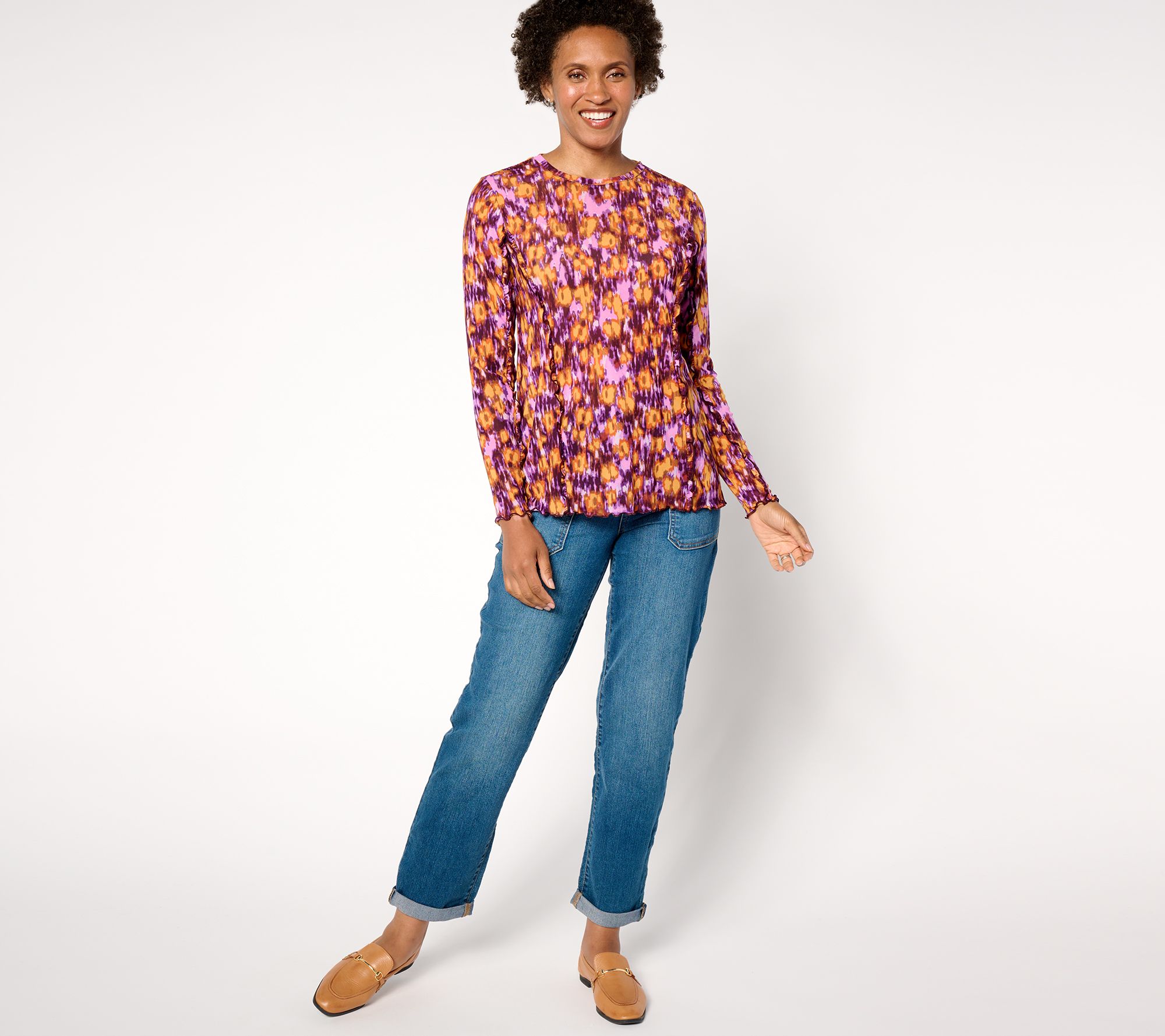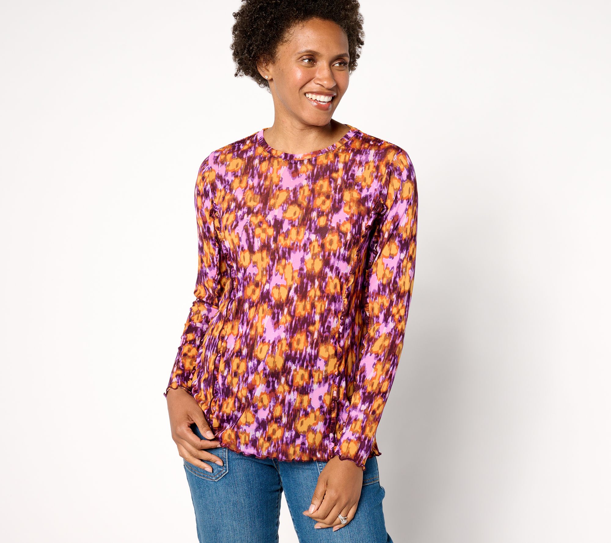 What's fresh for fall? Popping prints! Nobody does it like Lori Goldstein, as evidenced by this energetic crewneck creation. And those ruffly purl-edged hems? So pretty layered under a jacket or peeking out from a cozy cardi. From LOGO by Lori Goldstein®.