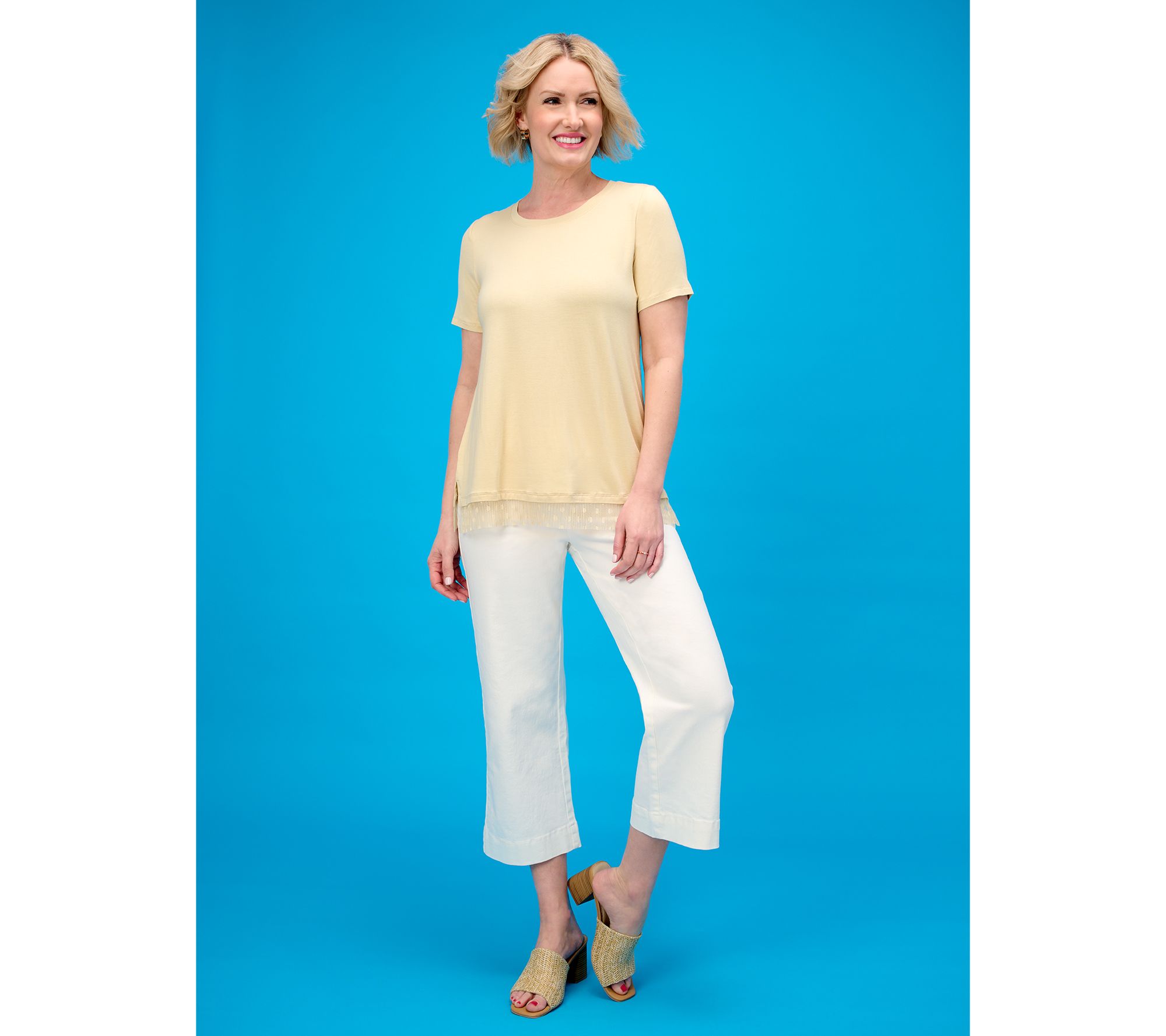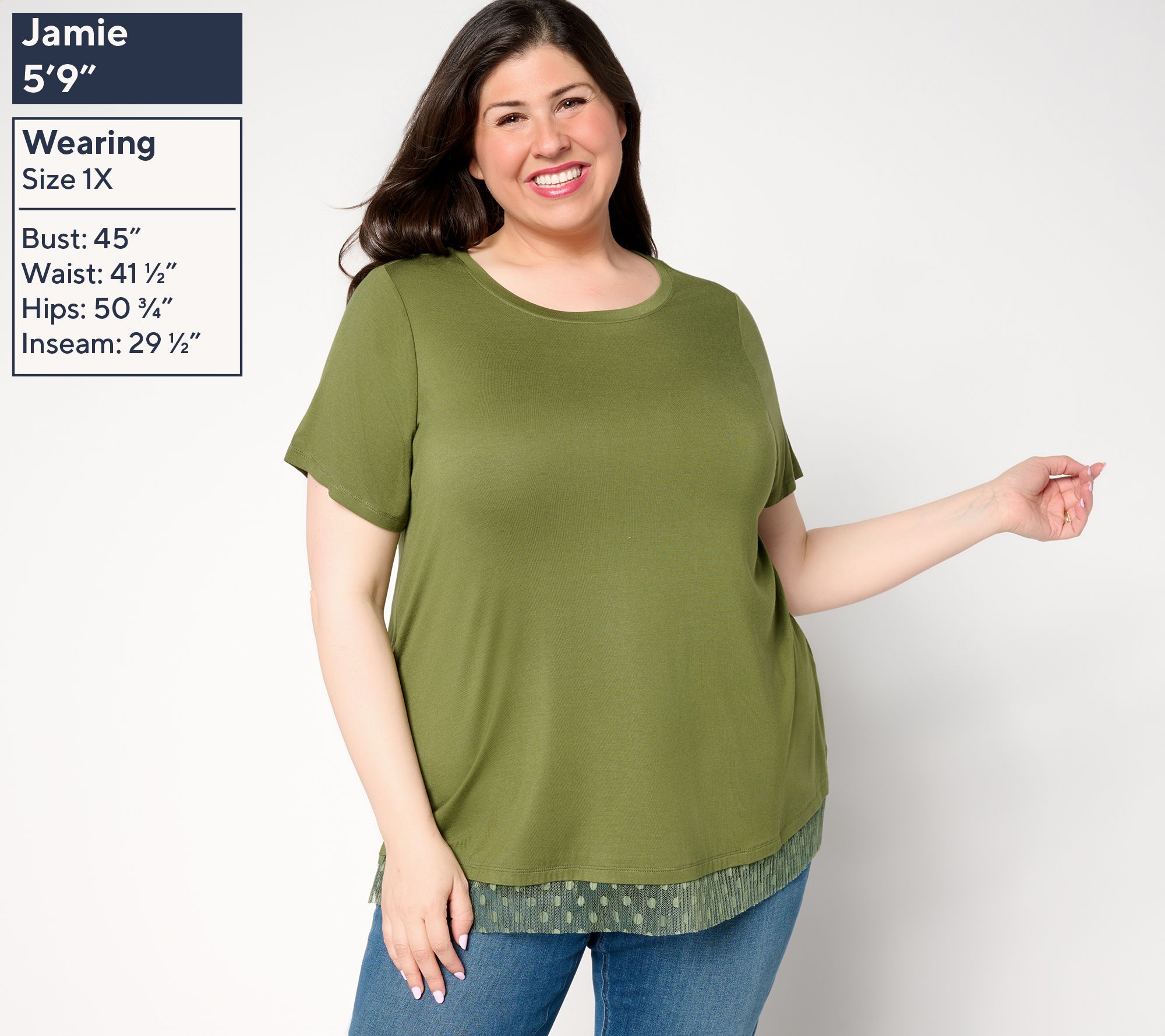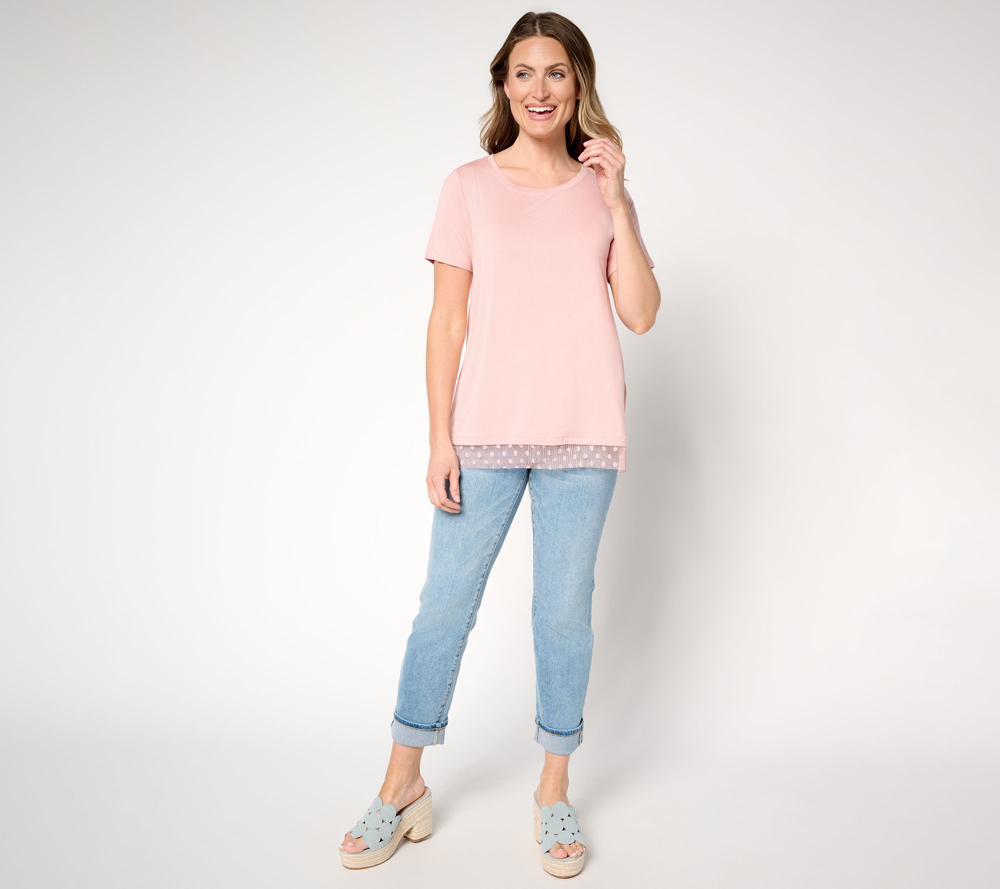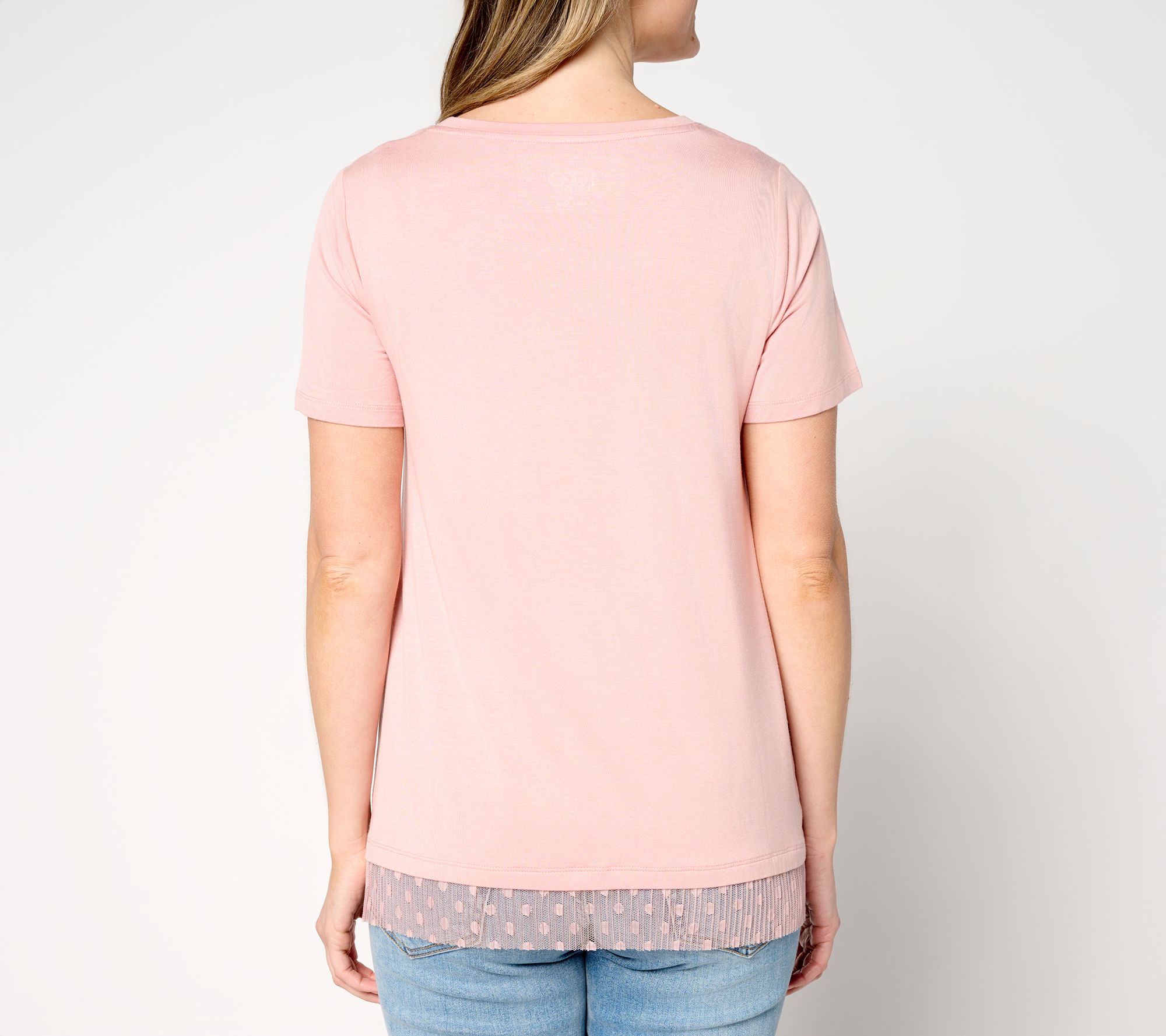 Add a dash of whimsy to your wardrobe with this short-sleeve tee. Featuring a playful mesh lace along the bottom hem, this tee make a fab find for casual outings or layering under a chic blazer. From LOGO by Lori Goldstein®.
