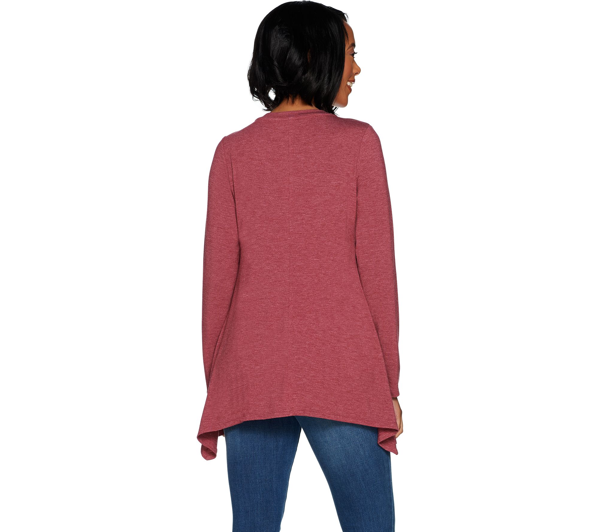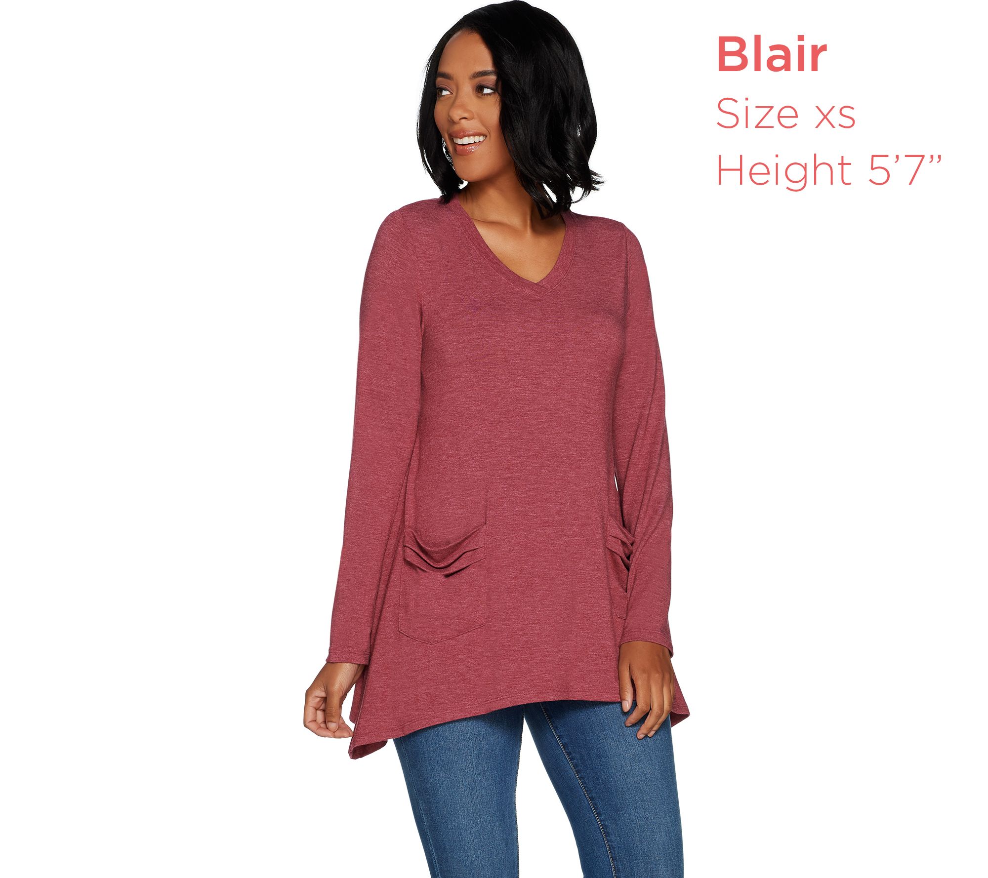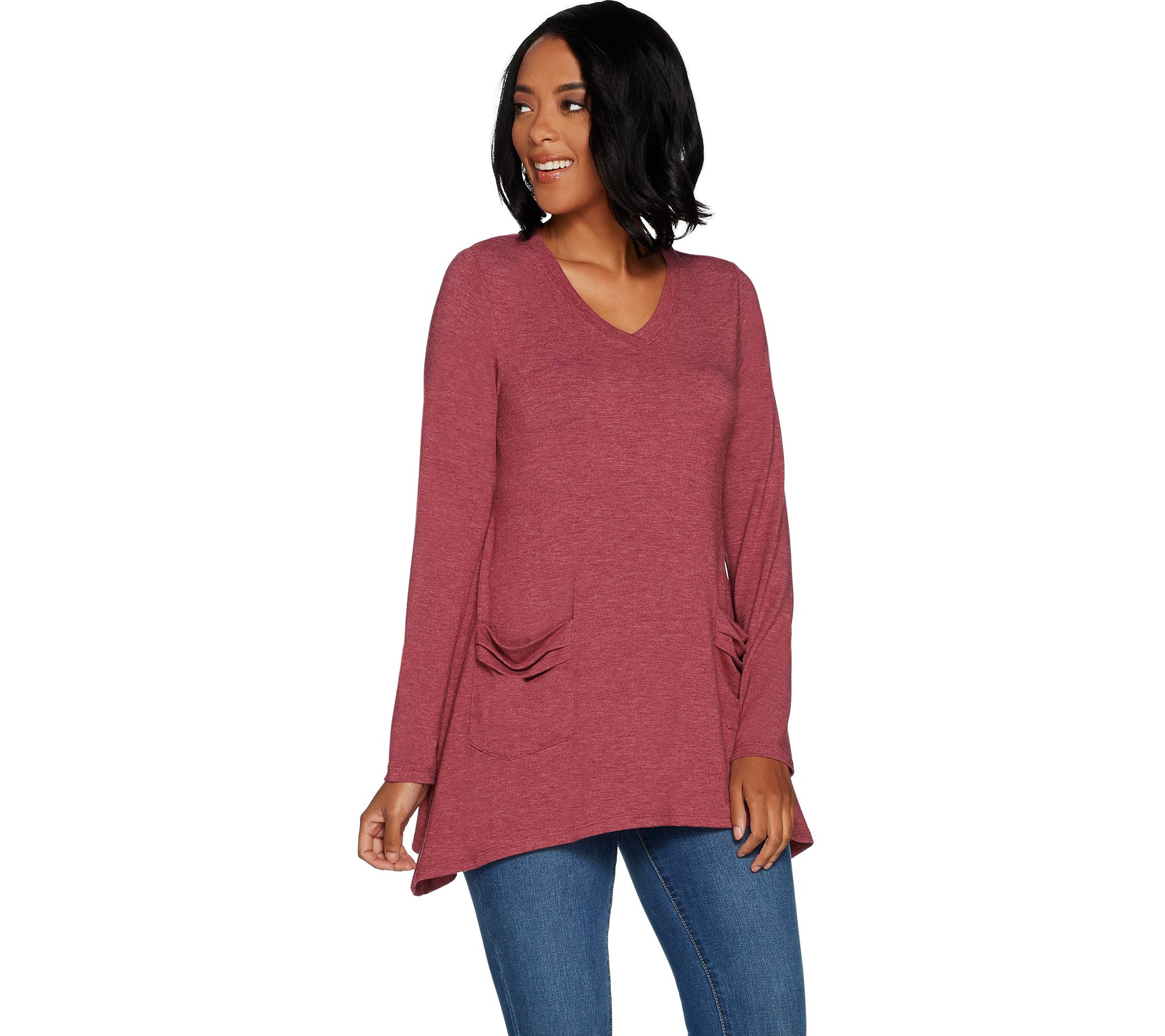 The sharkbite hemline and pleated-detail pockets lend this casual V-neck top some serious flair. It's crafted of soft jersey fabric that offers a comfortable fit. From LOGO Layers by Lori Goldstein.