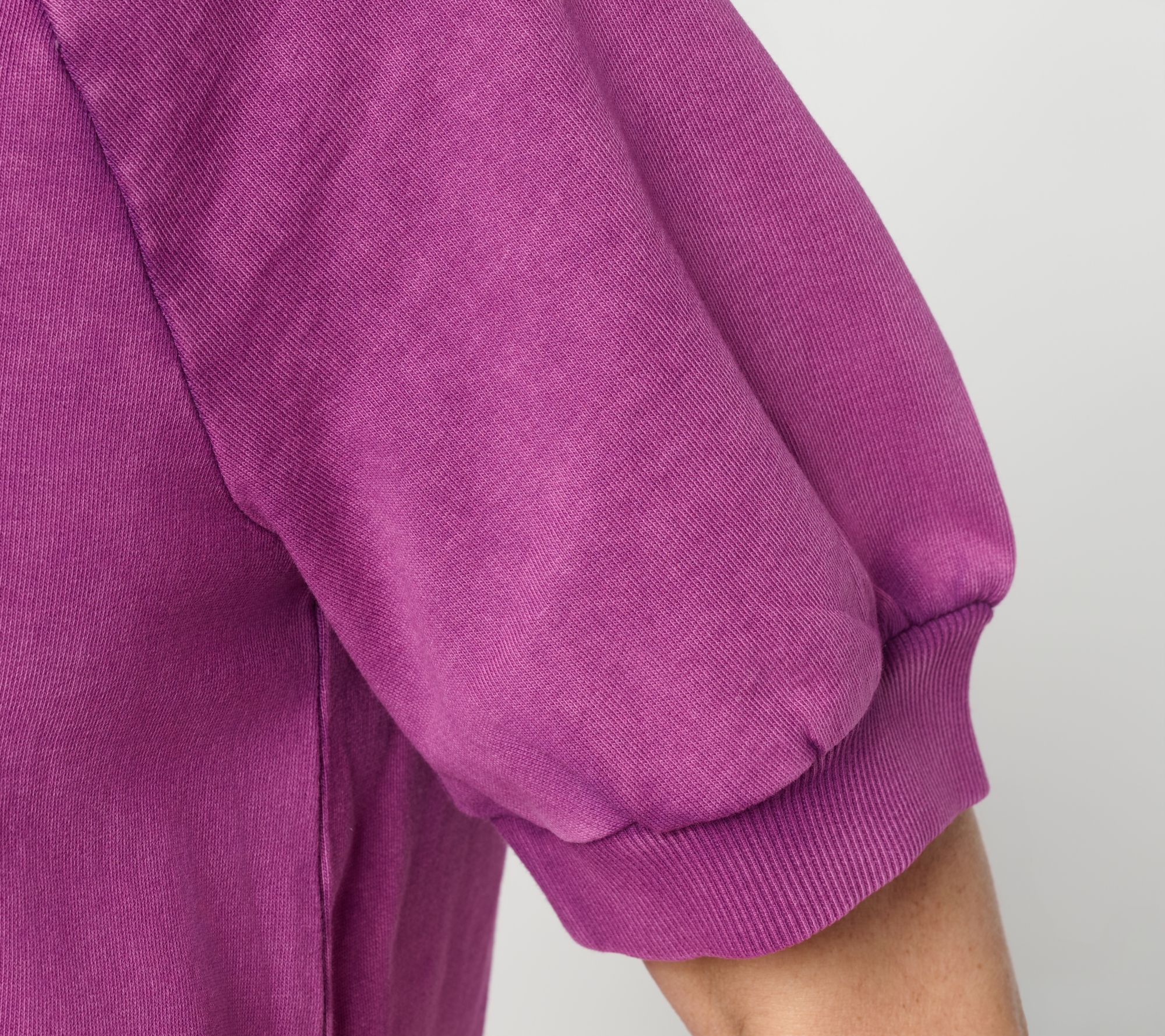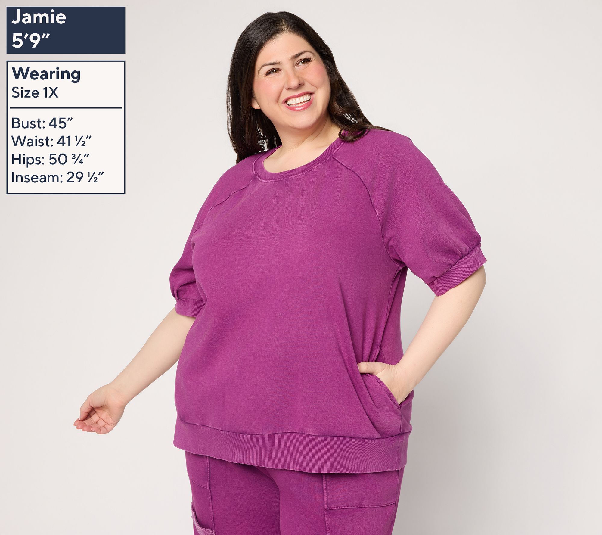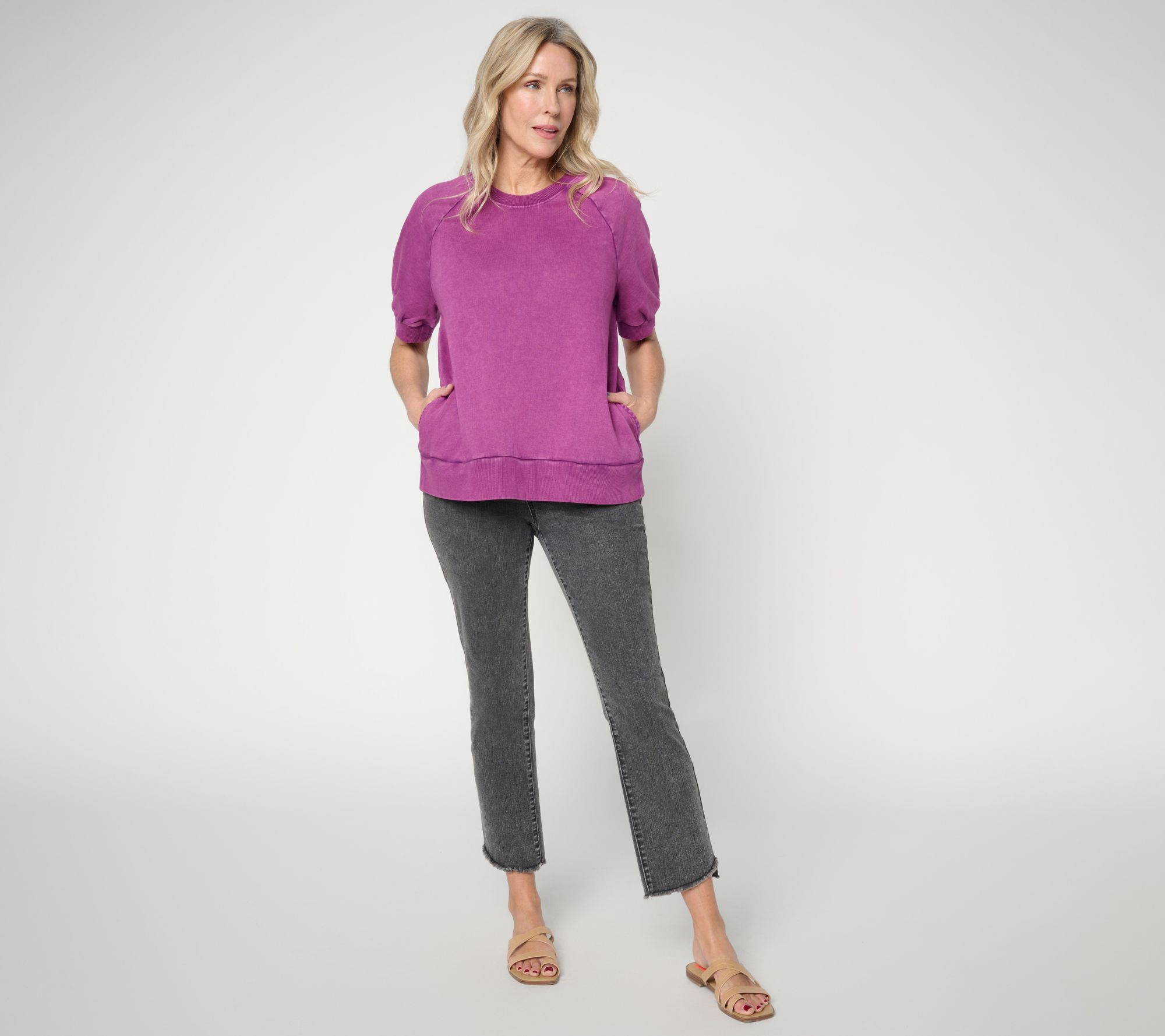Casual outings and downtime at home get a stylish update with this women's short-sleeve sweatshirt. Overdye detailing and raglan sleeves add a modern edge, making it easy to pair with your favorite jeans or joggers for a laid-back look with a touch of character. From LOGO Lounge by Lori Goldstein.