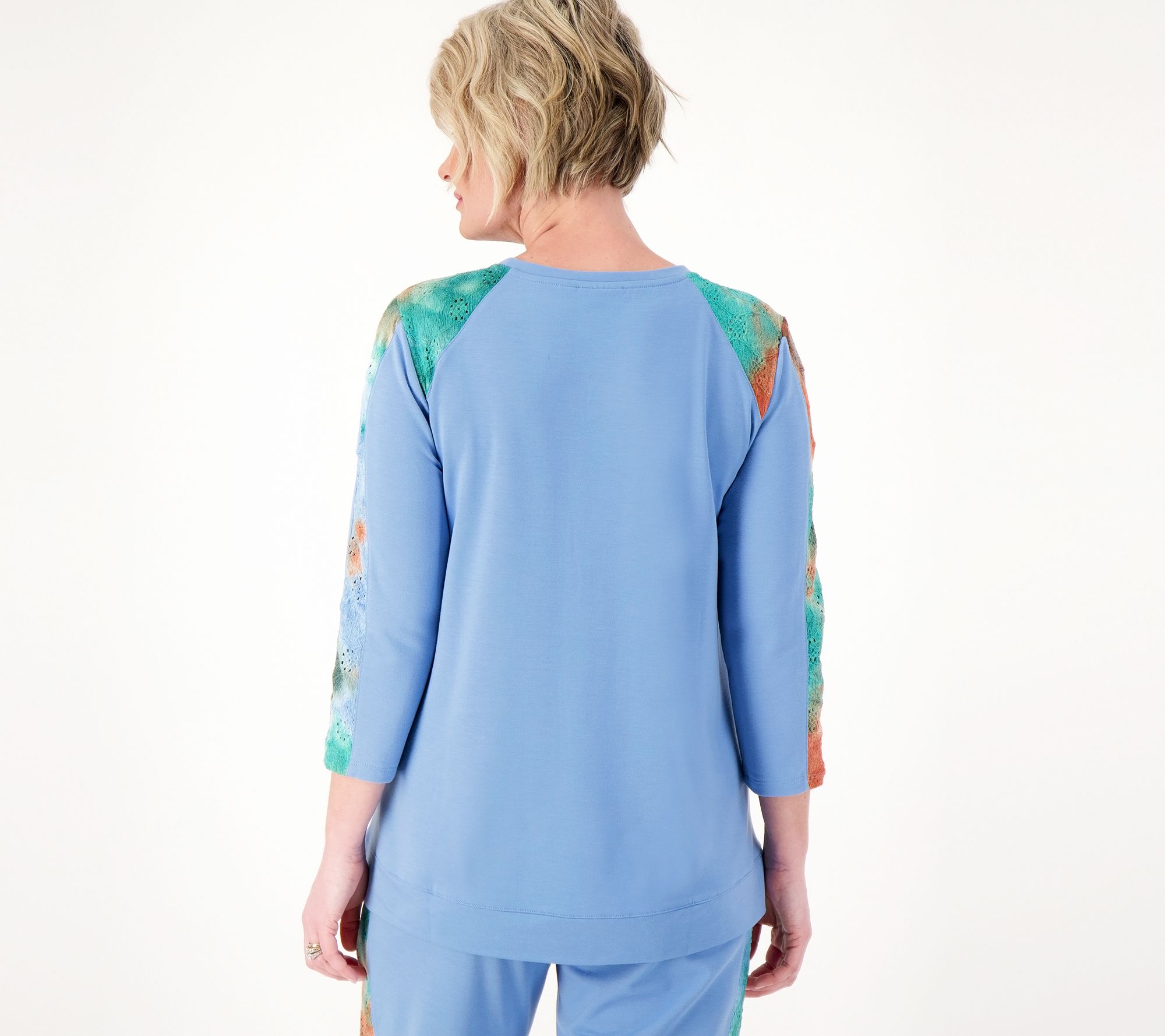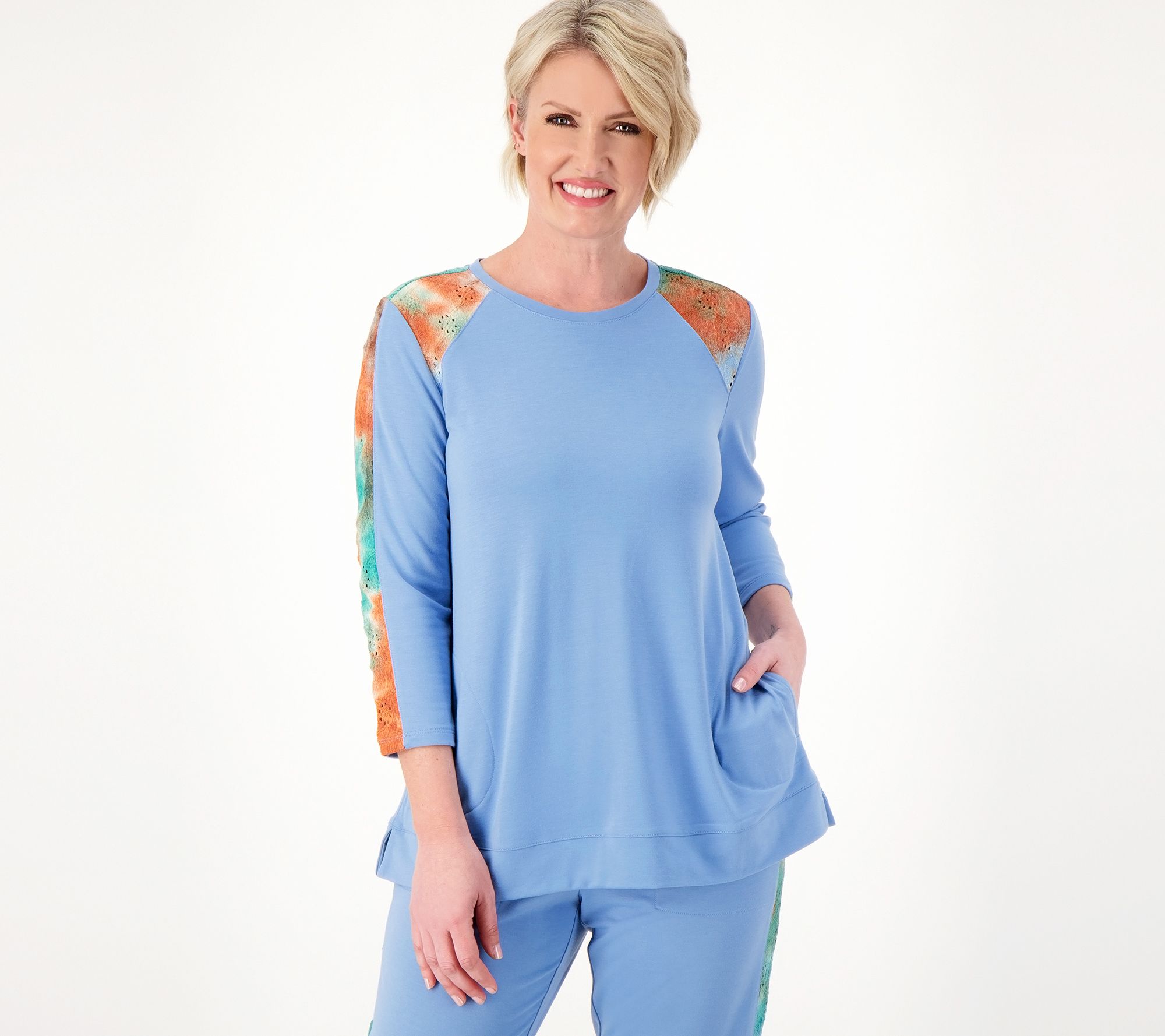 • Features: tie-dyed eyelet fabric, crew neck, 3/4-length sleeves, pullover style, on-seam pockets