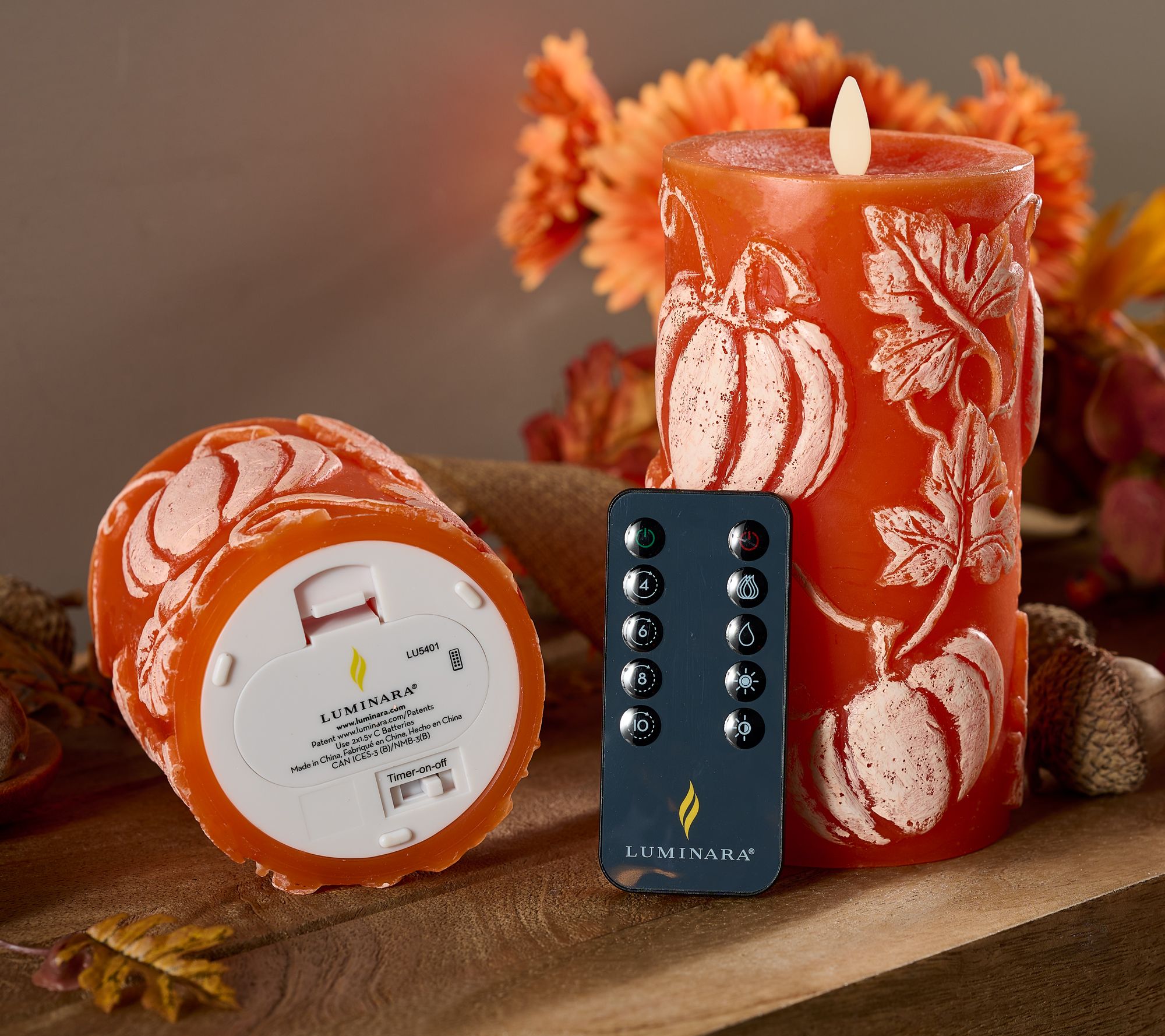 Spice up any room with these flameless candles, embossed with pumpkins to bring the warmth of harvest and fall without the worry of real flames. From Luminara.