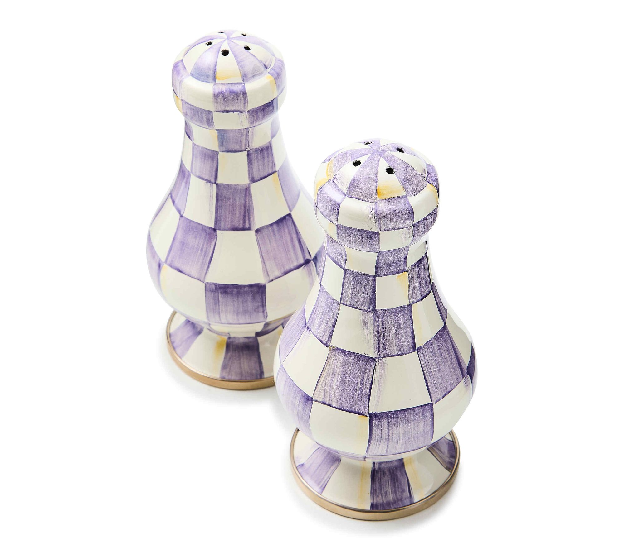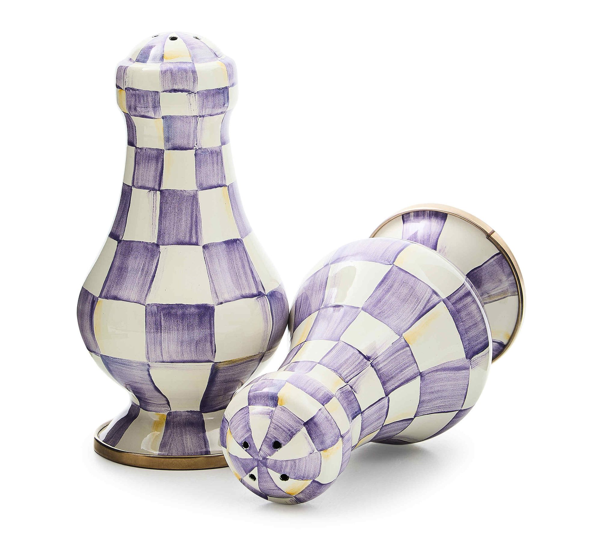 Season every meal in style with these Violet Check large salt and pepper shakers. The eye-catching checks and cheerful colors liven up casual breakfasts and celebratory dinners, making it easy to sprinkle flavor with a sprinkling of elegance. Bring playful charm and convenience to your table setting or kitchen counter. From MacKenzie-Childs.