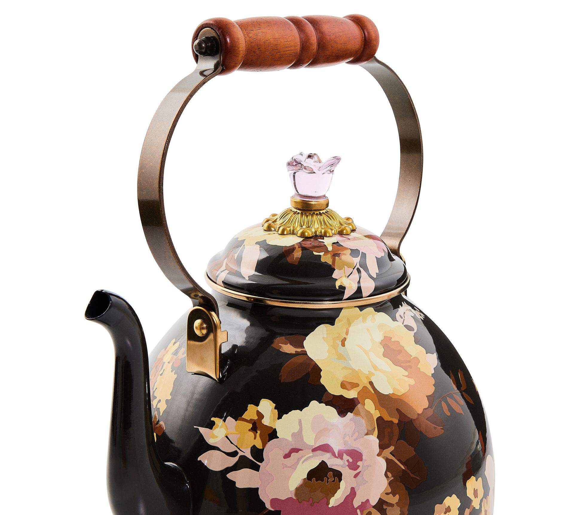 Tea time = me time! Graceful wild rose blooms and bronzed accents bring a beautiful flourish to your daily ritual with this 3-quart enamel tea kettle. Featuring a hand-glazed steel body and a lid with charming glass finial, the piece sets an inviting scene for cozy mornings and peaceful afternoons. From MacKenzie-Childs.