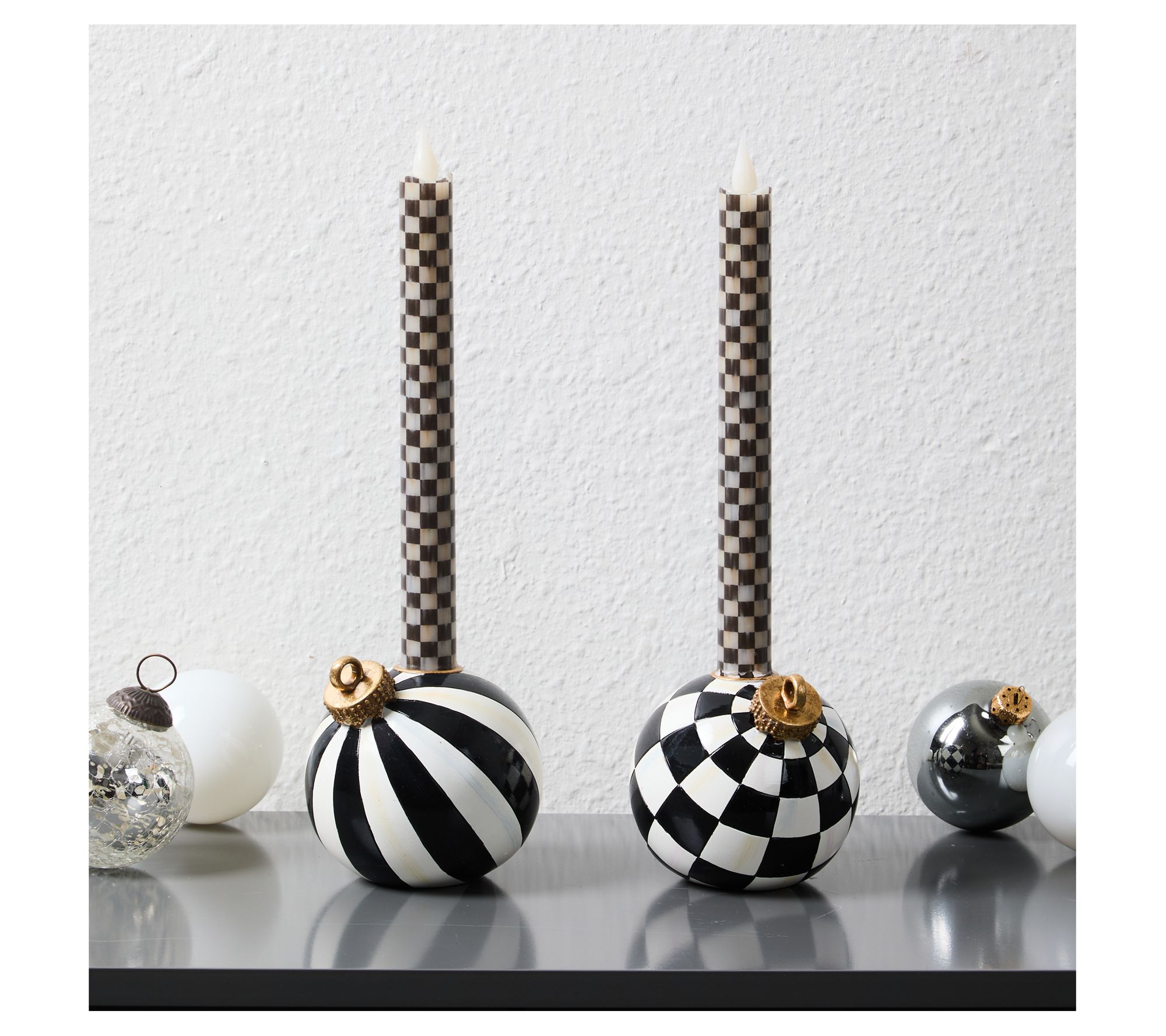 Holiday tables, mantels, and entryways find extra cheer when they're dressed up with these charming ornament candle holders topped with warm, flickering tapers -- no flame required. Style the pair together for a coordinated seasonal display or spread them around your home for double the festive sparkle all season long. From MacKenzie-Childs.