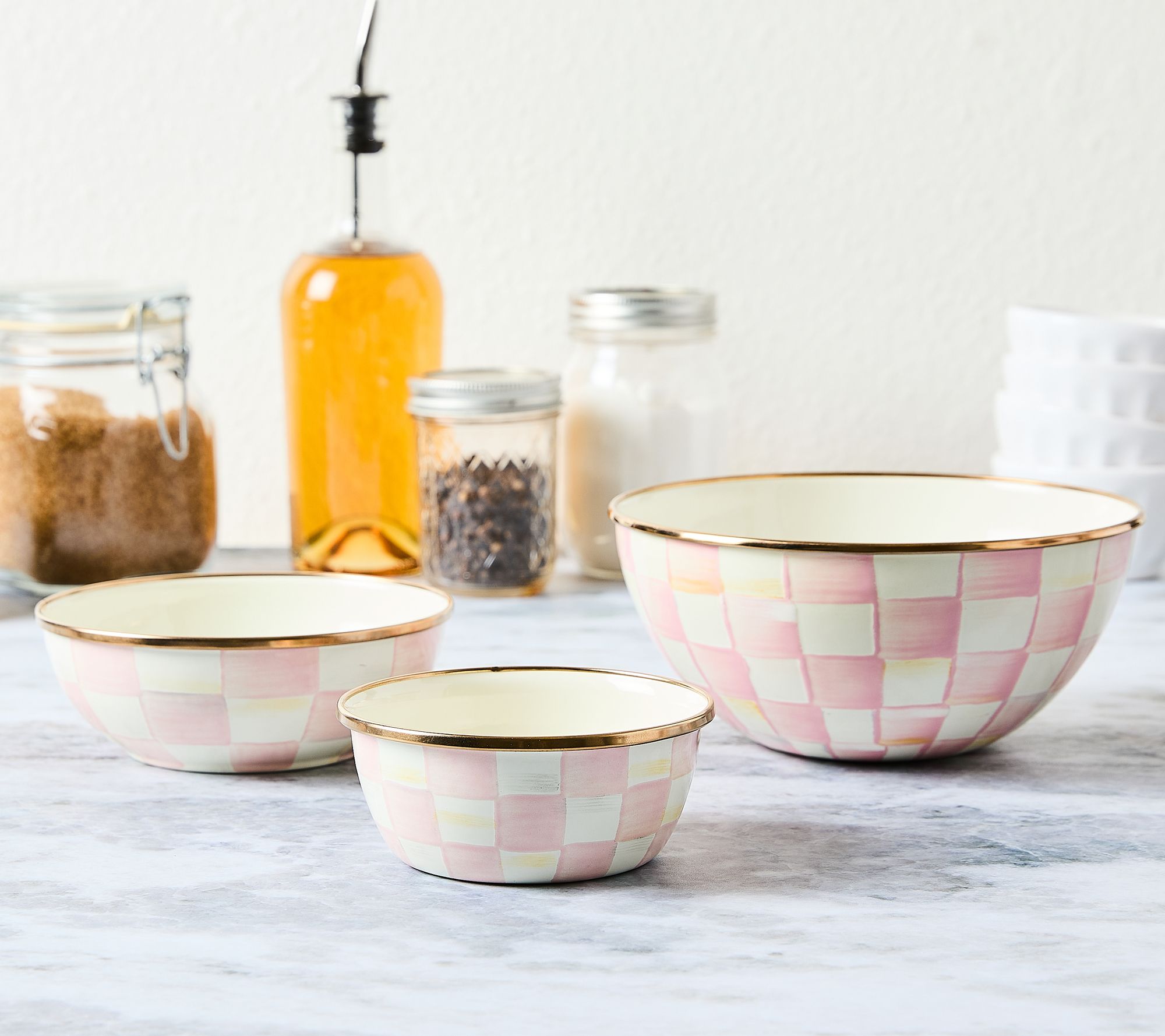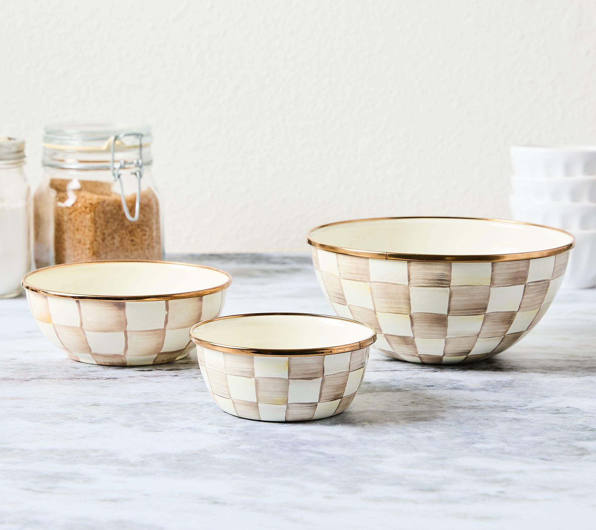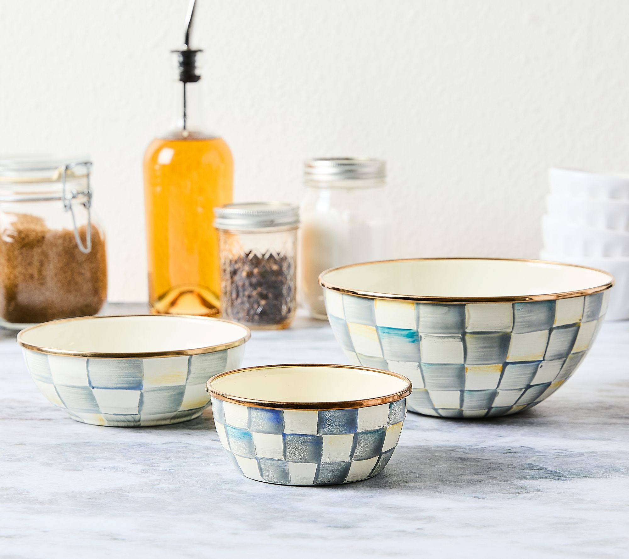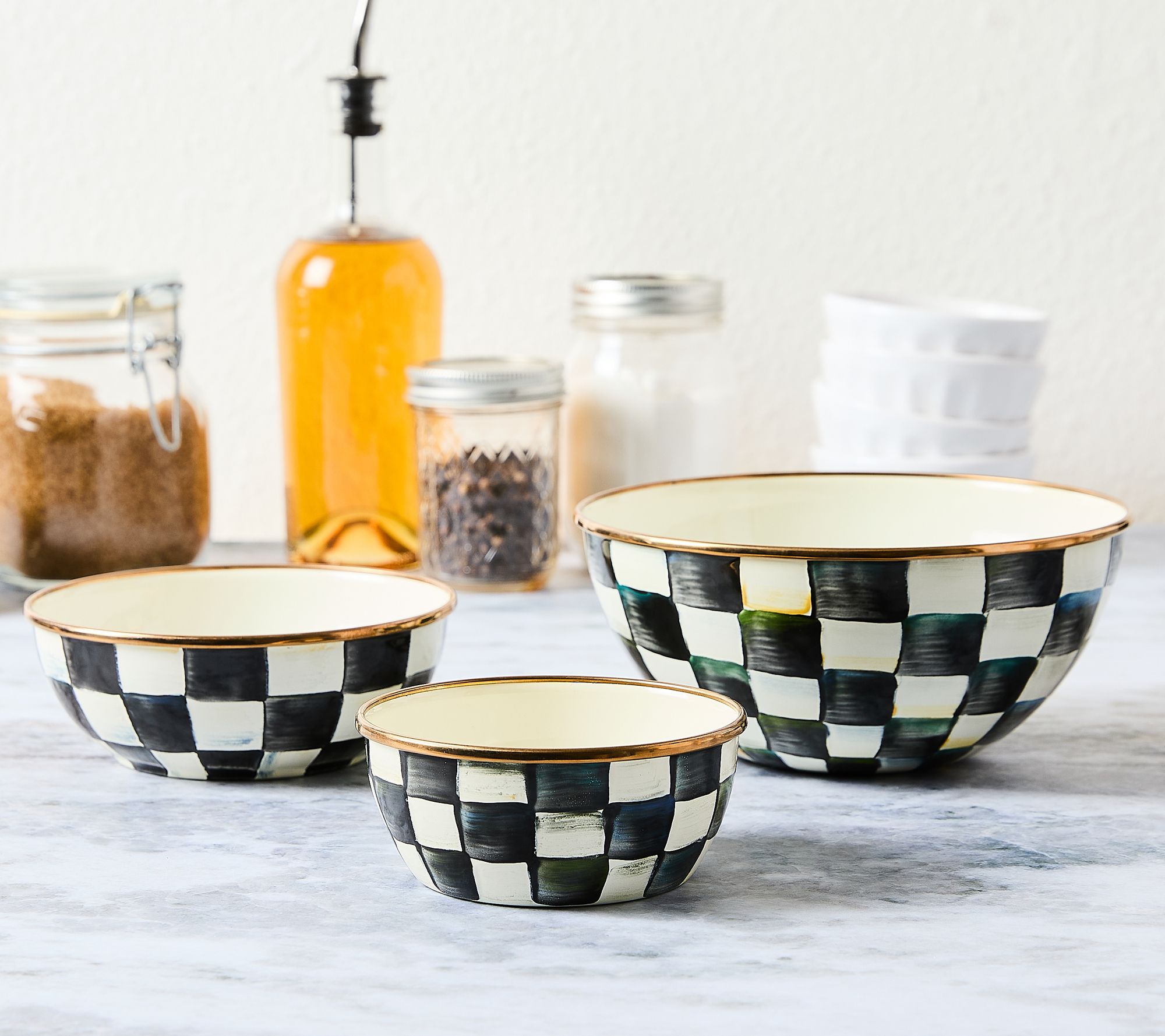 Brighten up meal prep with this delightful set of three Mackenzie-Childs everyday bowls. With their stunning hand-painted checks and floral decals, these bowls bring a touch of artistry to routine kitchen tasks. Perfect for mixing, serving, or displaying, these bowls make every meal a celebration of color and craftsmanship. From Mackenzie-Childs.