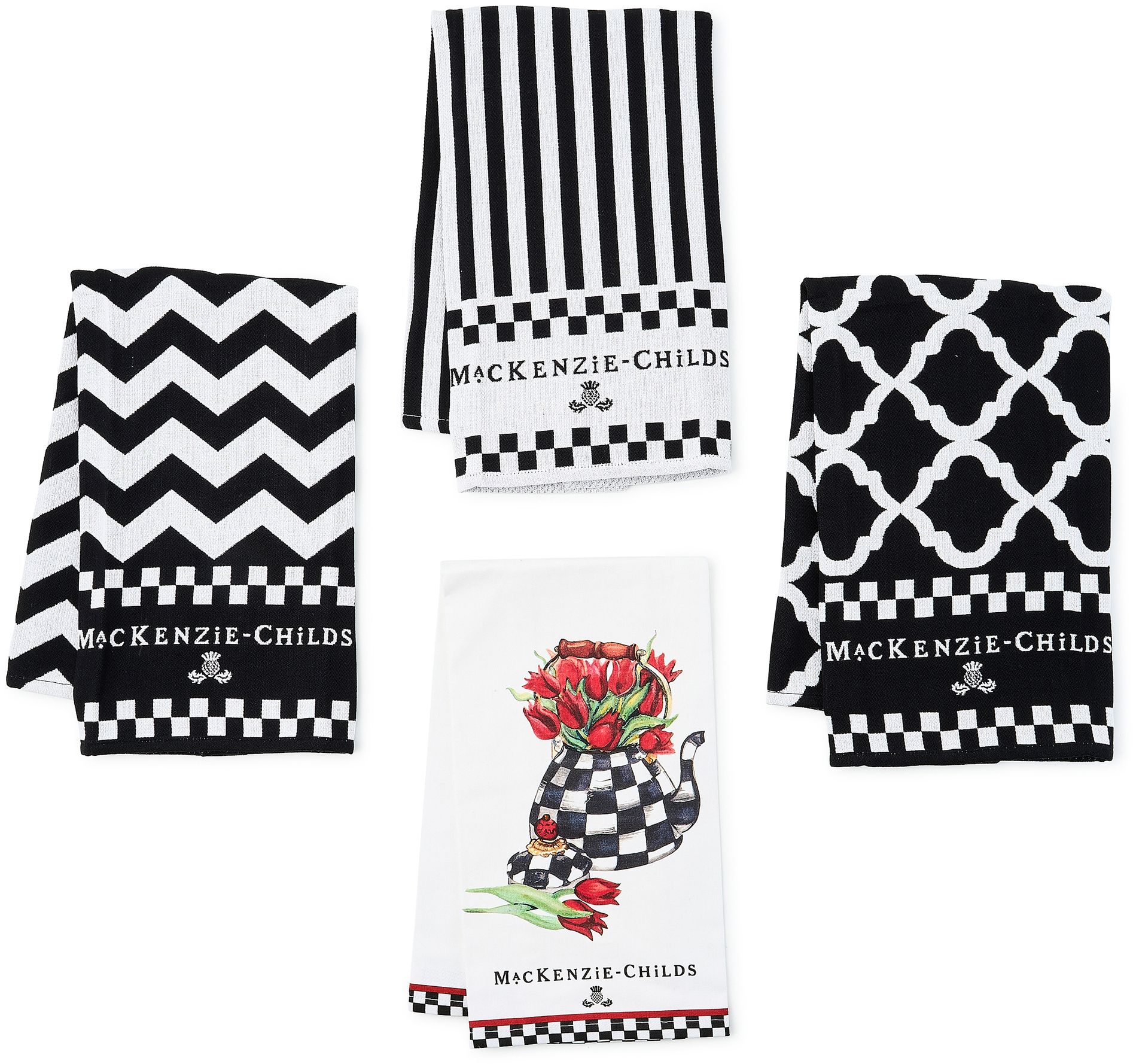 Add whimsy to your kitchen with this delightful set of four dish towels from MacKenzie-Childs. Perfect for drying dishes or adding decorative flair to your space, these towels feature fun woven patterns and the MacKenzie-Childs logo. Make everyday tasks a bit more cheerful and stylish. From MacKenzie-Childs.