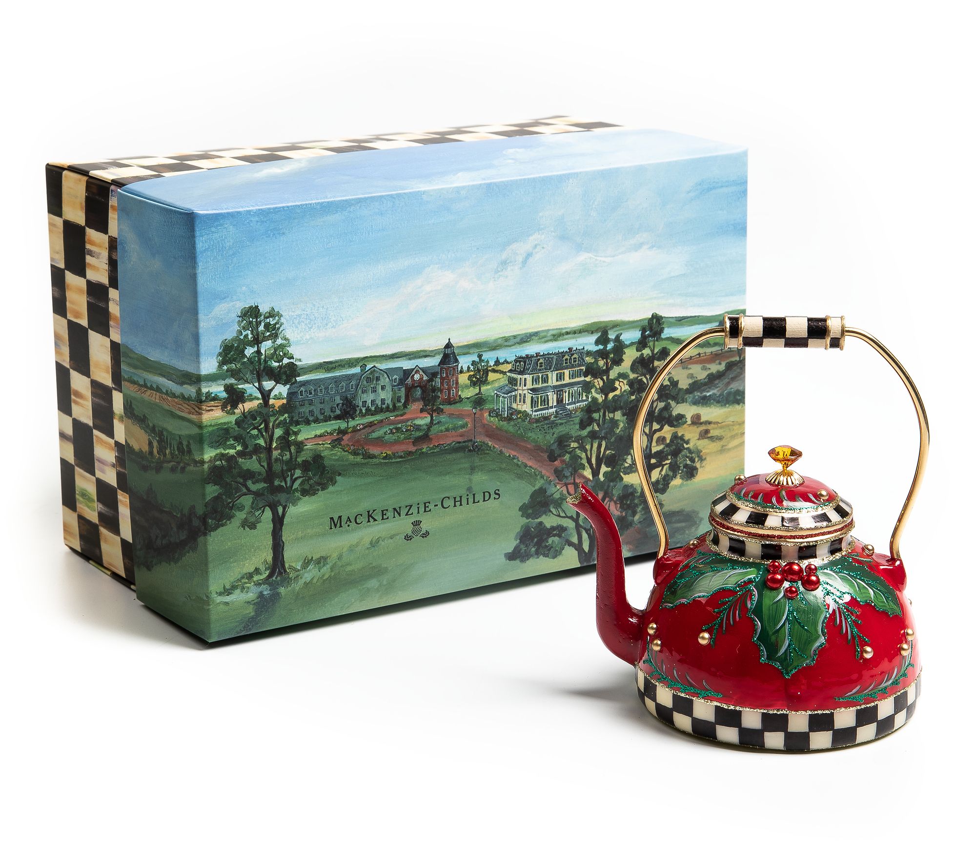 Add a whimsical charm to your tree with this MacKenzie-Childs tea kettle glass ornament, complete with a brass logo charm for a touch of elegance. Whether you display it among twinkling lights or use it to decorate your kitchen, it brings a festive farmhouse accent to your seasonal celebrations. From MacKenzie-Childs.