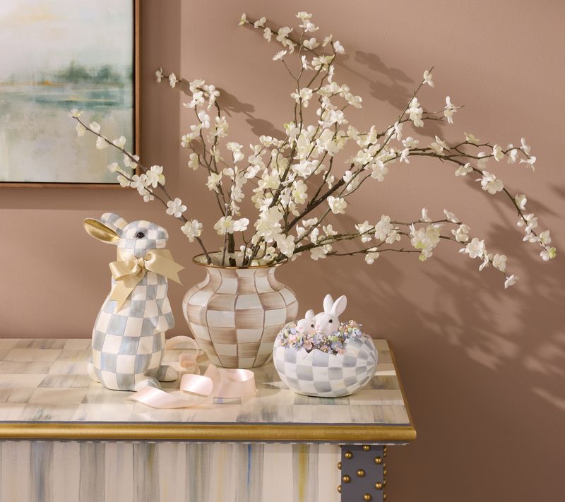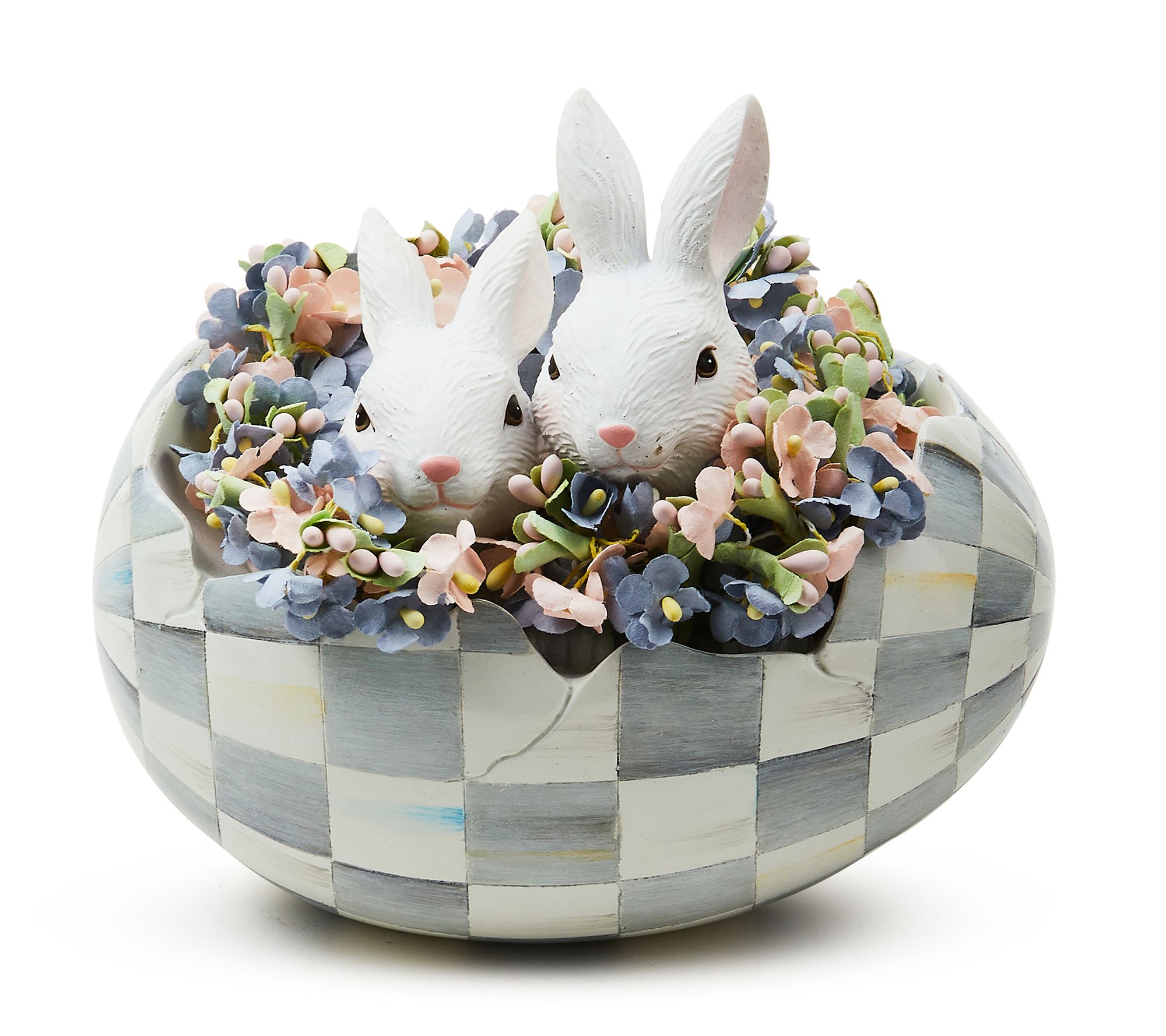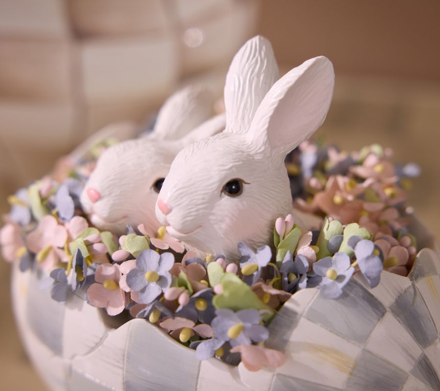 Look what just hatched in time for the Easter holiday?! A pair of precious bunnies playing a game of peekaboo. Mixing a modern checked design, cute creatures, and exquisite artistry, this eye-catching egg is sure to be adored by all, so make sure it gets a prominent place in your home! From MacKenzie-Childs.