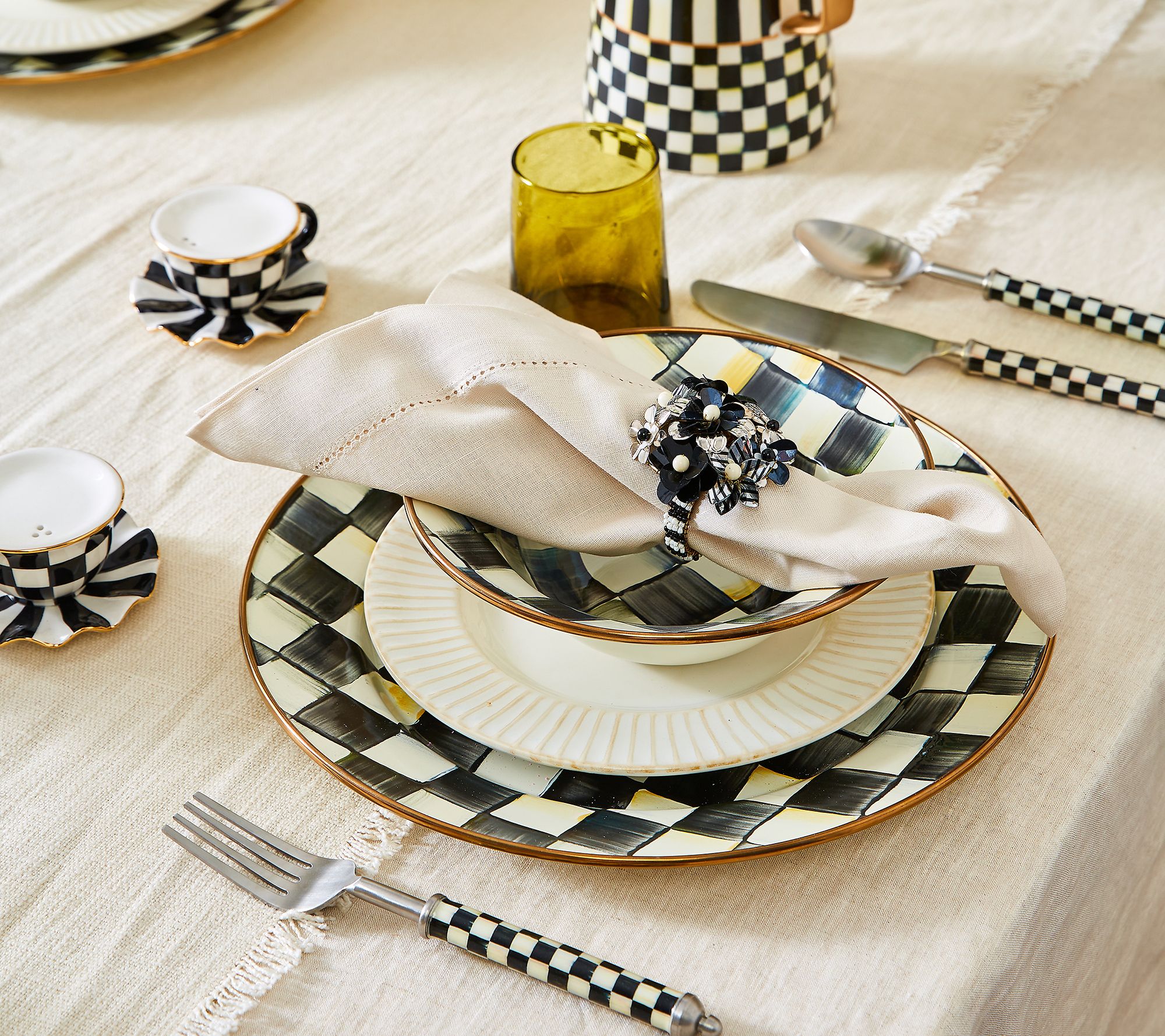 Add a delightful touch to your dining experience with this charming salt and pepper set. The ornate design effortlessly enhances any table setting, making meals feel extra special. From MacKenzie-Childs.