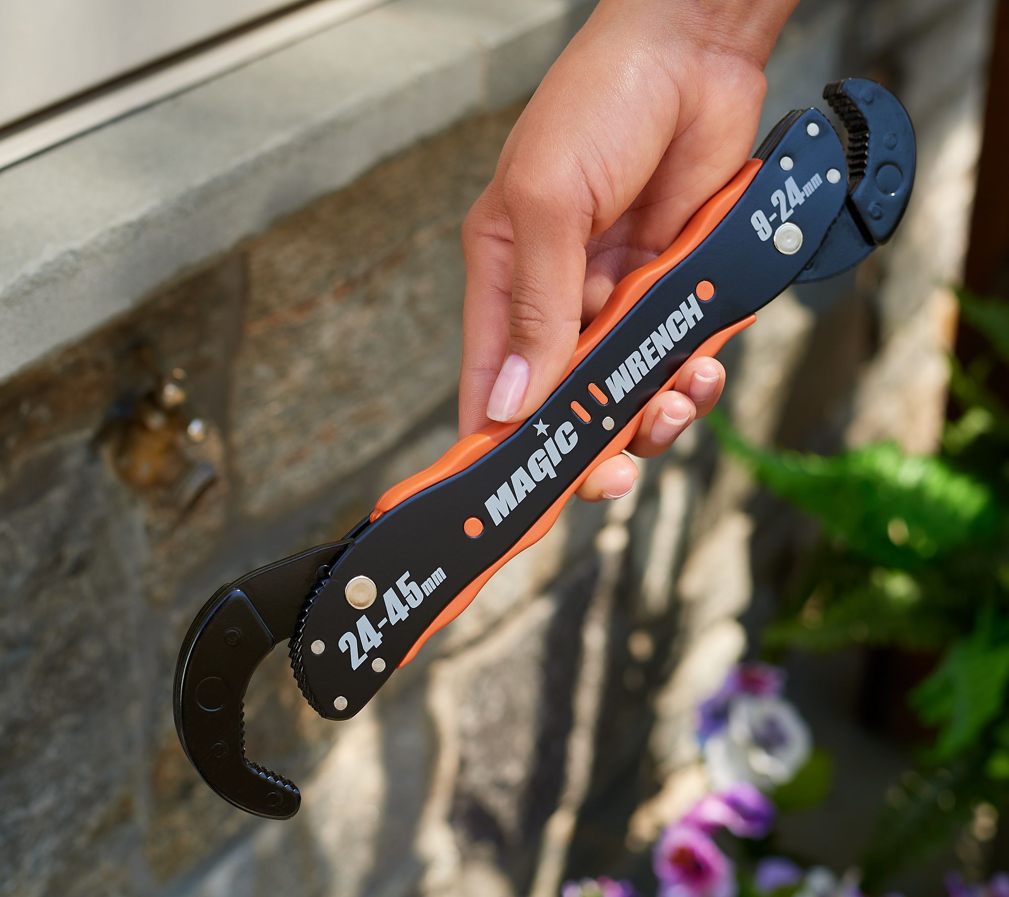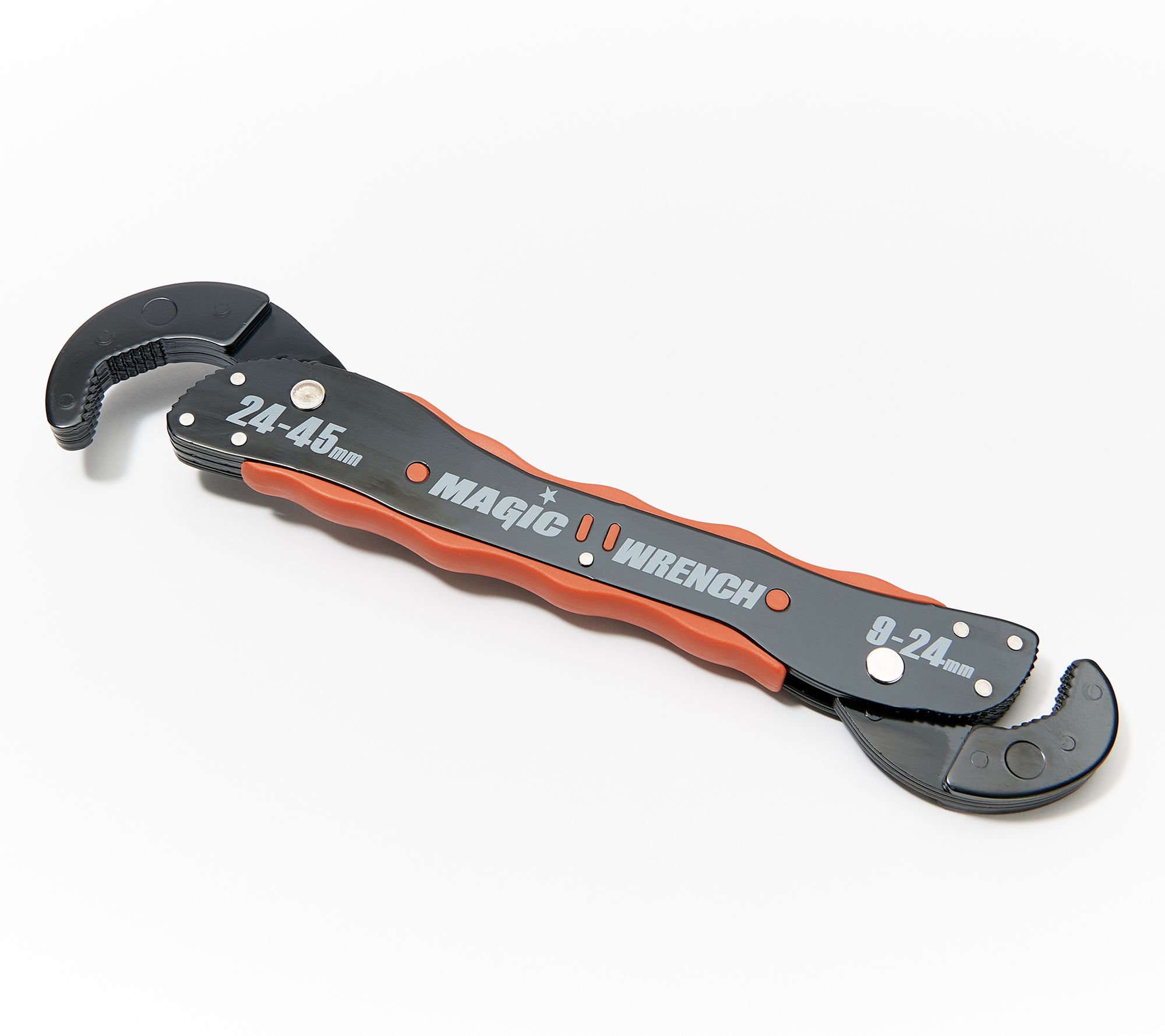 Leave your wrench set in the tool box! The one-stop Magic Wrench has two sides that adjust from 9mm at the smallest to 45mm at the largest. The three-point grip jaws with anti-slip teeth can even grab stripped nuts and twist them off when it's time to replace them.