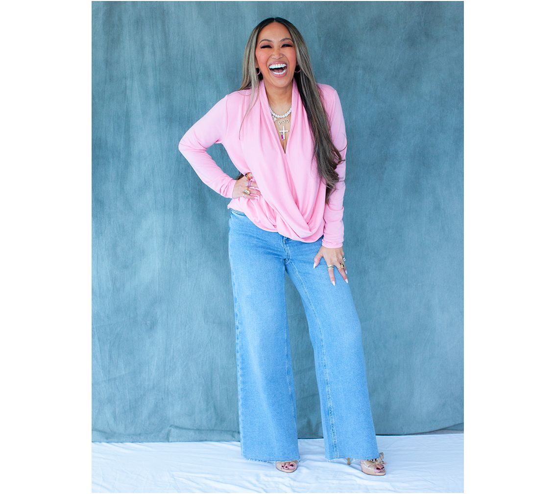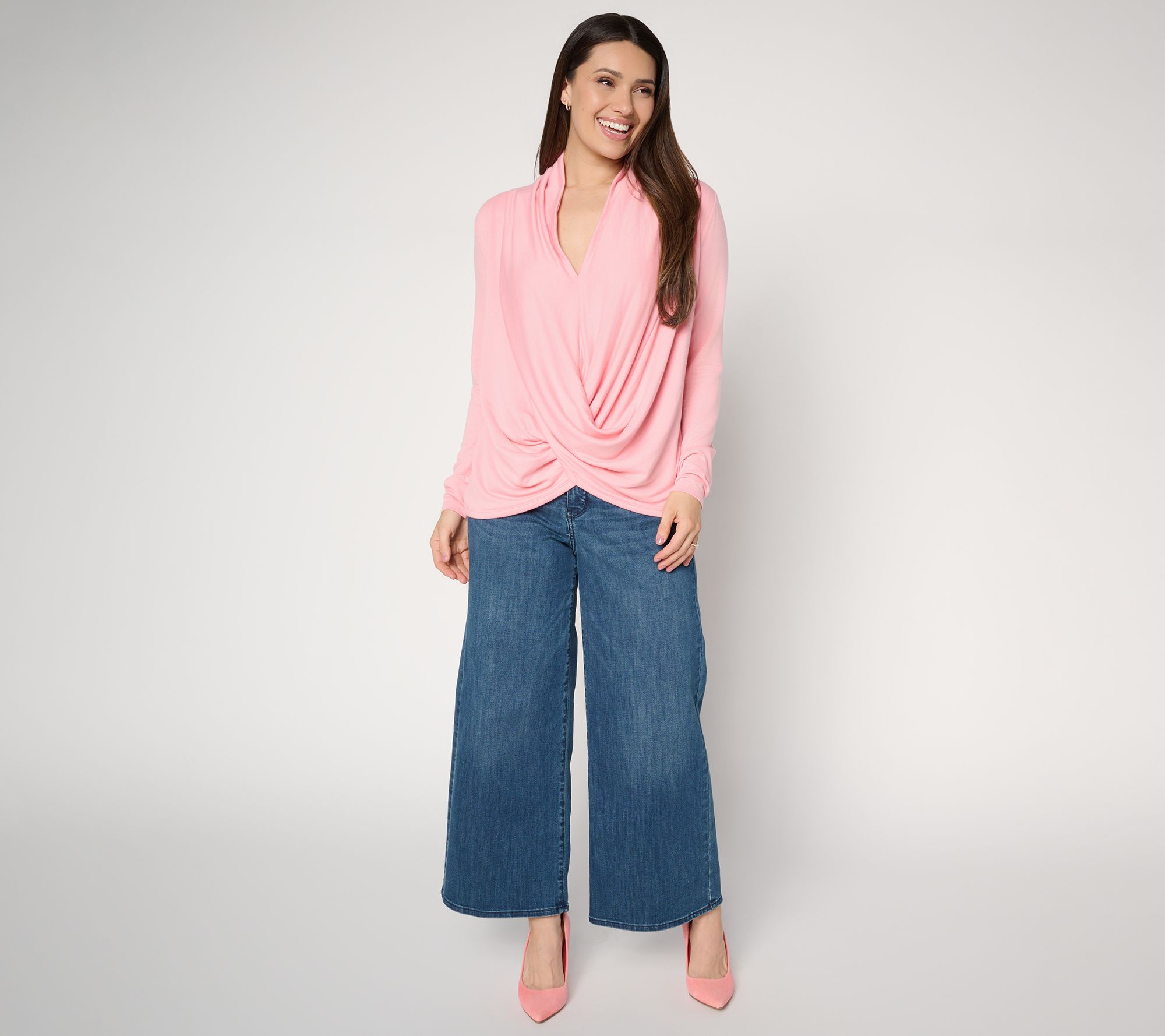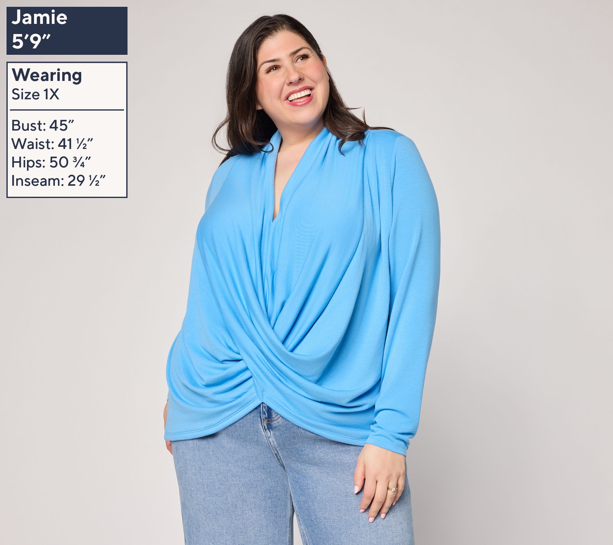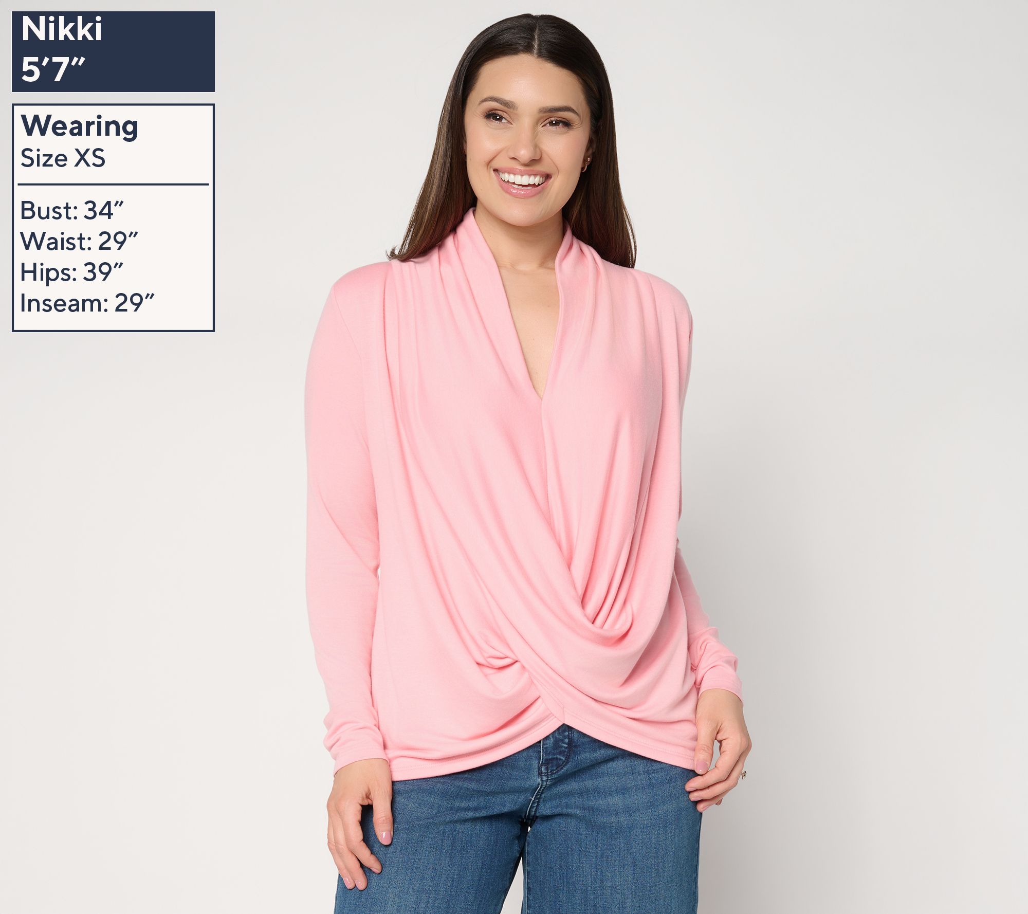 Soft jersey knit and thoughtful draping combine for an effortless style that works for busy days or evenings out. The long sleeves and graceful crossover detail at the neckline add sophistication, while the comfortable fit keeps you at ease all day. From Mally Roncal.