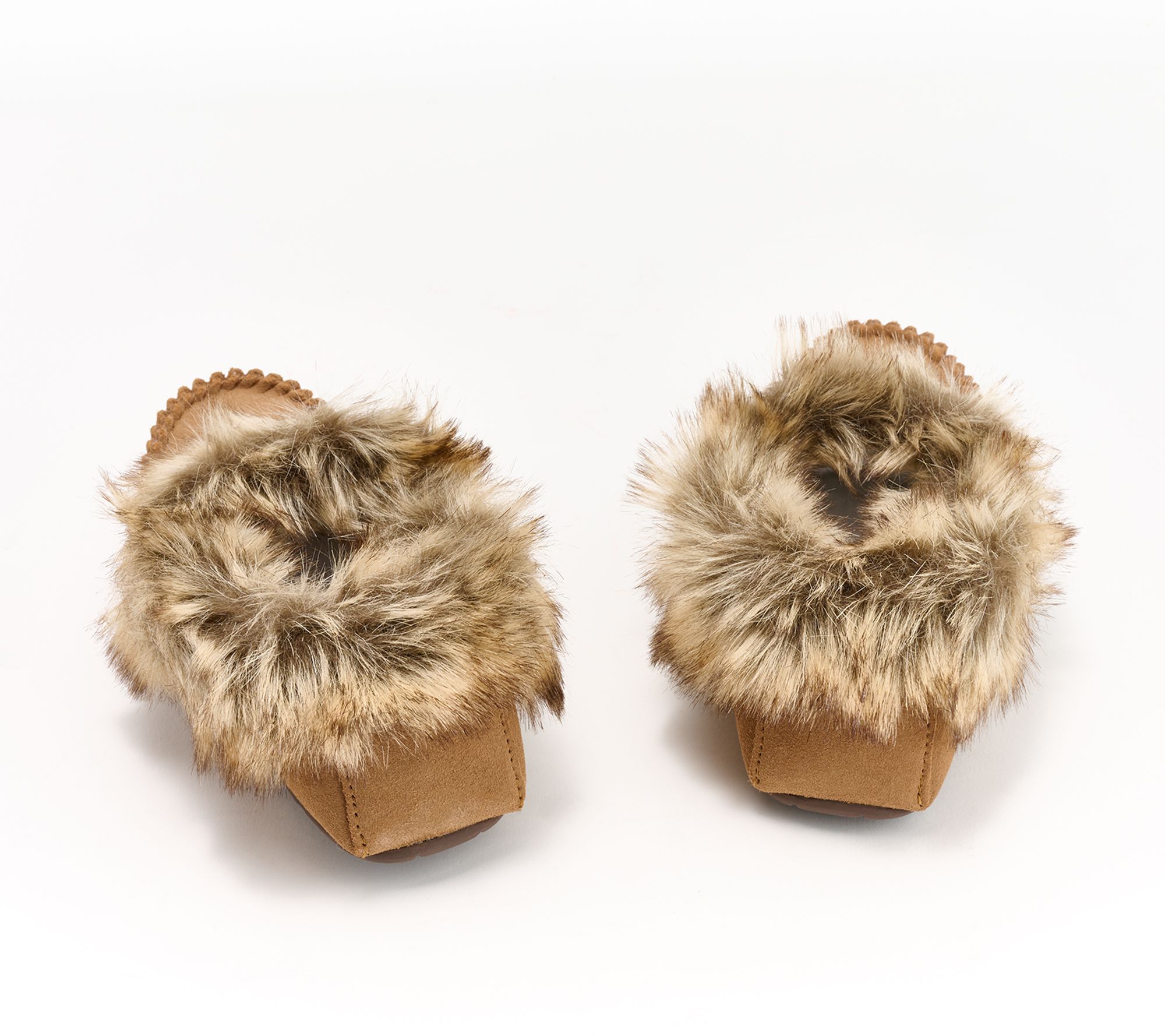 • Suede upper, faux-fur collar, beaded vamp