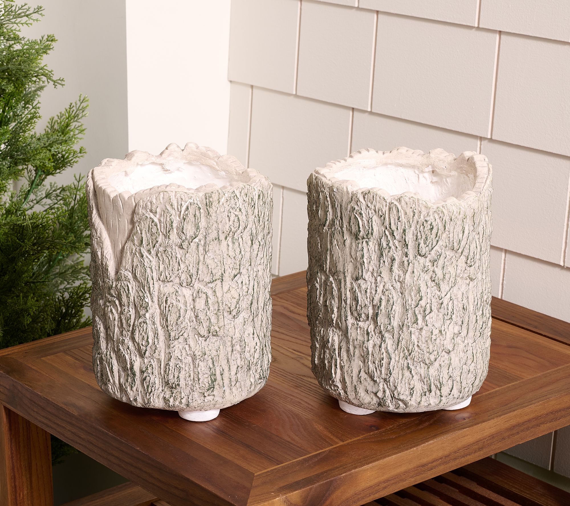 Turn leafy greens or colorful blooms into a striking statement with this set of two faux bois planters. Their textured finish and classic silhouette beautifully accent a patio, balcony, or sunroom, making it easy to refresh your favorite spaces with stylish charm. From Martha Stewart.