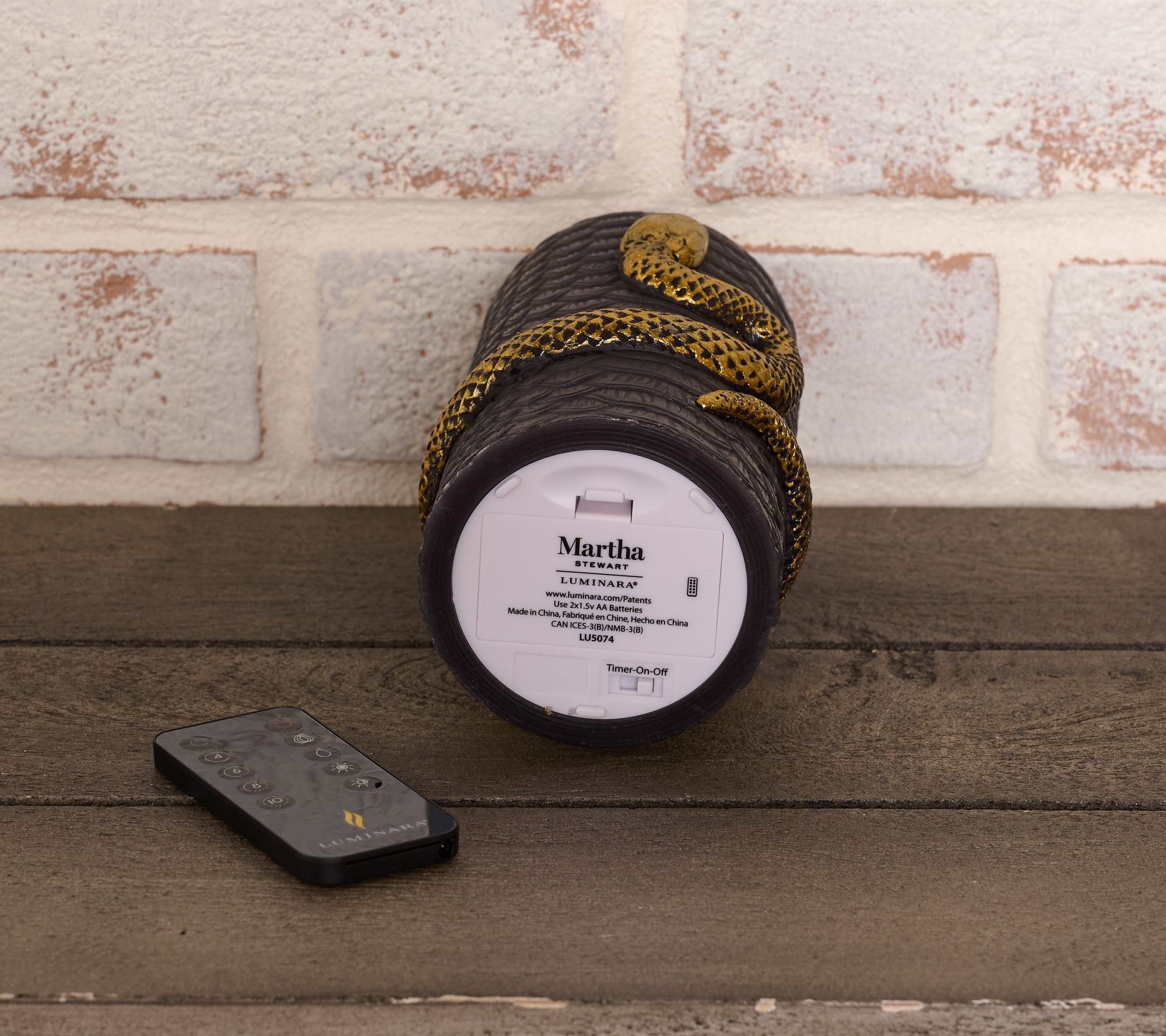 • Includes two snakeskin-embossed flameless pillar candles with metallic snake design and remote