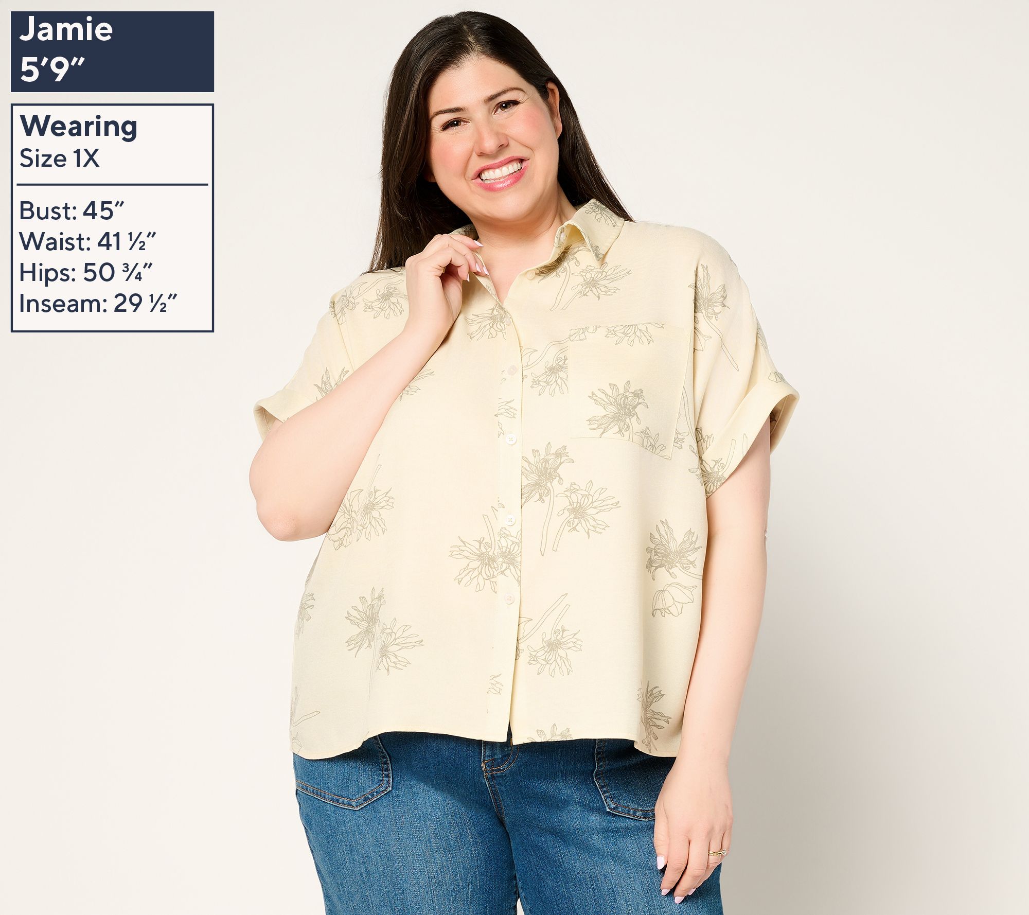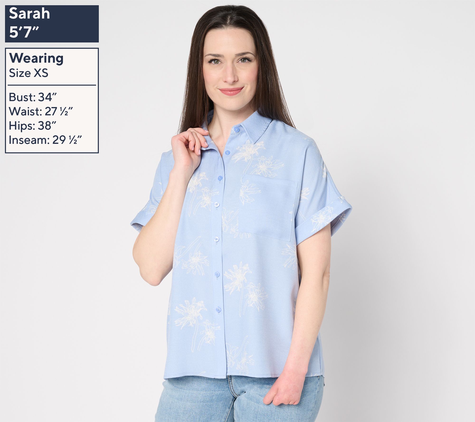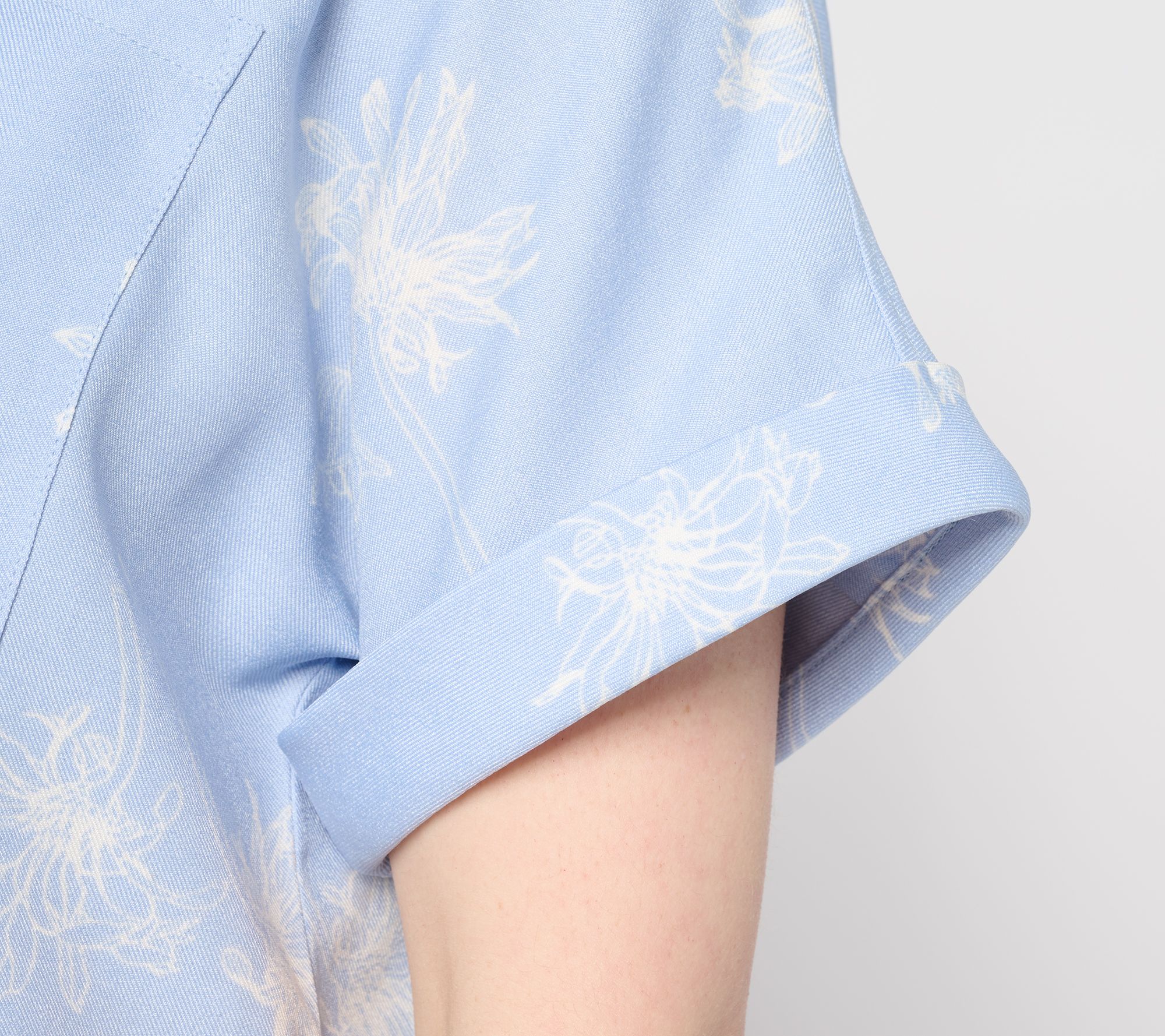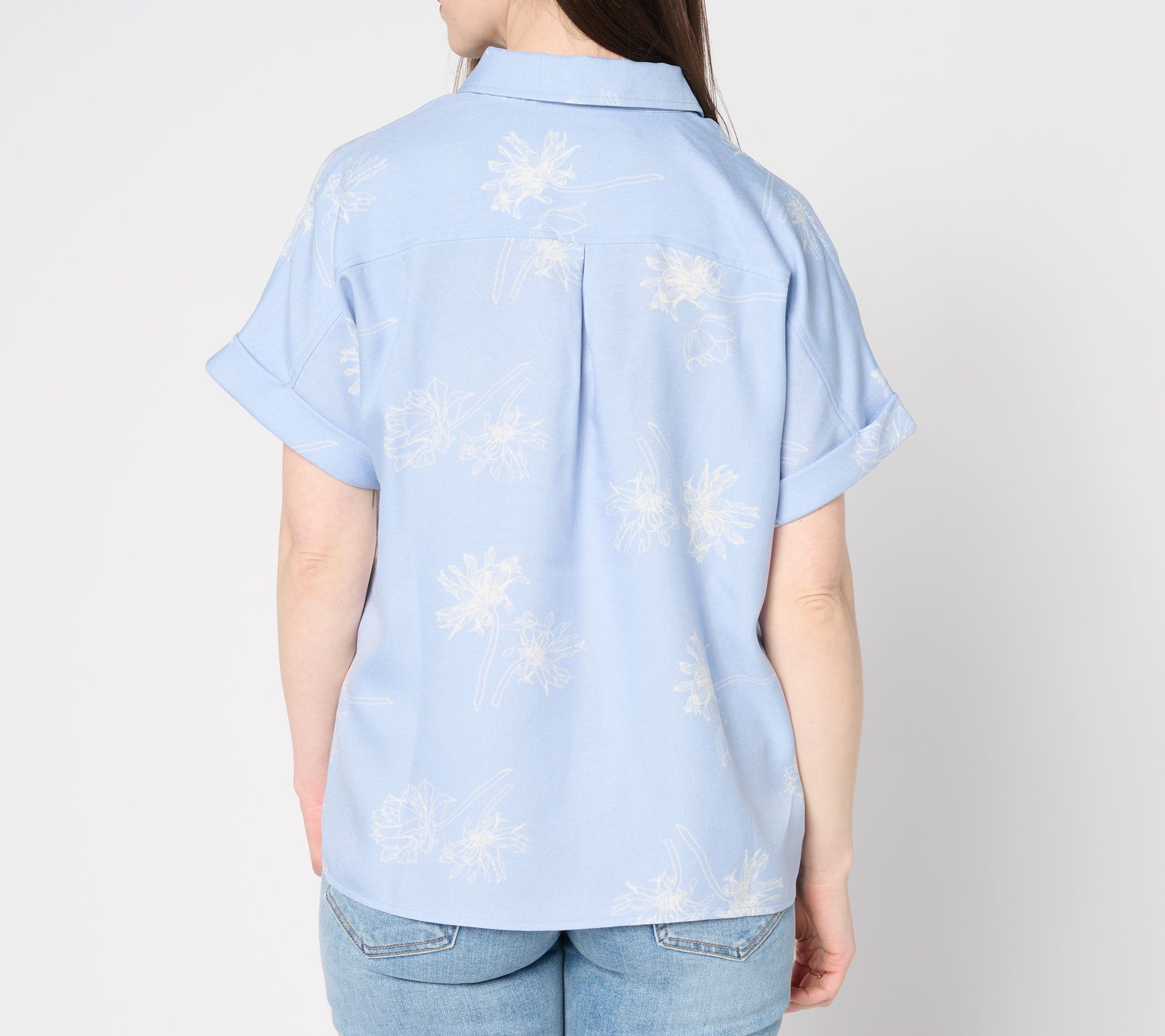 • Features: printed design, button-front closure, short roll sleeves, chest patch pocket, slightly curved hem