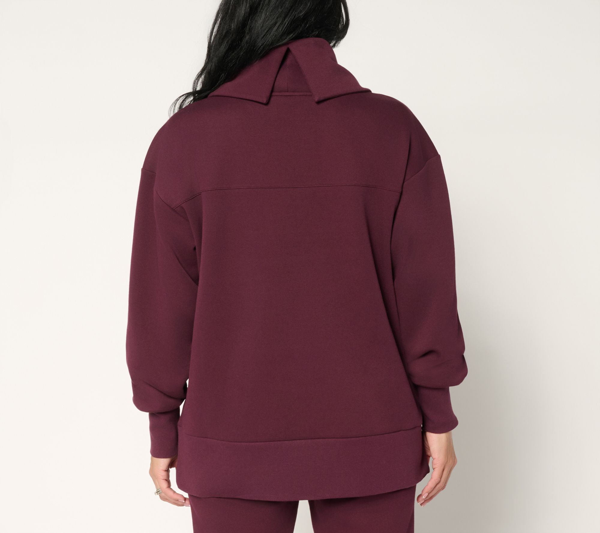 • Features: tunic length, dropped shoulders, front and back yoke detail, structured cowl neck with back slit