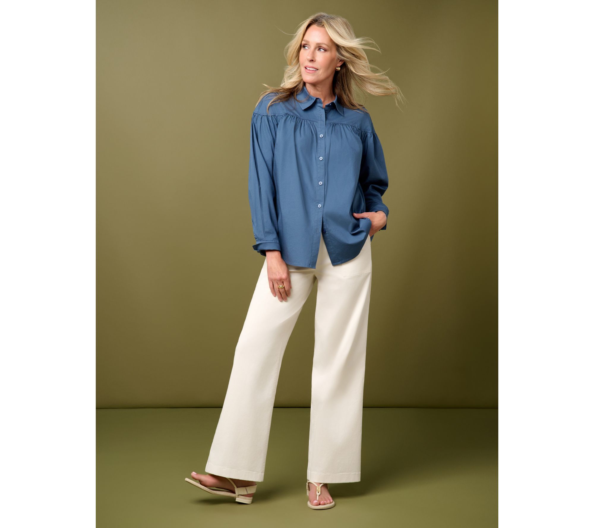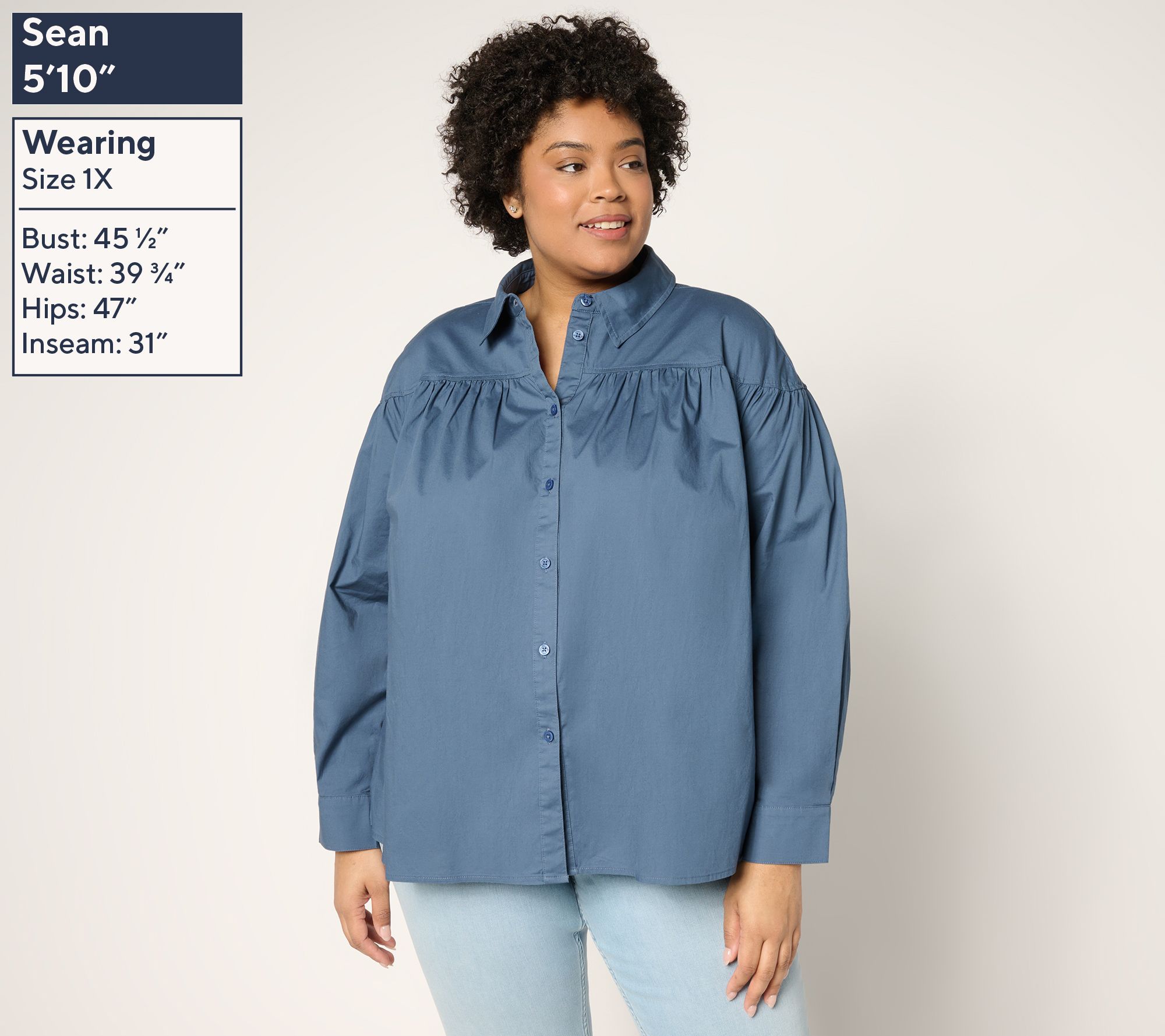 • Features: collared, button front, shirred yoke, pleats at sleeve seam, shirt-tail hem