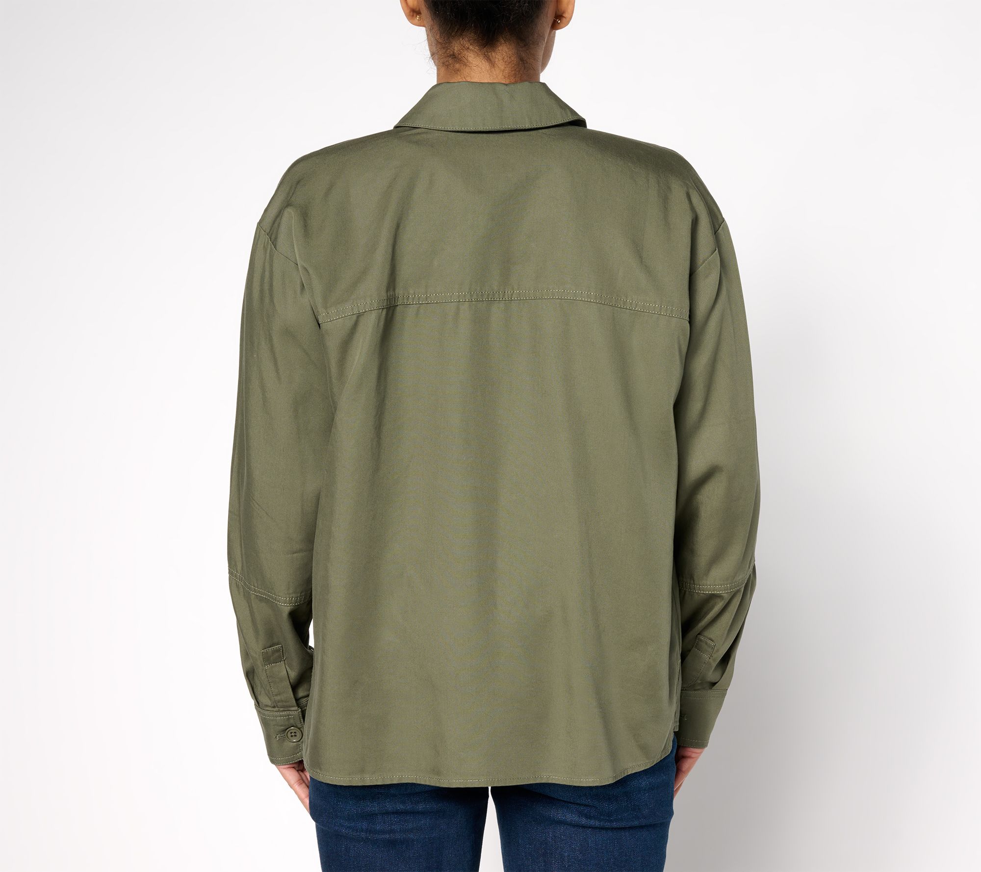 • Features: button-front closure, long sleeves with button cuff, forward shoulder seams, front patch pockets, side slits