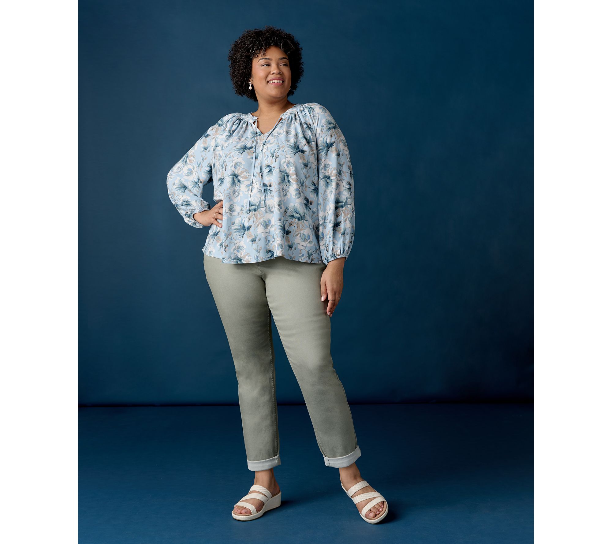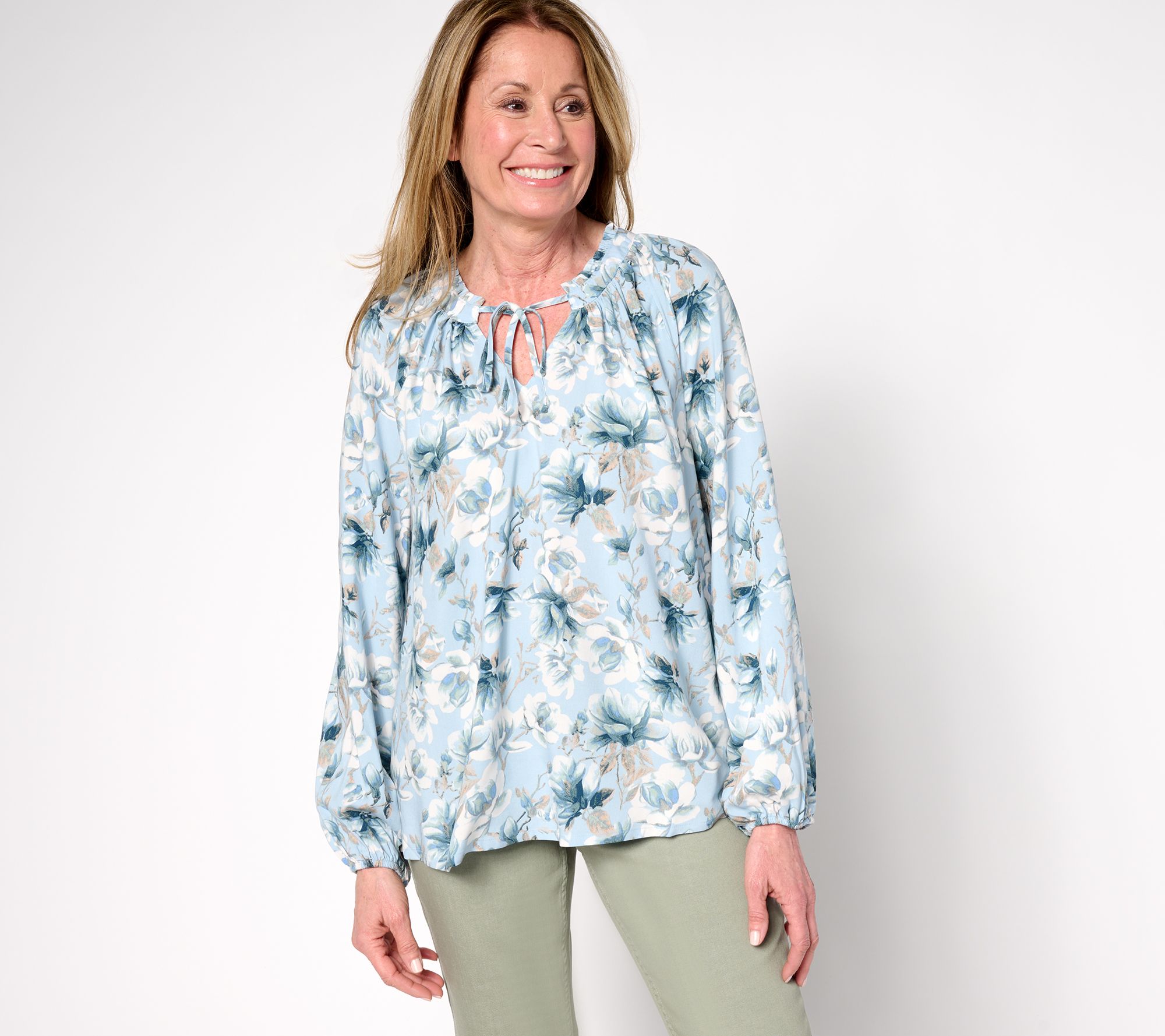 A ruffled collar and balloon sleeves offer a charming touch to this peasant blouse, while the relaxed fit allows for a comfortable fit. Pair it with your favorite jeans or shorts for a chic, versatile look. From Martha Stewart.