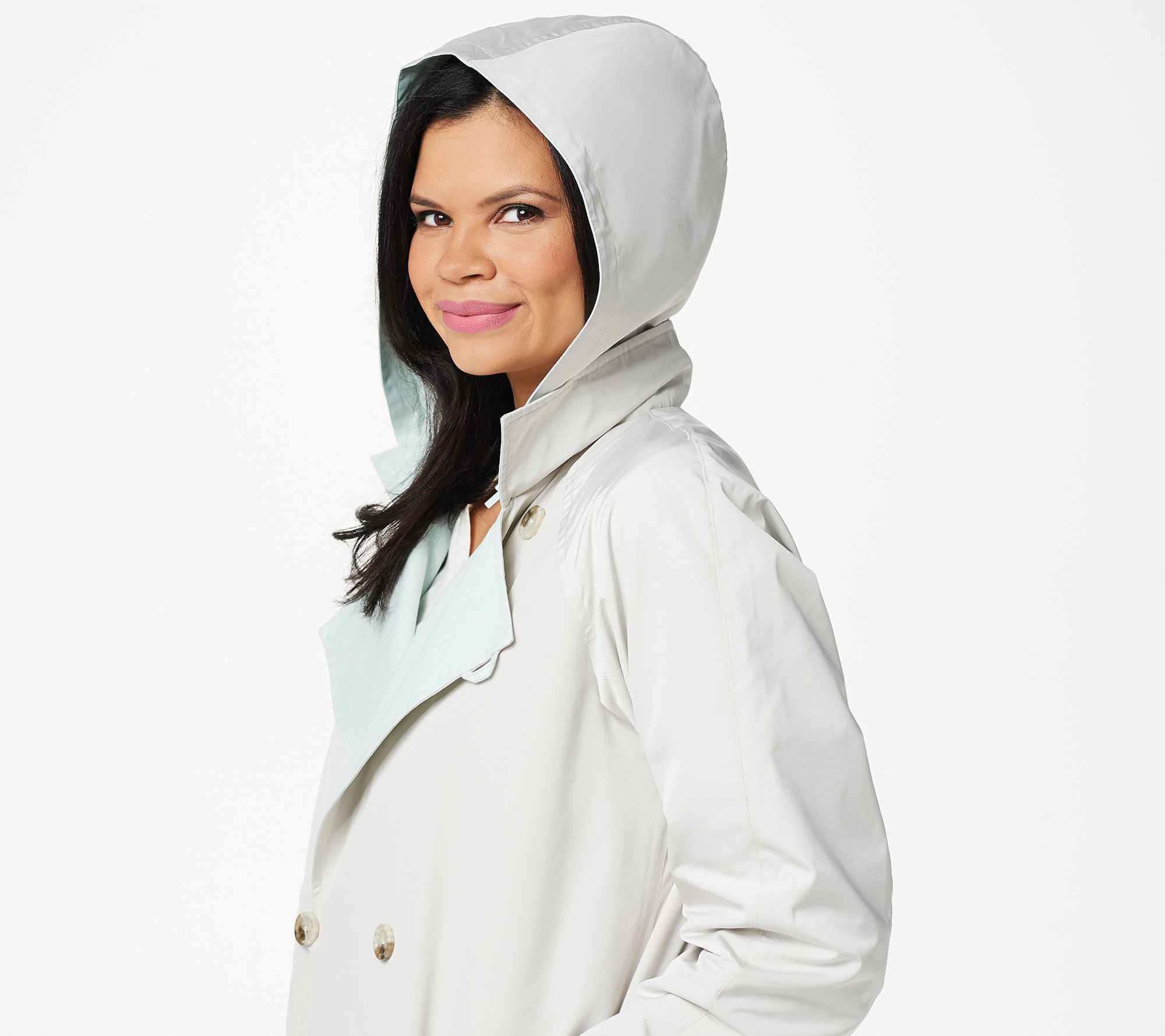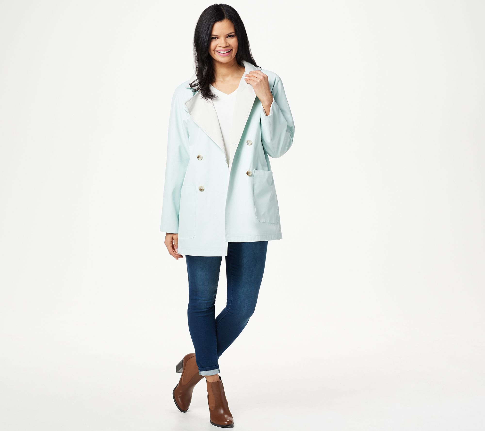 Martha Stewart water resistant, reversible, coat, removable zipper hood, long sleeve, 2 front functional large patch pockets, double breasted button front closure, center back seam detail. Relaxed-Fit:Generously cut with maximum wearing ease. Length:Missy Range:31 1/2"-33 5/8". Plus Range:34"-35 3/4". Content: Shell: 63% Cotton/37% Nylon. Reverse: 100% Polyester. Care: DCO. Imported. (S). "As Is" Item See A351690