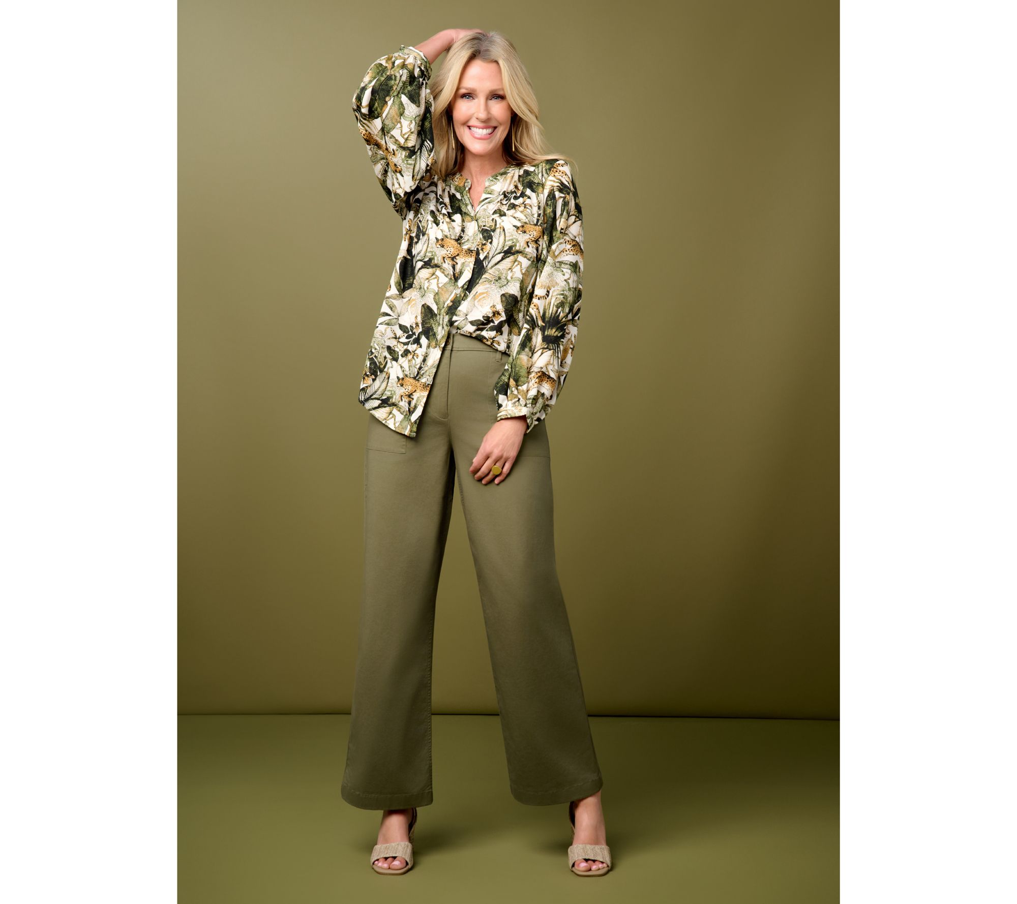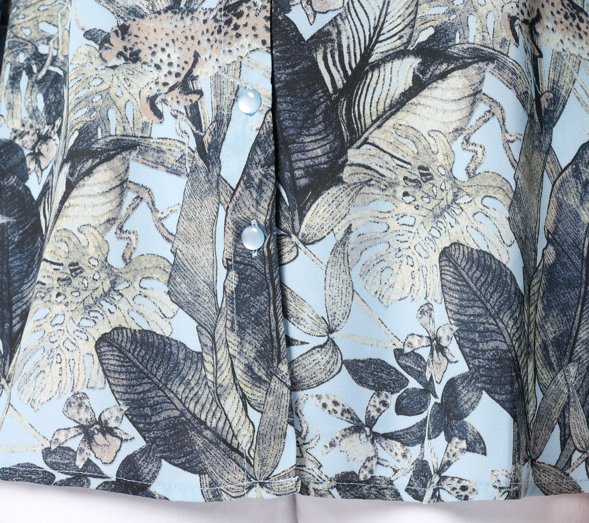 • Features: split V-neckline, functional button-front closure, bracelet sleeve cuffs, shirring at neck