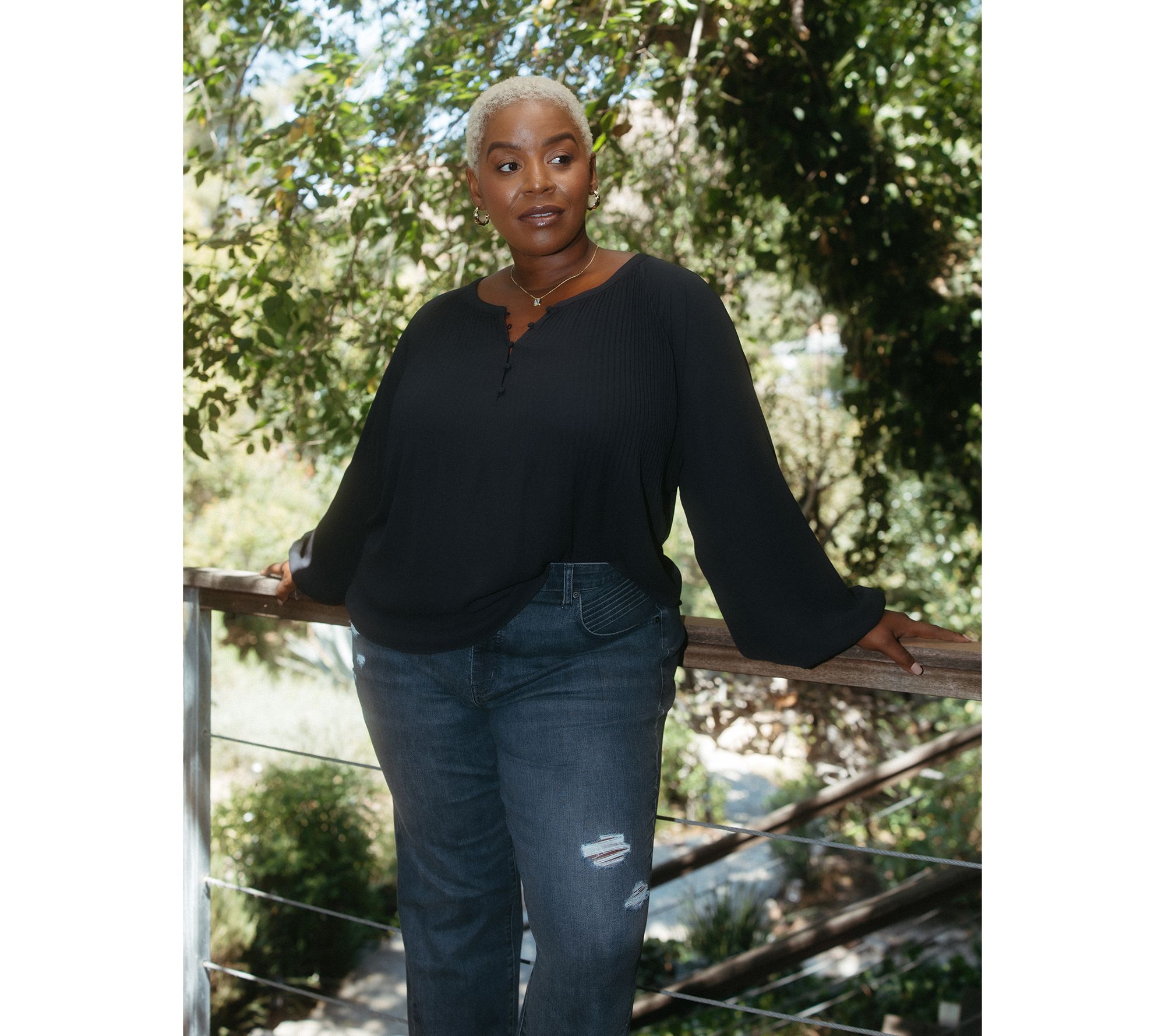 A breezy woven blouse like this pairs effortlessly with slacks for the office or adds a touch of polish to your weekend plans. Expertly finished details like pleats at the bust, a band neckline, and a henley placket with covered buttons make it easy to dress up or down for any occasion. From Me by Jennie Garth.