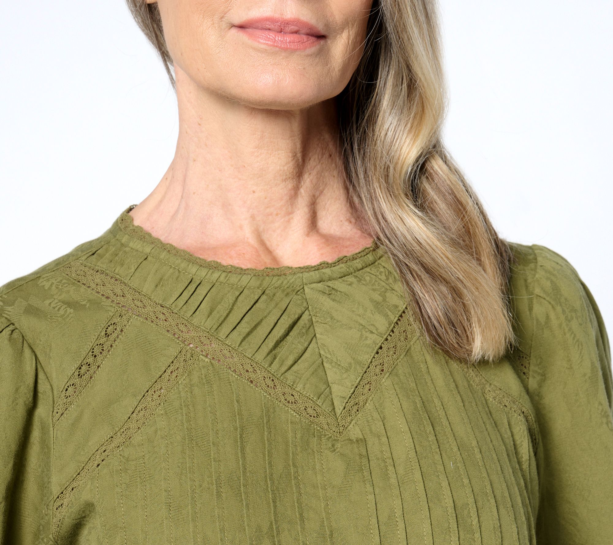 Intricate lace inserts and pintuck details give this blouse the feminine flair you love. Dressed up or down, it provides a flattering fit that makes it an instant favorite. From Me by Jennie Garth.